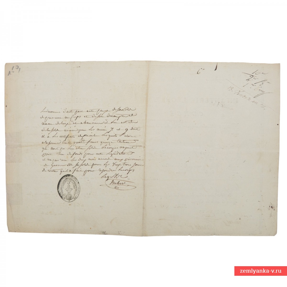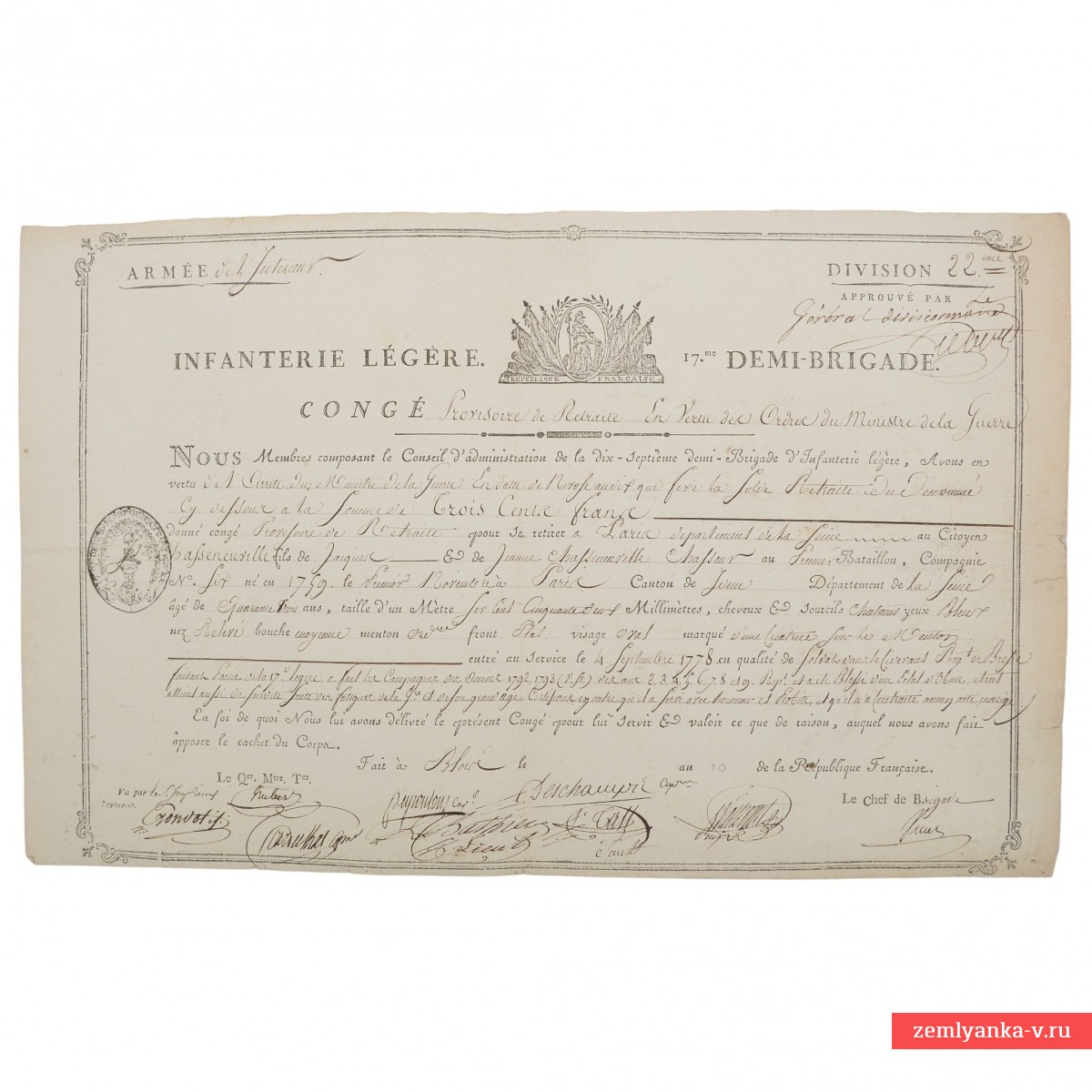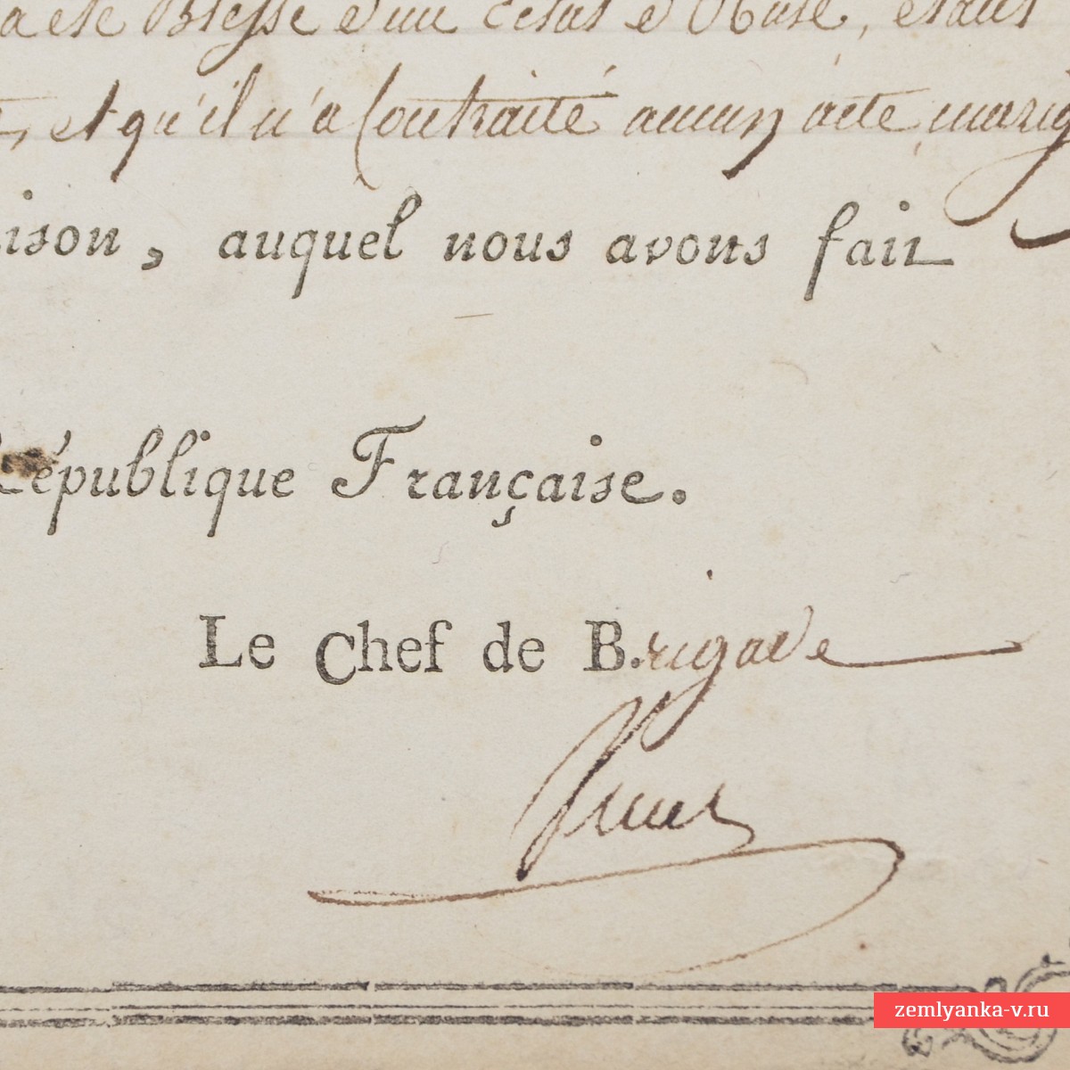 An original and quite rare document from the era of the Consulate of Napoleon Bonaparte in very good collector's condition. Verge paper, typographic printing. Watermarks. Signed by the brigade commander and officers. The sheet size is 253*398 mm. The bend in the center. Guarantee of authenticity.