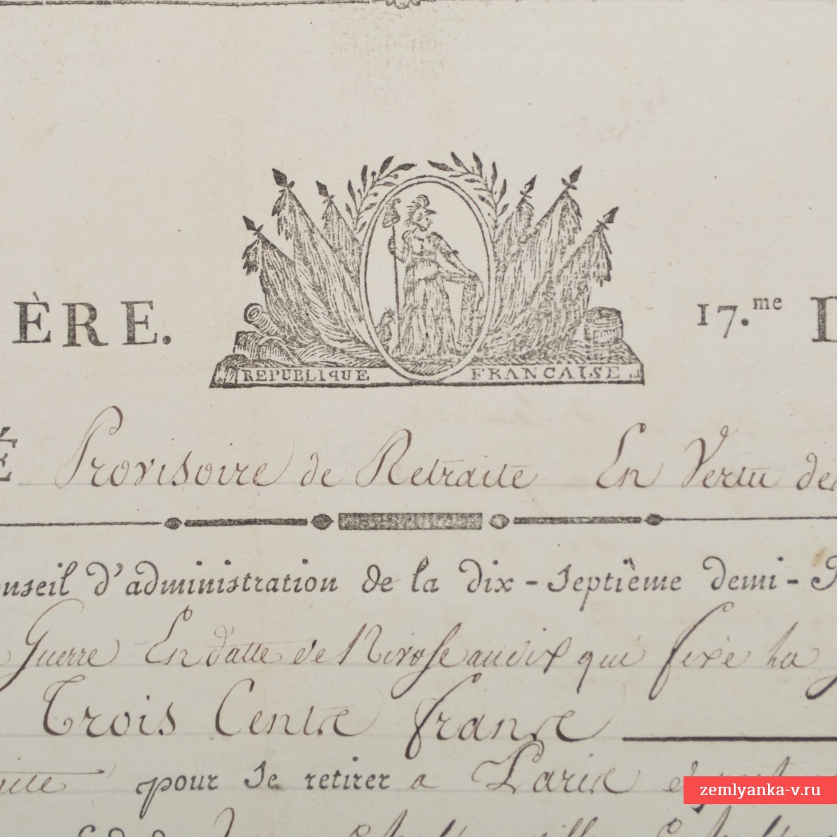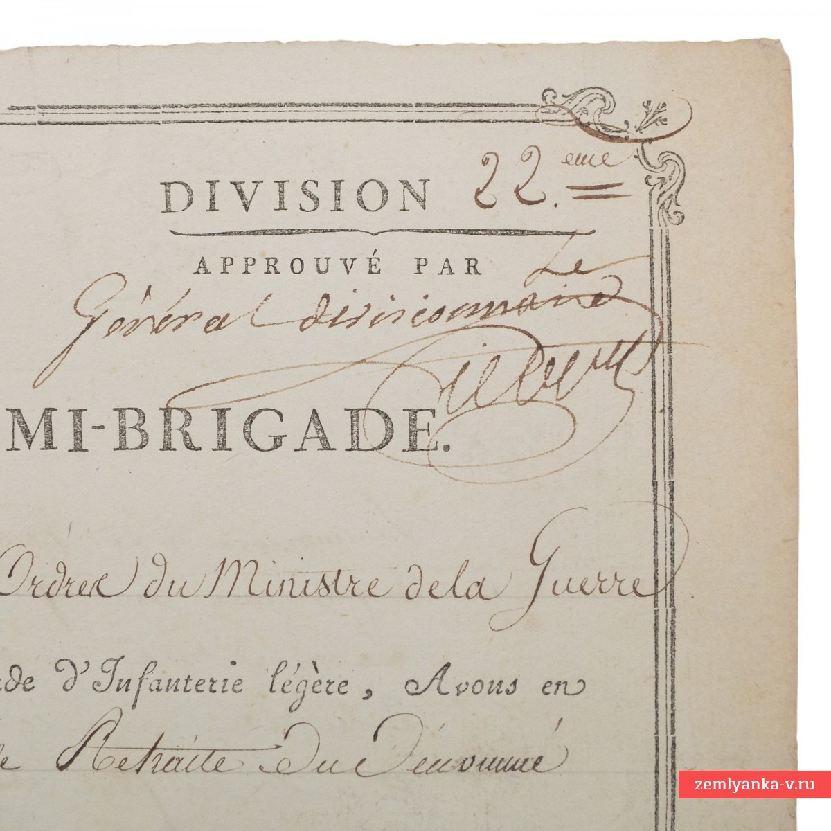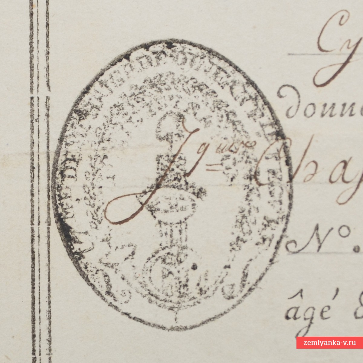 An original and quite rare document from the era of the Consulate of Napoleon Bonaparte in very good collector's condition. Verge paper, typographic printing. Watermarks. Signed by the brigade commander and officers. The sheet size is 253*398 mm. The bend in the center. Guarantee of authenticity.