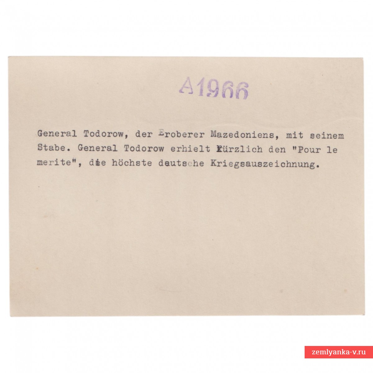 The original photo is in excellent collector's condition. An explanation of the event is printed on the back in German. Based on the description, the front side of the photo depicts General Todorov himself (1858-1934). together with his staff (officers). During the First World War, Todorov commanded the 2nd Bulgarian Army. During the Ovchepol operation (1915), his troops defeated the Serbian forces, which allowed Bulgaria to occupy the territory of Macedonia. The text indicates that the general had recently received this award, the highest military order of Prussia (Germany) at that time, also known as the Blue Max. Todorov was one of the few foreign generals awarded this honor for outstanding military command. Guarantee of authenticity.