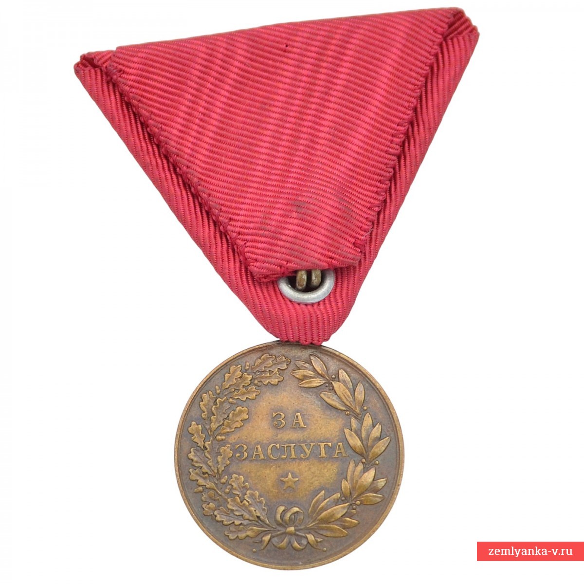 The medal was established in 1881 and was awarded for outstanding services to the Bulgarian nation and the crown. Obverse (obverse side): the profile of the reigning monarch Ferdinand I is depicted, with an inscription in Bulgarian around the circumference: "FERDINAND I PRINCE OF Bulgaria" ("Ferdinand I Prince of Bulgaria"). The face of the "young head". Without the medallist's signature. Reverse (reverse side): in the center is the inscription "For Merit" (bolg.) in two lines, surrounded by a wreath of oak and laurel leaves tied with a ribbon, and a five-pointed star at the bottom (this side is not visible in the image, but is standard for the medal). The reward is on the original shoe. Initially, the medal was awarded on a crimson ribbon, but later the use of the ribbon of the Order of Bravery (red) for services during the war and on the battlefield was approved.