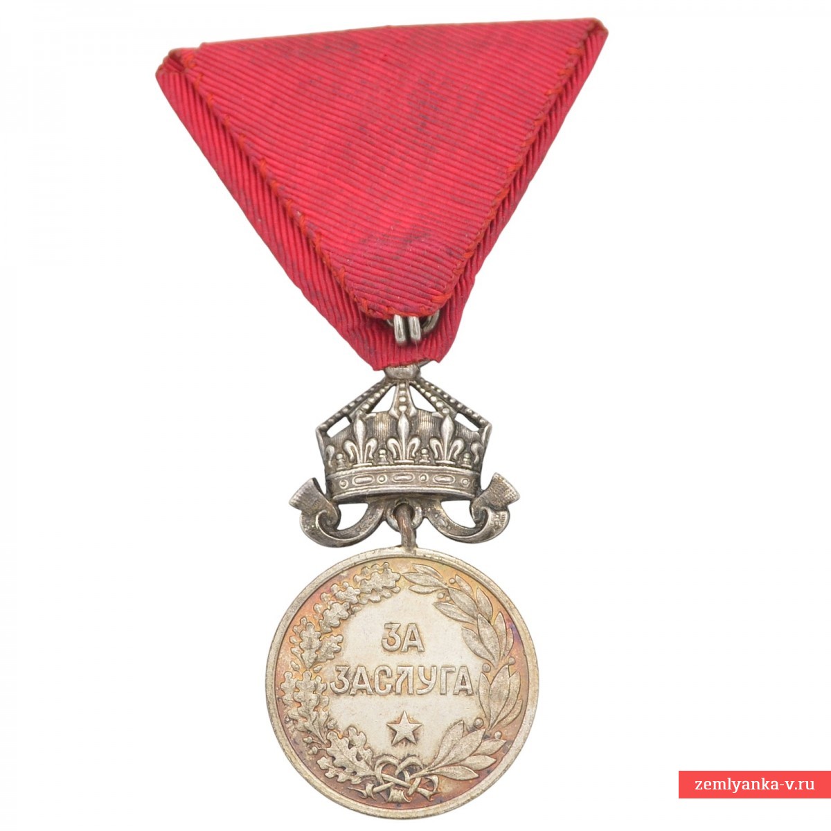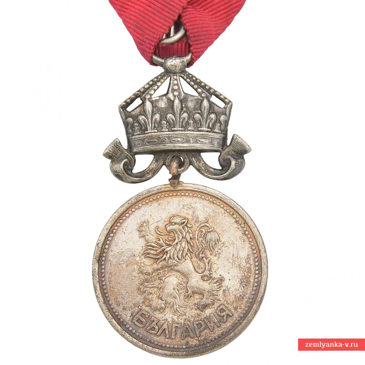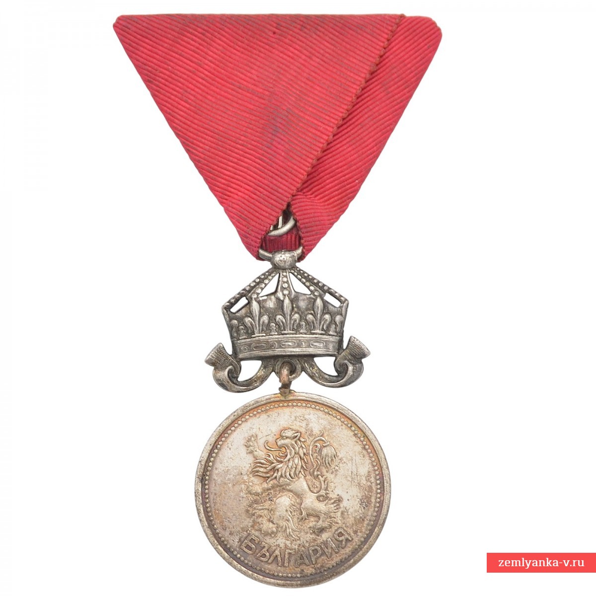 Silver, stamping. The medal was established in 1881 and was awarded for outstanding services to the Bulgarian nation and the crown. The obverse of the medal depicts a crowned Bulgarian lion standing on its hind legs (the state coat of arms) and the Cyrillic inscription "BULGARIA". A crown-shaped pendant was used to denote merit to the Crown./A monarch, as opposed to the option without a crown (for services to the Fatherland/By the State). Reverse (reverse side): in the center is the inscription "For Merit" (bolg.) in two lines, surrounded by a wreath of oak and laurel leaves tied with a ribbon, and a five-pointed star at the bottom (this side is not visible in the image, but is standard for the medal). The reward is on the original shoe. Initially, the medal was awarded on a crimson ribbon, but later the use of the ribbon of the Order of Bravery (red) for services during the war and on the battlefield was approved. Excellent condition. Guarantee of authenticity.