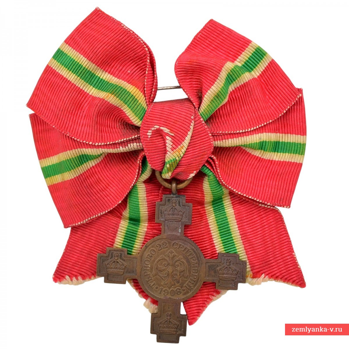 Cross for the Independence of Bulgaria (bolg. The Independence Cross on Bulgaria 22 September 1908) was established in 1909. The declaration of independence took place on September 22, 1908, when Bulgarian Prince Ferdinand I read out the "Manifesto of Bulgarian Independence" in the Church of the Forty Martyrs in the city of Veliko Tarnovo. Prior to the declaration of independence, the Bulgarian Principality was formally a vassal of the Ottoman Empire and sought the approval of the Turkish Sultan in all foreign policy acts. Independent Bulgaria became known as the Bulgarian Kingdom. The cross was awarded to Bulgarian citizens at the celebration of the declaration of independence of Bulgaria: officers and non-commissioned officers of the Bulgarian Army who are in service, as well as veterans, mayors of towns, civil servants. 11,490 crosses were awarded.