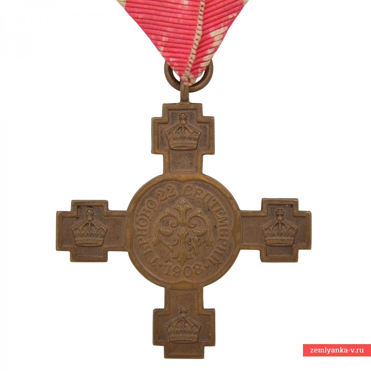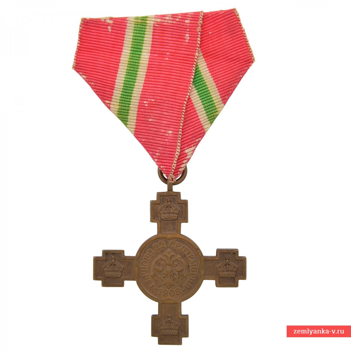 Cross for the Independence of Bulgaria (bolg. The Independence Cross on Bulgaria 22 September 1908) was established in 1909. The declaration of independence took place on September 22, 1908, when Bulgarian Prince Ferdinand I read out the "Manifesto of Bulgarian Independence" in the Church of the Forty Martyrs in the city of Veliko Tarnovo. Prior to the declaration of independence, the Bulgarian Principality was formally a vassal of the Ottoman Empire and sought the approval of the Turkish Sultan in all foreign policy acts. Independent Bulgaria became known as the Bulgarian Kingdom. The cross was awarded to Bulgarian citizens at the celebration of the declaration of independence of Bulgaria: officers and non-commissioned officers of the Bulgarian Army who are in service, as well as veterans, mayors of towns, civil servants. 11,490 crosses were awarded.