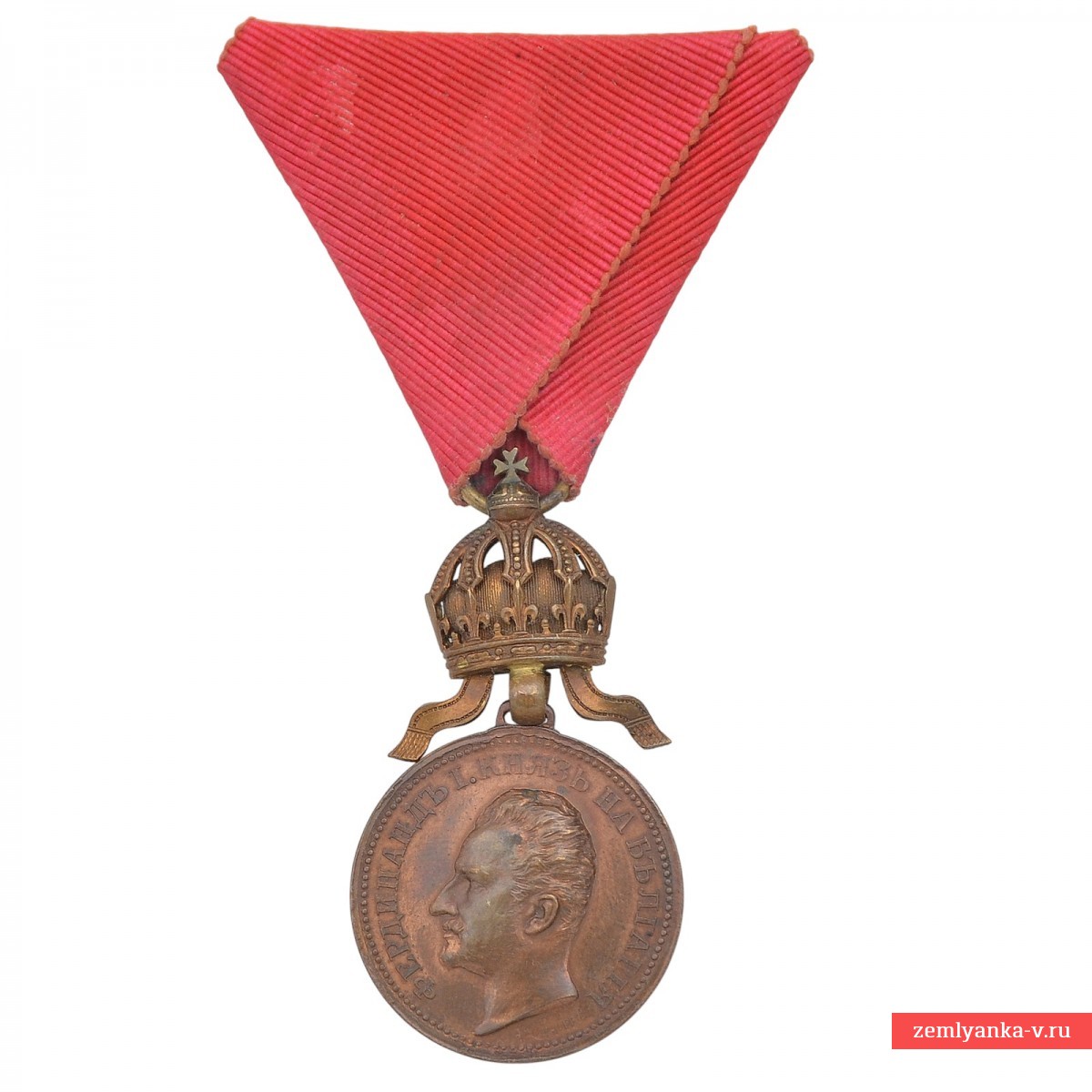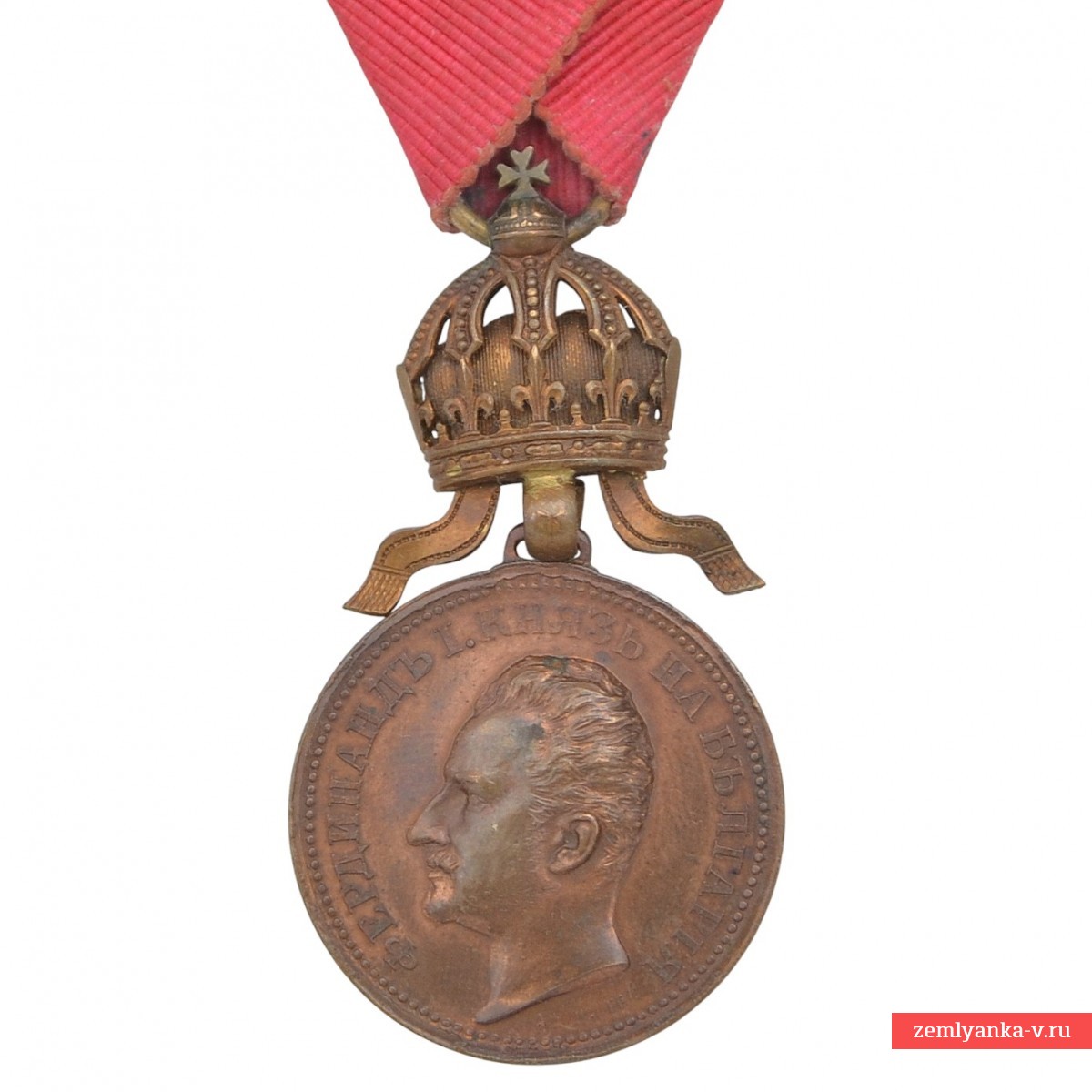 Bronze, stamping. The medal was established in 1881 and was awarded for outstanding services to the Bulgarian nation and the crown. Obverse (obverse side): The profile of the reigning monarch Ferdinand I is depicted, with an inscription in Bulgarian around the circumference: "FERDINAND I TSAR OF Bulgaria" (Ferdinand I Tsar of the Bulgarians). Reverse (reverse side): in the center is the inscription "FOR MERIT" (For merits) in two lines, surrounded by a wreath of oak and laurel leaves tied with a ribbon, and a five-pointed star at the bottom (this side is not visible in the image, but is standard for the medal). The reward is on the original shoe. Initially, the medal was awarded on a crimson ribbon, but later it was approved to use the ribbon of the Order of Bravery (red) for services during the war and on the battlefield. Excellent condition. A rare type of "tape down". Guarantee of authenticity.