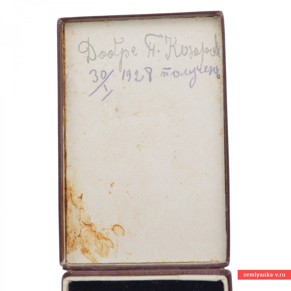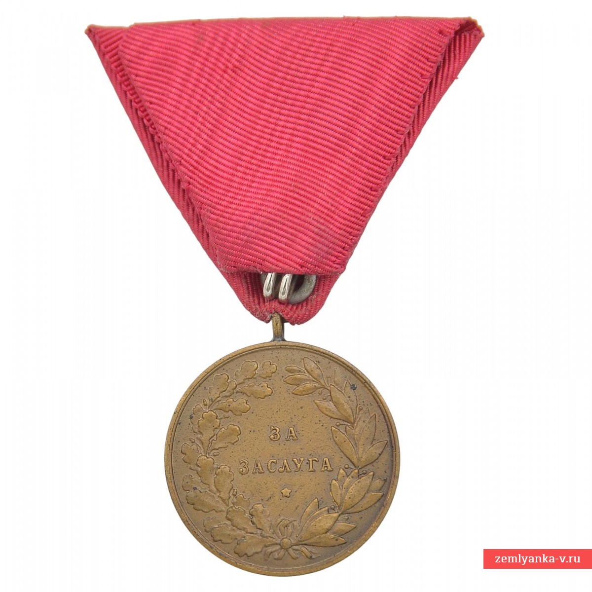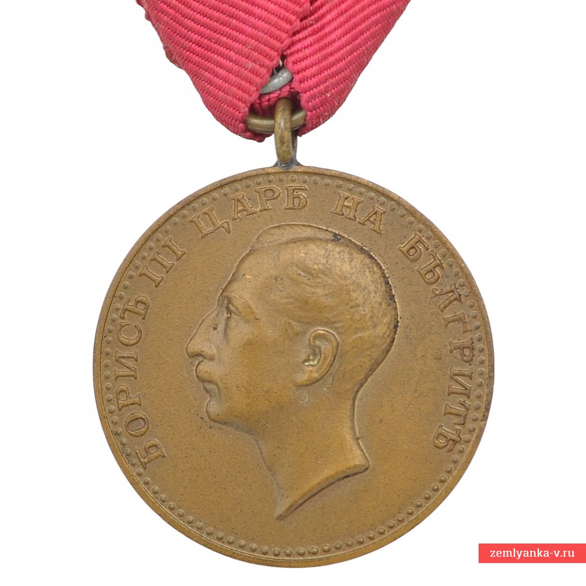 Bronze, stamping. The issue of Boris III. The medal was established in 1881 and was awarded for outstanding services to the Bulgarian nation and the crown. On the obverse (obverse side) of the medal, there is an inscription in Bulgarian around the circumference: "BORIS III TSAR of Bulgaria" (Rus. "Boris III Tsar of Bulgaria"). The sample shown here is a rare variant where the letter "A" is missing from the word "BLGARIT". Reverse (reverse side): in the center is the inscription "FOR MERIT" (For merits) in two lines, surrounded by a wreath of oak and laurel leaves tied with a ribbon, and a five-pointed star at the bottom (this side is not visible in the image, but is standard for the medal). The award is suspended on a red ribbon. Initially, the medal was awarded on a crimson ribbon, but later it was approved to use the ribbon of the Order of Bravery (red) for services during the war and on the battlefield. Excellent condition. The original case is included. Guarantee of authenticity.