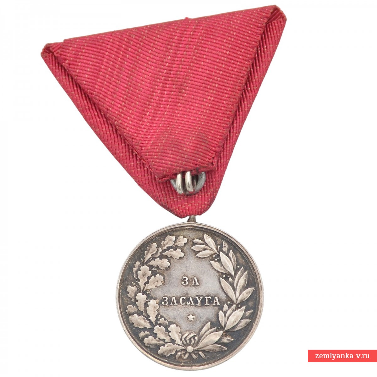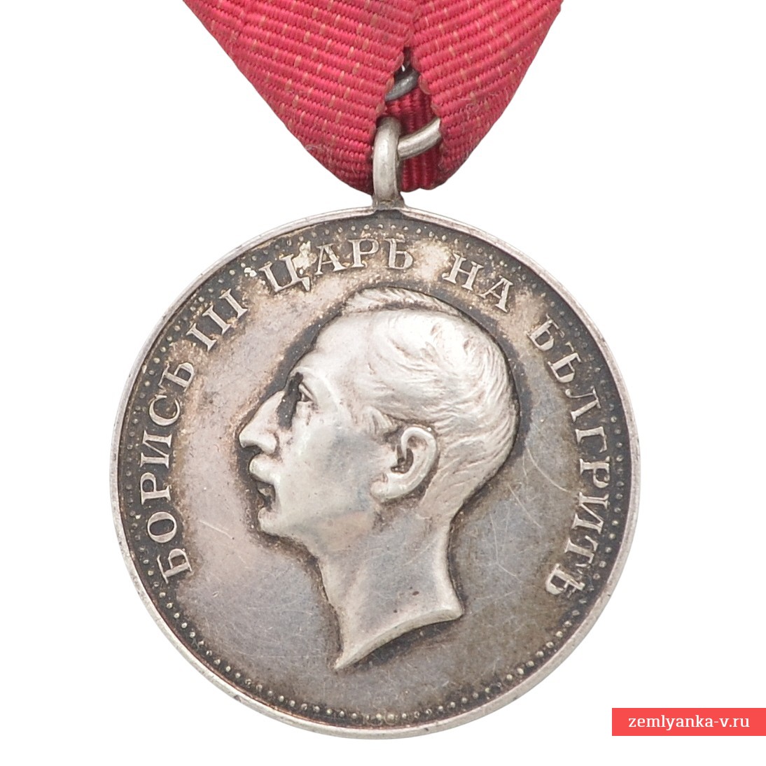 Silver, stamping. The issue of Boris III. The medal was established in 1881 and was awarded for outstanding services to the Bulgarian nation and the crown. On the obverse (obverse side) of the medal, there is an inscription in Bulgarian around the circumference: "BORIS III TSAR of Bulgaria" (Rus. "Boris III Tsar of Bulgaria"). The sample shown here is a rare variant where the letter "A" is missing from the word "BLGARIT". Reverse (reverse side): in the center is the inscription "FOR MERIT" (For merits) in two lines, surrounded by a wreath of oak and laurel leaves tied with a ribbon, and a five-pointed star at the bottom (this side is not visible in the image, but is standard for the medal). The award is suspended on a red ribbon. Initially, the medal was awarded on a crimson ribbon, but later it was approved to use the ribbon of the Order of Bravery (red) for services during the war and on the battlefield. Excellent condition. The original case is included. Guarantee of authenticity.
