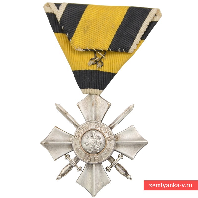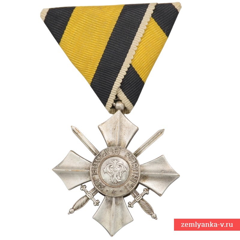 The Order of Military Merit was established by Prince Ferdinand I (1887-1908) on May 18, 1900. The Order was awarded to military personnel of the Bulgarian Army, Navy and Air Force (since 1912), as well as civilians, volunteers and volunteers for their military services, both in peacetime and wartime (including for past wars; the Serbo-Bulgarian War of 1885). Foreign nationals could also receive the award. In peacetime, the ribbon consisted of white, yellow and black; in wartime, the ribbon consisted of light blue and silver (a silver thread passed through the stripe). In total, there were 6 degrees in the Order of Military Merit.