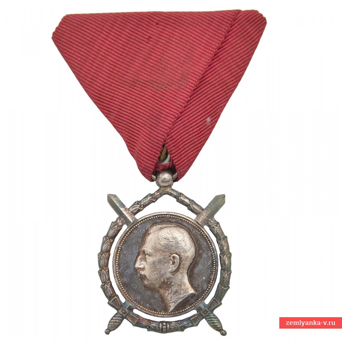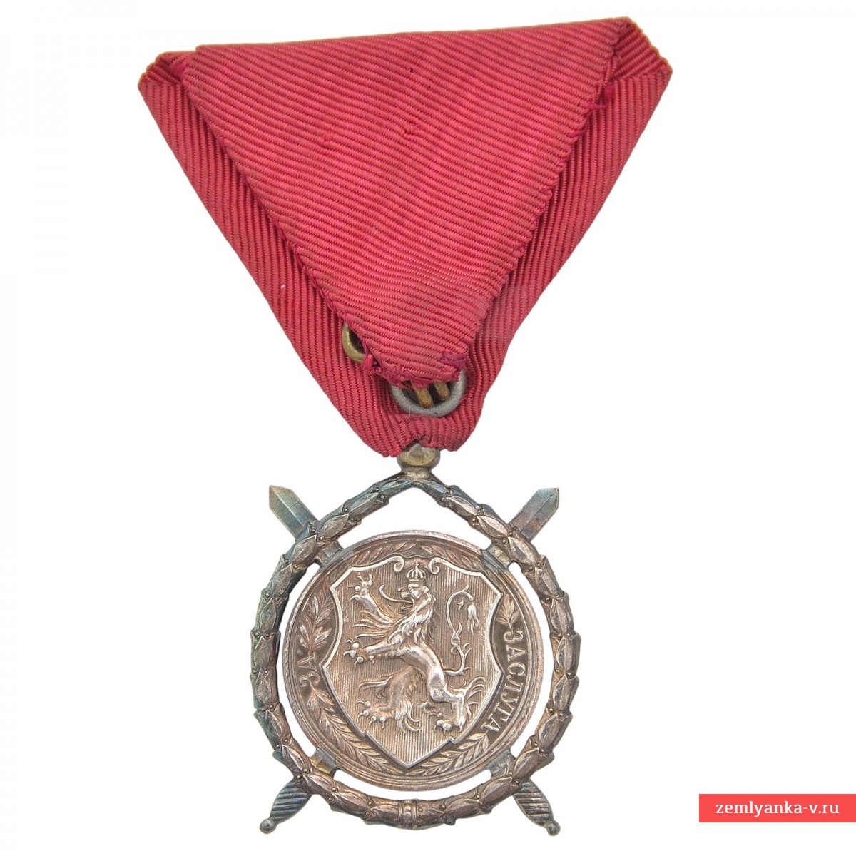 Order of Merit (bolg. Order of Merit) It was established on December 25, 1881 by decree of Prince Alexander Battenberg. The Order of Merit is awarded to military officers of officer ranks for military service (with the ribbon of the Order of Bravery) and peacetime (with the ribbon of the Order of St. Alexander). There are three issues of two varieties each. The badges of the order of each of the issues were made of silver and represent a round medallion framed by a laurel wreath with a diameter of 34 mm. The obverse side depicts the image of the reigning monarch, and the reverse side features a crowned Bulgarian lion on a German Gothic shield. On the sides of the shield are laurel branches and the inscription "For merit". The medallion is superimposed on crossed swords. With different issues, there are differences in the thickness of the font, the width of the wreath and the shape of the shield.