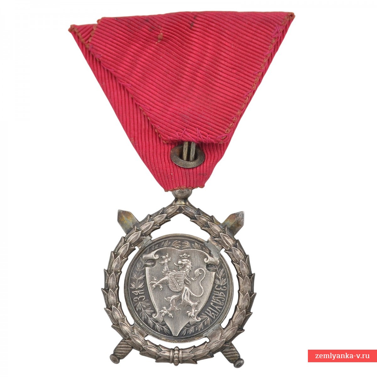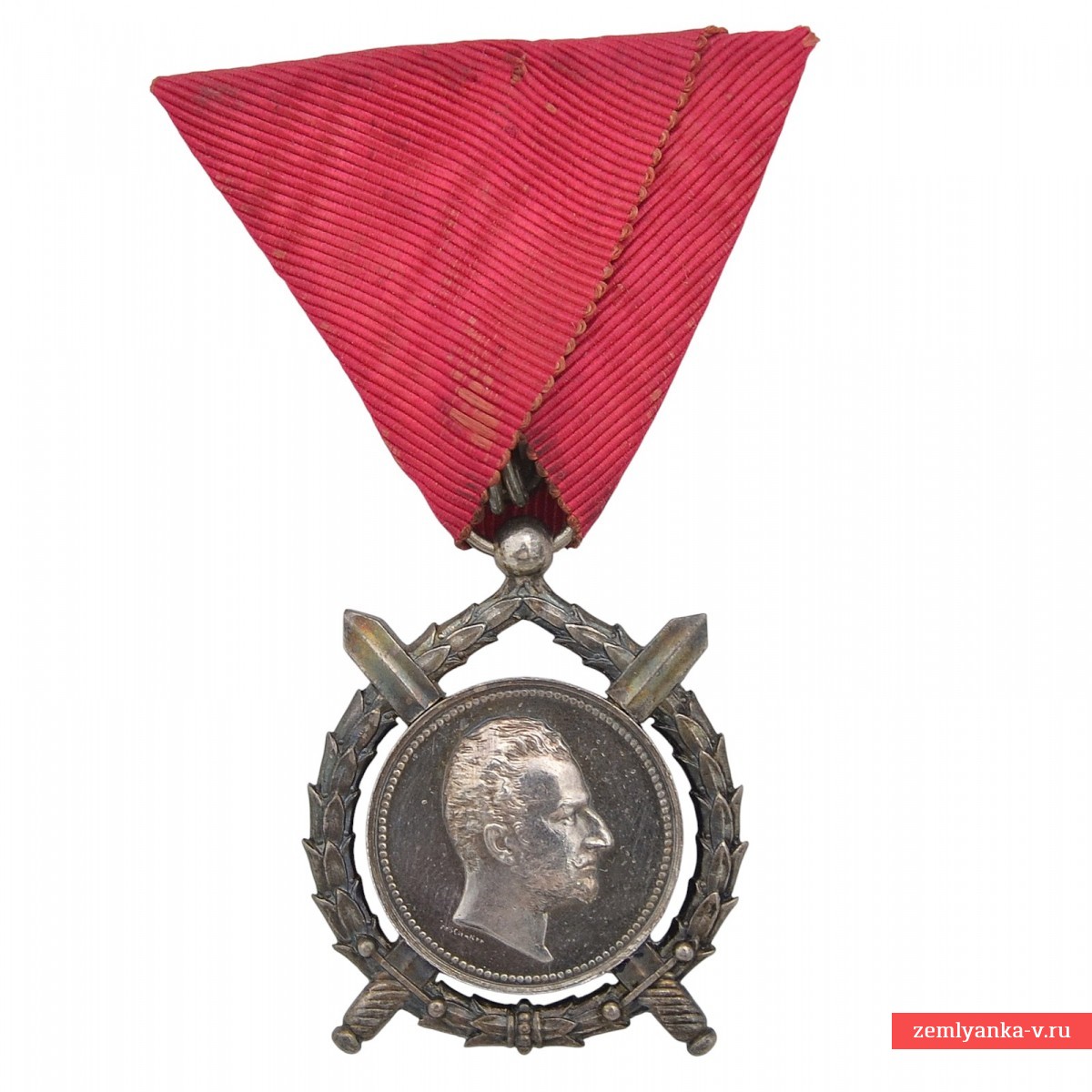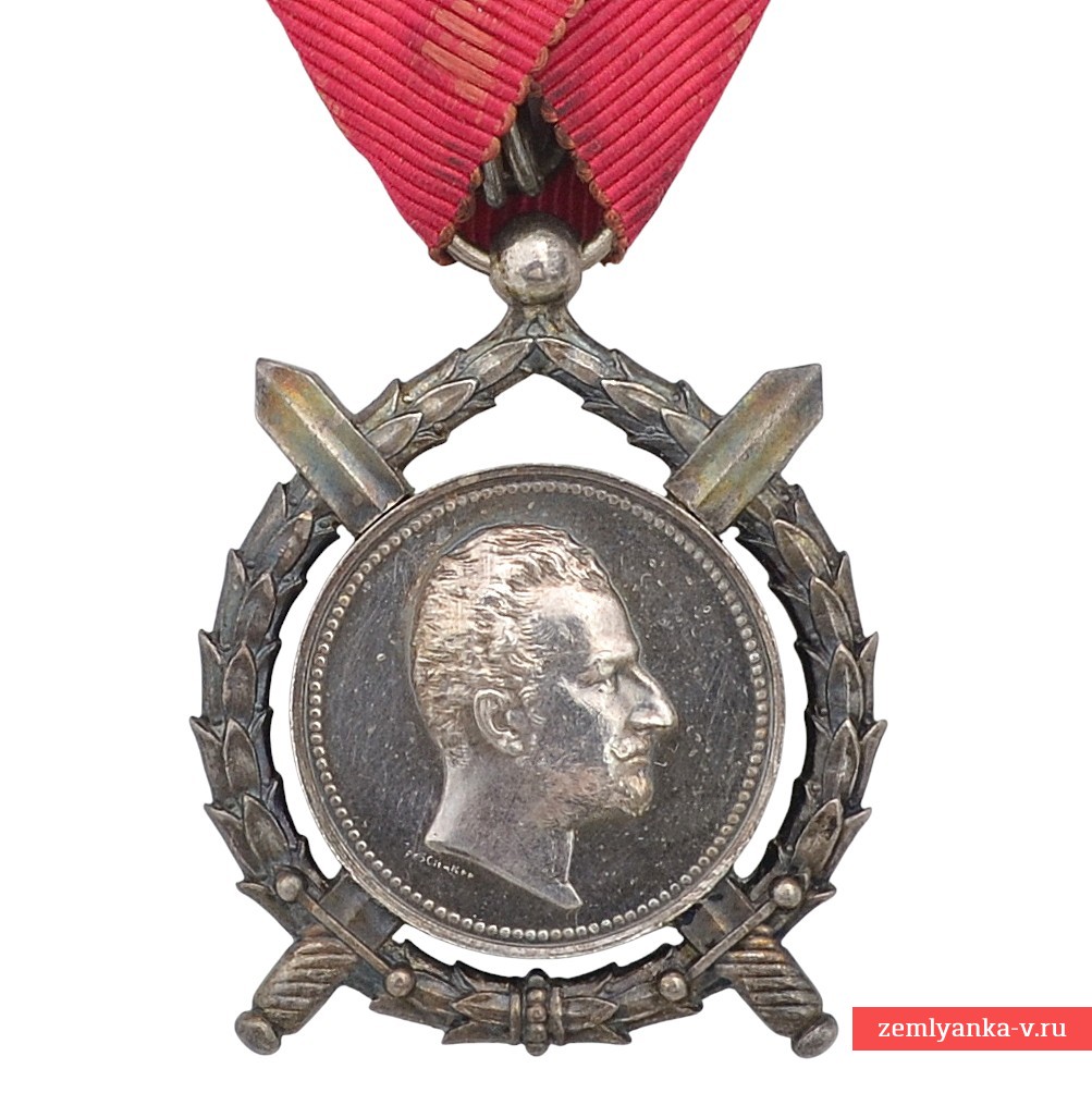 Order of Merit (bolg. Order of Merit) It was established on December 25, 1881 by decree of Prince Alexander Battenberg. The Order of Merit is awarded to military officers of officer ranks for military service (with the ribbon of the Order of Bravery) and peacetime (with the ribbon of the Order of St. Alexander). There are three issues of two varieties each. The badges of the order of each of the issues were made of silver and represent a round medallion framed by a laurel wreath with a diameter of 34 mm. The obverse side depicts the image of the reigning monarch, and the reverse side features a crowned Bulgarian lion on a German Gothic shield. On the sides of the shield are laurel branches and the inscription "For merit". The medallion is superimposed on crossed swords. With different issues, there are differences in the thickness of the font, the width of the wreath, and the shape of the shield.