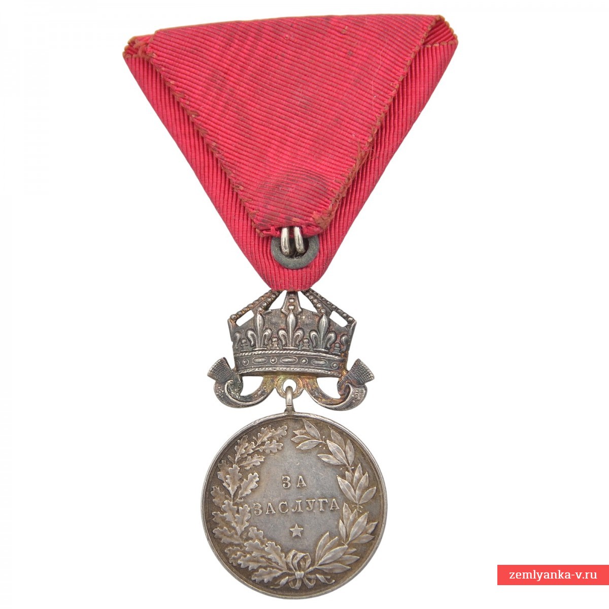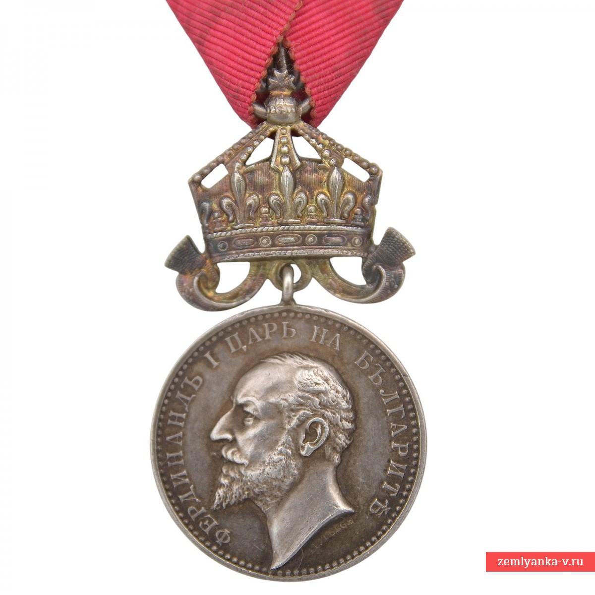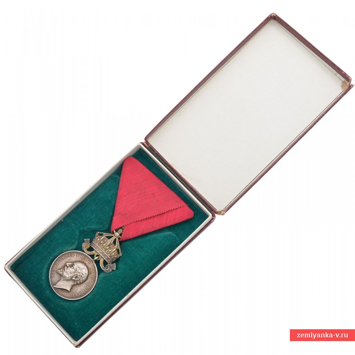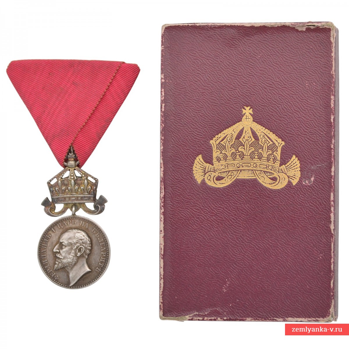 Silver 990 samples, stamped. The medal was established in 1881 and was awarded for outstanding services to the Bulgarian nation and the crown. Obverse (obverse side): The profile of the reigning monarch Ferdinand I is depicted, with an inscription in Bulgarian around the circumference: "FERDINAND I TSAR OF Bulgaria" (Ferdinand I Tsar of the Bulgarians). Reverse (reverse side): in the center is the inscription "FOR MERIT" (For merits) in two lines, surrounded by a wreath of oak and laurel leaves tied with a ribbon, and a five-pointed star at the bottom (this side is not visible in the image, but is standard for the medal). The award is suspended on a red ribbon. Initially, the medal was awarded on a crimson ribbon, but later it was approved to use the ribbon of the Order of Bravery (red) for services during the war and on the battlefield. Excellent condition. The medal is in its original case. The Ferdinand issue. A rare variety with a medallist's badge and a stamp on the edge. This crown option is very rare. Badges with the name of the medallist are distinguished by a higher quality of workmanship than those without a signature. Guarantee of authenticity.
