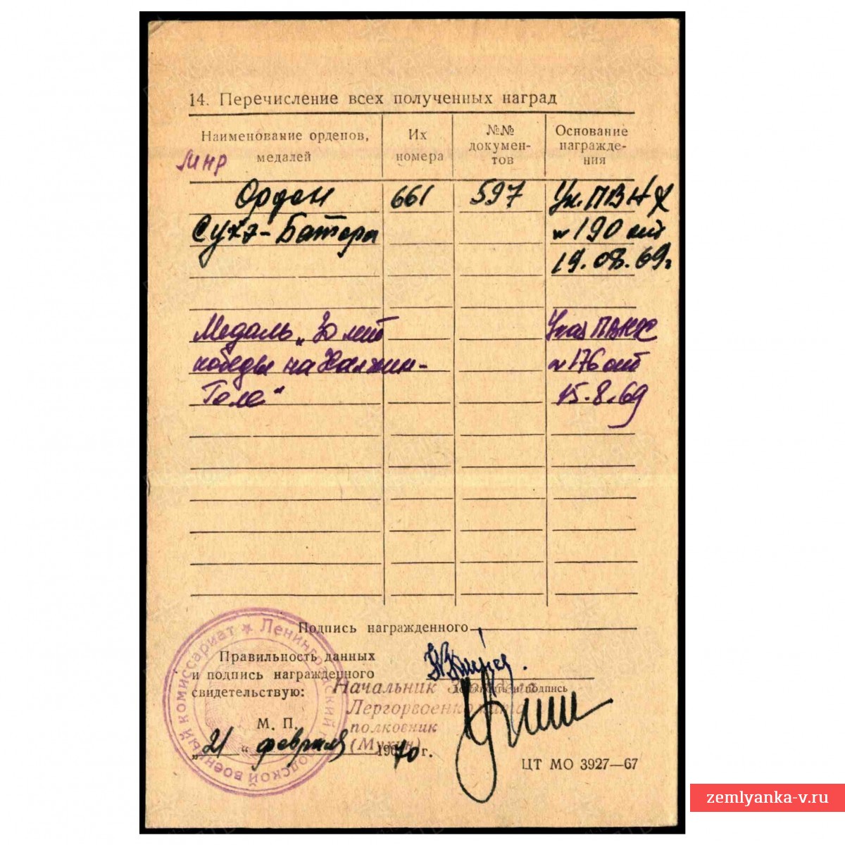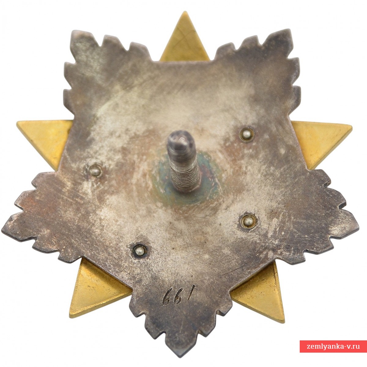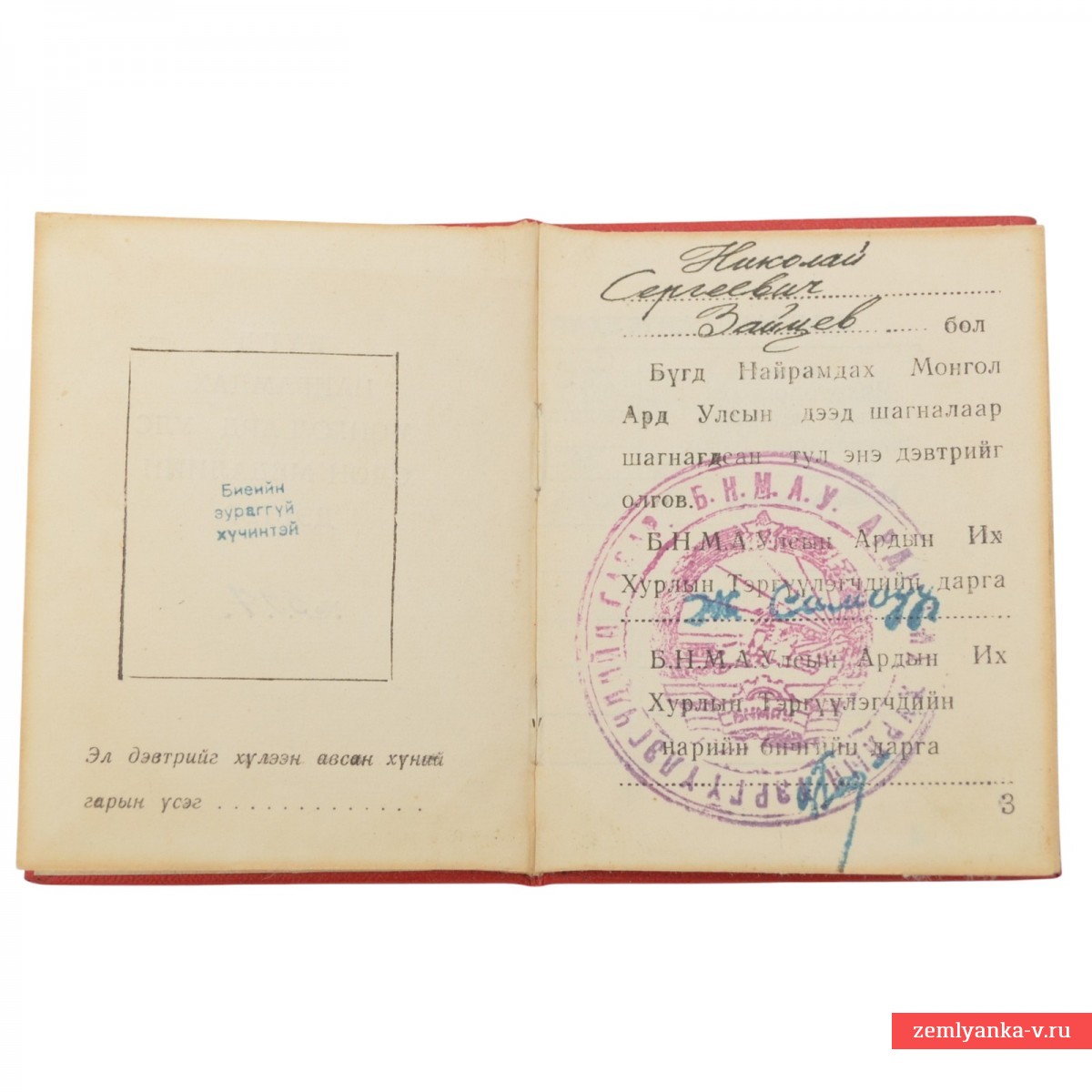 The rarest award on our market is in excellent condition. The original case and the award book are included. Gold, platinum, silver, enamel. The order is a convex, polished gold five-pointed star, between the ends of which are silver flat pointed rays of different sizes, covered with blue enamel. In the center of the Order's star there is a platinum relief image of Sukhbaatar on the background of a circle covered with gray enamel and surrounded by a golden wreath. Above the portrait, a red enamel revolutionary banner with magnificent tassels and the inscription "SUKHBAATAR" flies to the right, and a red enamel star is depicted below it. The reverse side of the order is smooth, slightly concave. In the center of it is soldered a threaded pin with a nut for attaching the order to clothing. The award number is 661 on the reverse. The order with this number was awarded to Nikolai Sergeyevich Zaitsev (1911-1971)— a colonel in the Guards of the Soviet Army, a participant in World War II, Hero of the Soviet Union (1945).