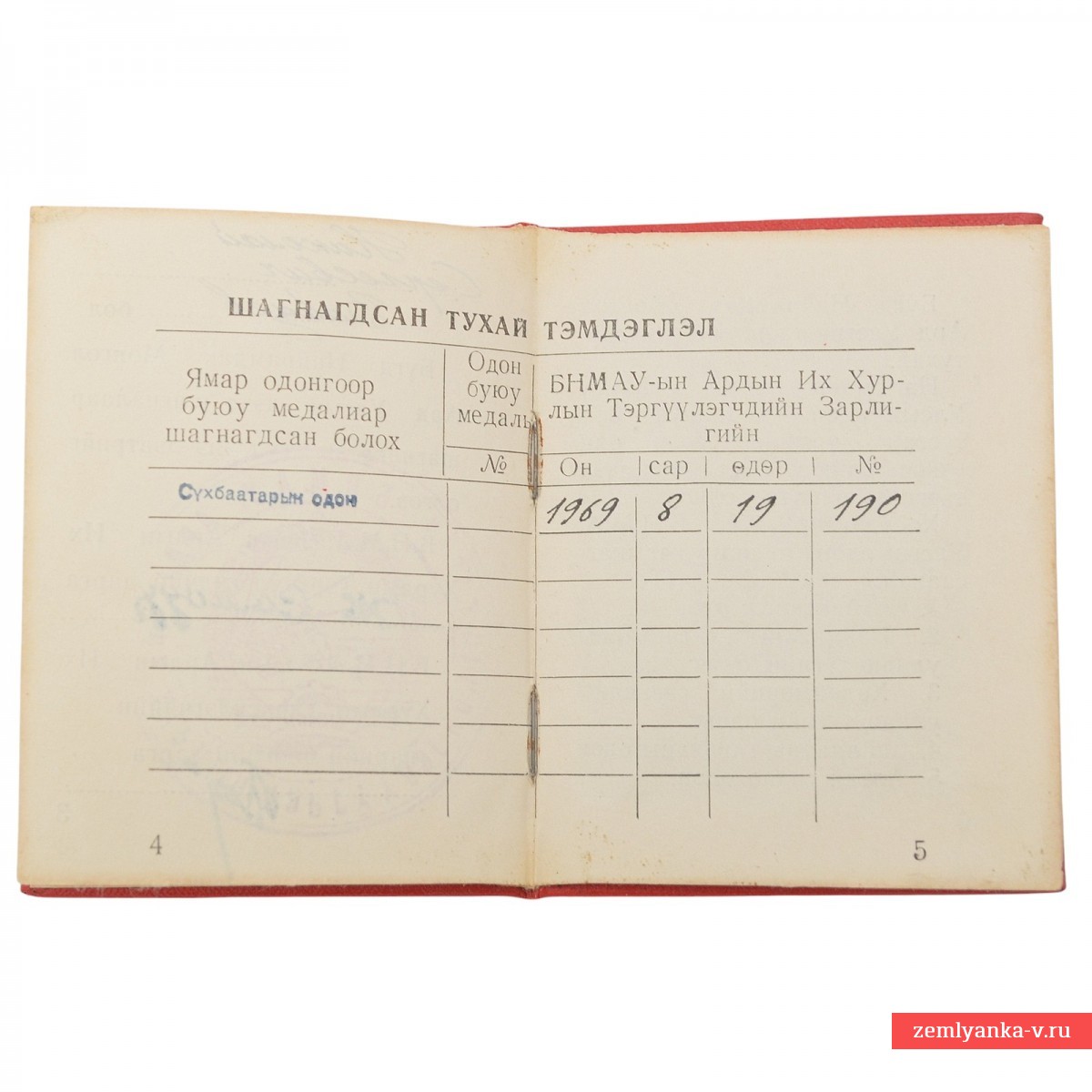 The Order of Sukhbaatar is awarded to both individuals and entire collectives — institutions, enterprises, and military units. The award is given for outstanding achievements in strengthening the independence of the country, in economic and cultural construction, as well as for dedication, courage and bravery. The award is made by the Small Hural of the Mongolian People's Republic, and together with the award, the recipient is presented with a medal book, in which a photograph of the recipient is pasted, his name and surname, the number of the order are recorded, and the merit for which the person was awarded this high distinction is indicated.