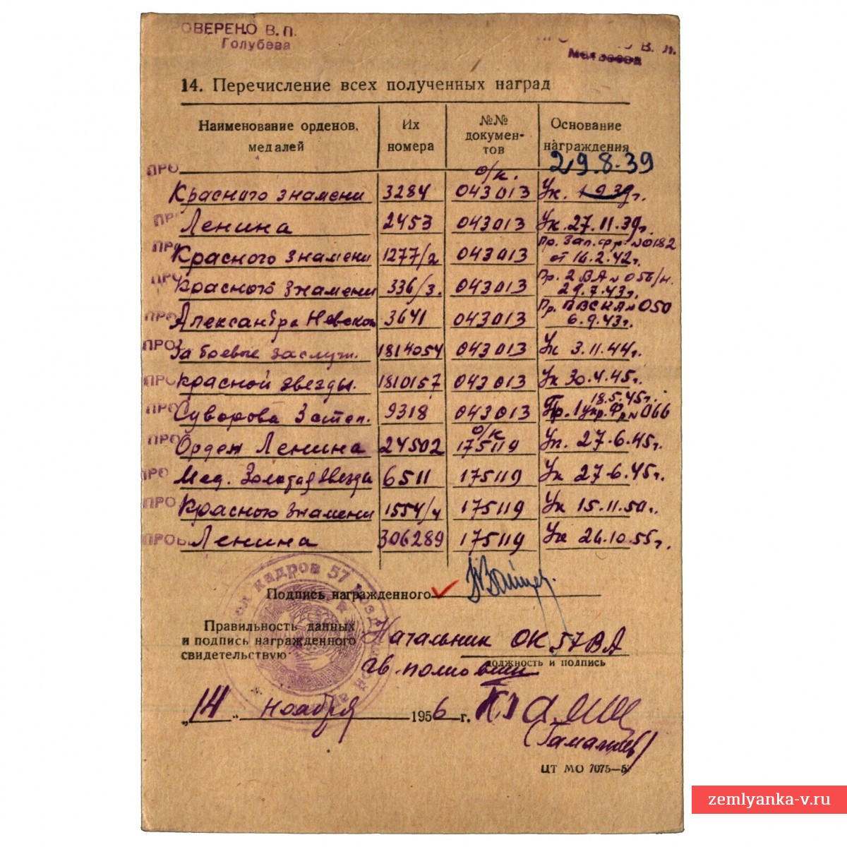 He was awarded three Orders of Lenin, four Orders of the Red Banner, the Orders of Suvorov, 3rd degree, Alexander Nevsky, the Red Star, and a number of medals.