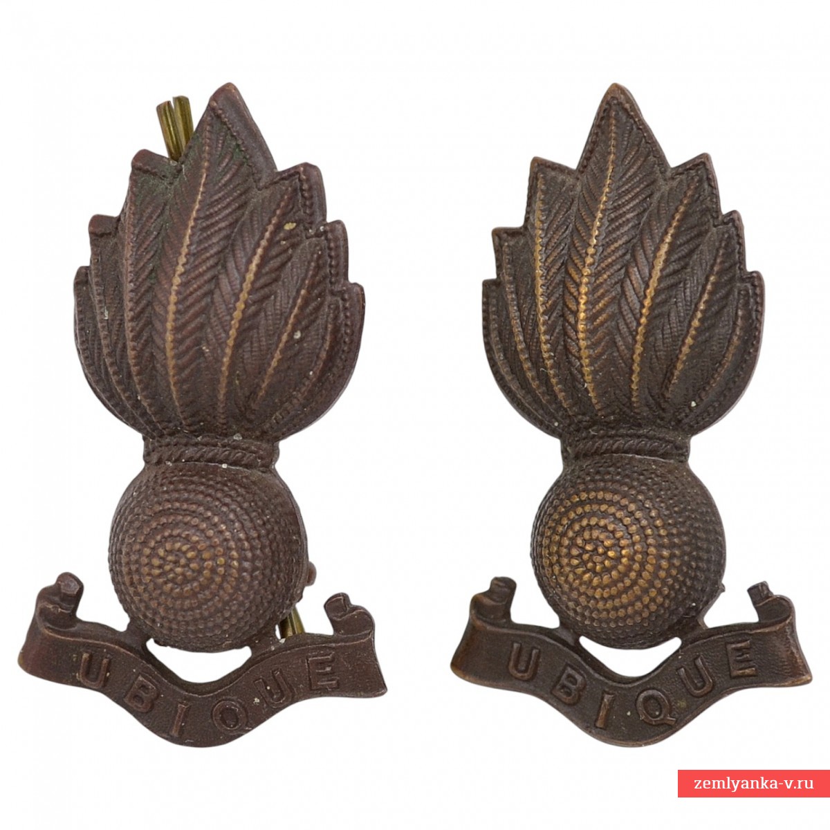 Bronze, stamping, patination. The signs are paired, made in the form of a "flaming grenada" with seven flames located above the scroll. The word "UBIQUE" at the bottom of the signs is written in Latin and means "Everywhere". This motto reflects the fact that these units have participated in almost all the combat operations of the British Army for over 300 years. Used by the Royal Artillery or Royal Engineers of the British Army. On the reverse side there are protrusions (lugs) and pins for