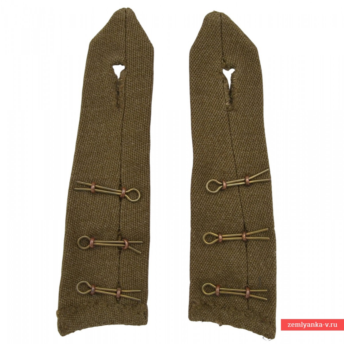 A pair of antique shoulder straps of a Canadian officer with the rank of captain in excellent collector's condition. The shoulder straps are decorated with insignia, which consist of three stars (called "pips"), signifying the rank of captain in the British and Commonwealth armies. The shoulder straps are made of khaki wool fabric. Guarantee of authenticity.