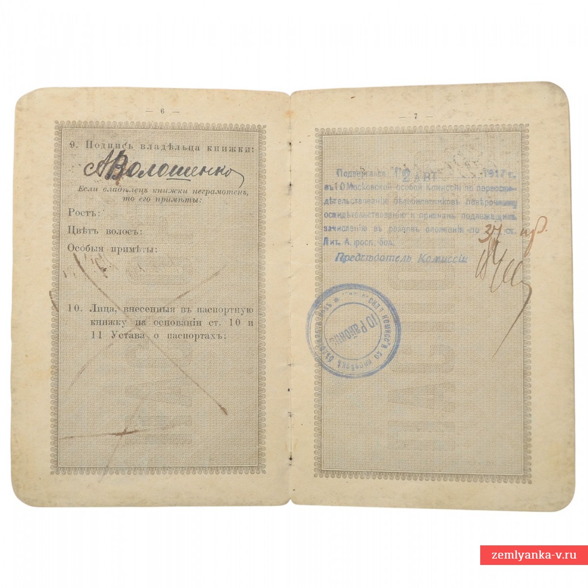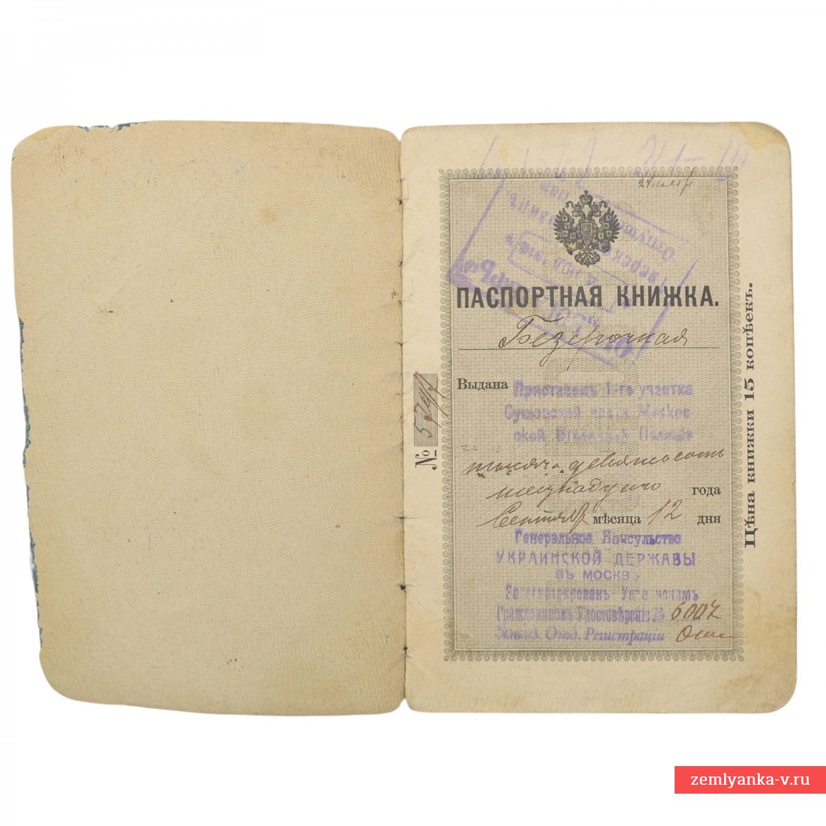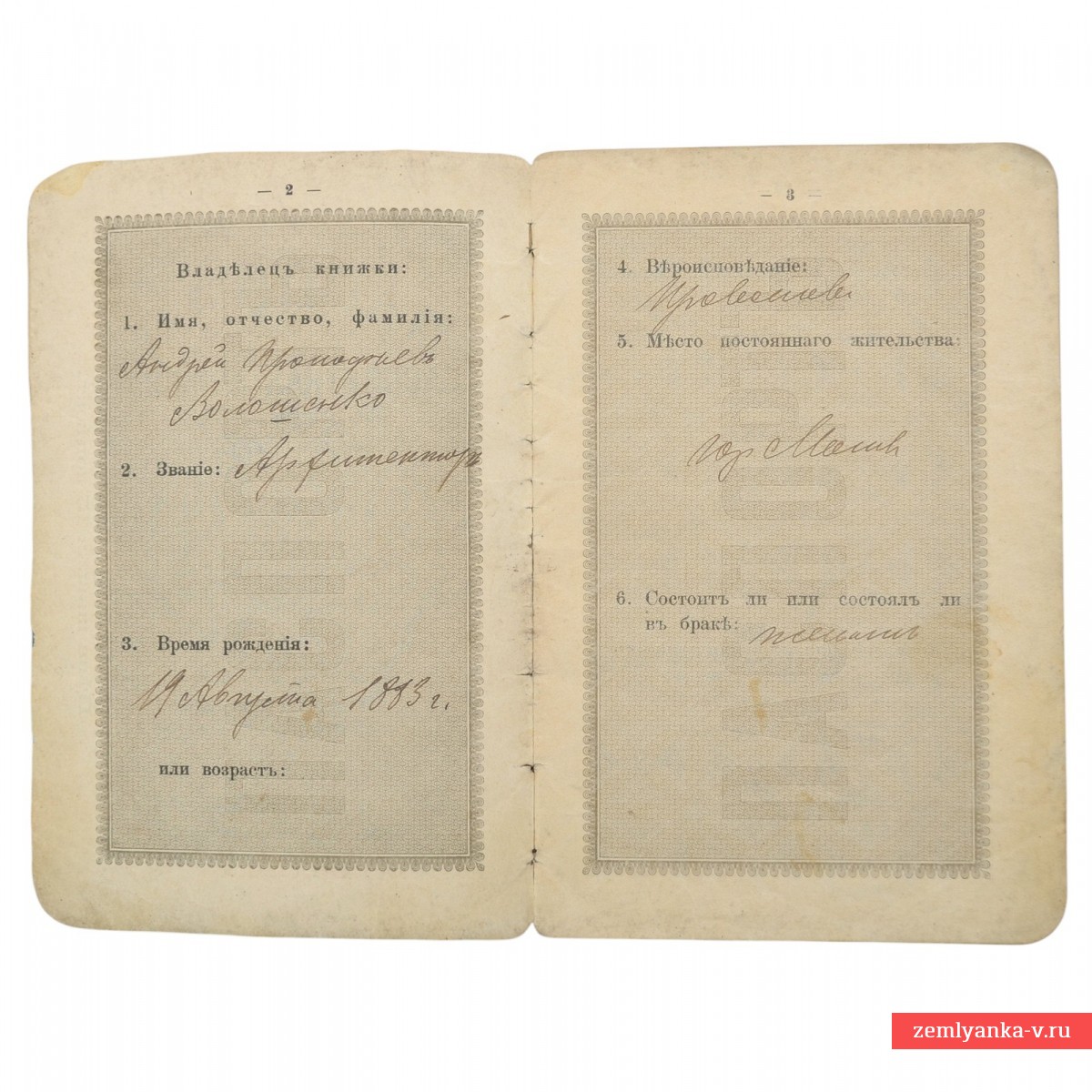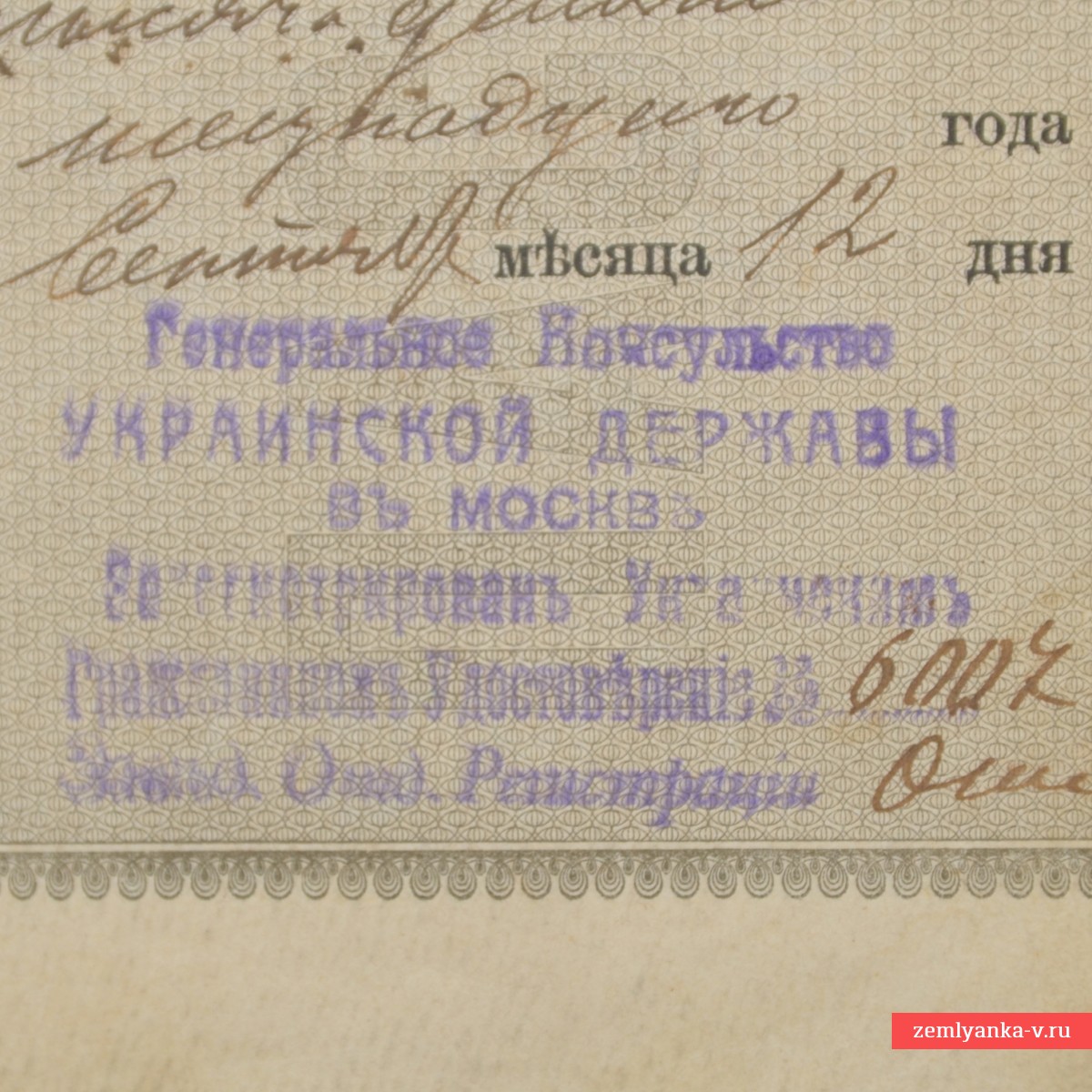 A very rare and interesting document from the early years of Soviet power, issued to the famous artist and architect A.P. Voloshenko. On the third page is the stamp of the Consulate General of the Ukrainian state in Moscow. Guarantee of authenticity.
