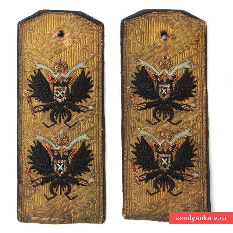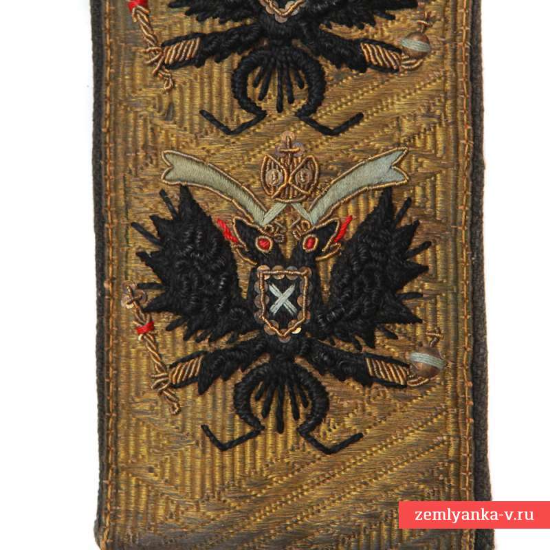 Unlike generals, which ranks in the old Russian army was designated with asterisks to denote the ranks on epaulettes of admirals of the Imperial Russian Navy embroidered with black double-headed eagle with St. Andrew's cross in the breast shield, surmounted by a crown with blue ribbon, with skiatron and Orb in his claws. The rear-Admiral had only one eagle, Vice-Admiral or two, Admiral – three eagles. Interestingly, this naming of ranks was revived in 1943 in the Soviet Navy, and still exists, only the double-headed eagle was replaced by the stars. Judging by the hexagonal form and coconino lining of black fabric, the shoulder straps were intended to coat or blue tunic. Both of the ring have obvious signs of wear in the form of darkening and of fading lace, but embroidery has been preserved almost intact. Data on the rarity of the shoulder straps gives an idea of what to January 1917 in the Russian Imperial Navy, there were only 14 Vice-admirals. Admiral's insignia in our days are extremely rare. Judging by some of the details of execution, the shoulder straps are made in the 1910s, but we can not exclude that they could be sewn in exile in the period between the two world wars.