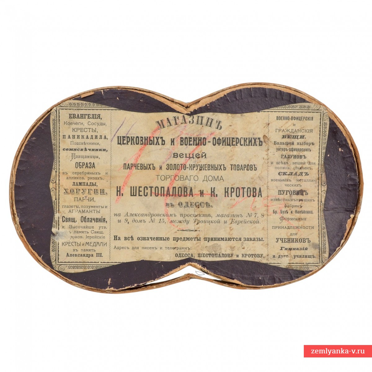 An extremely rare accessory that is almost impossible to find on sale today. The original cardboard case of N. Shestopalov and K. Shestopalov's store of officer's belongings. Krotova in Odessa. The case for the chief officer's epaulettes has minor damage around the perimeter. The lid is partially separated from the walls. Guarantee of authenticity.