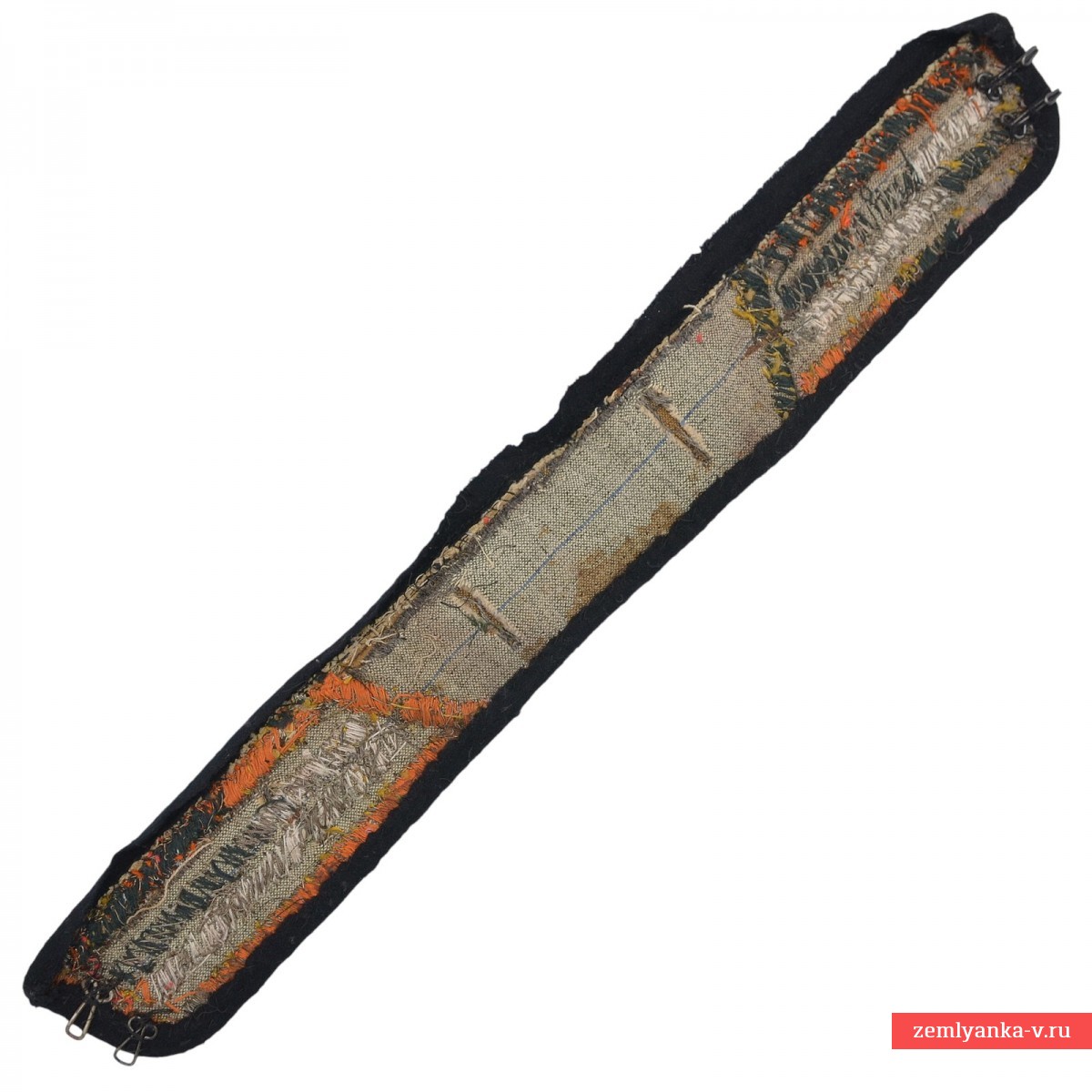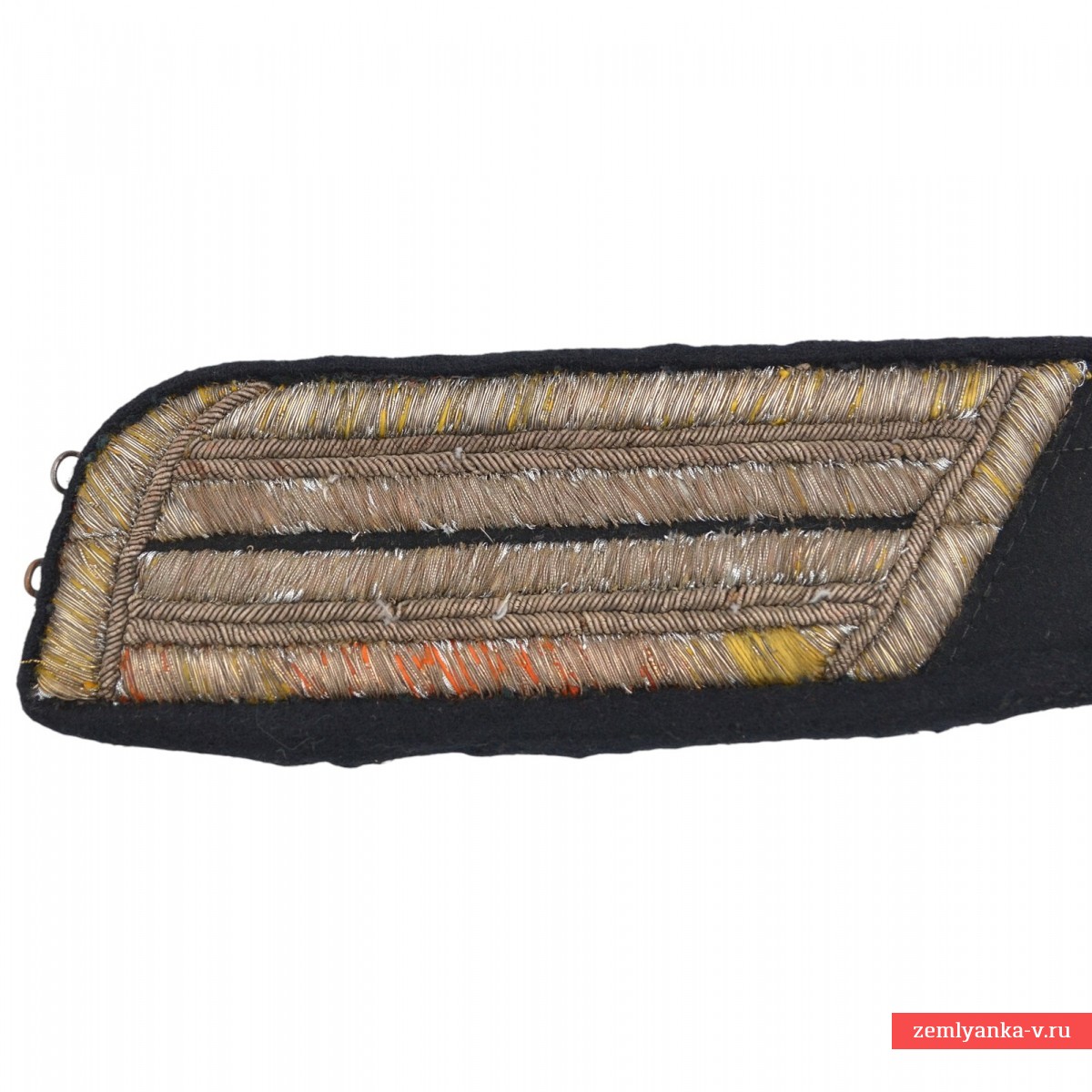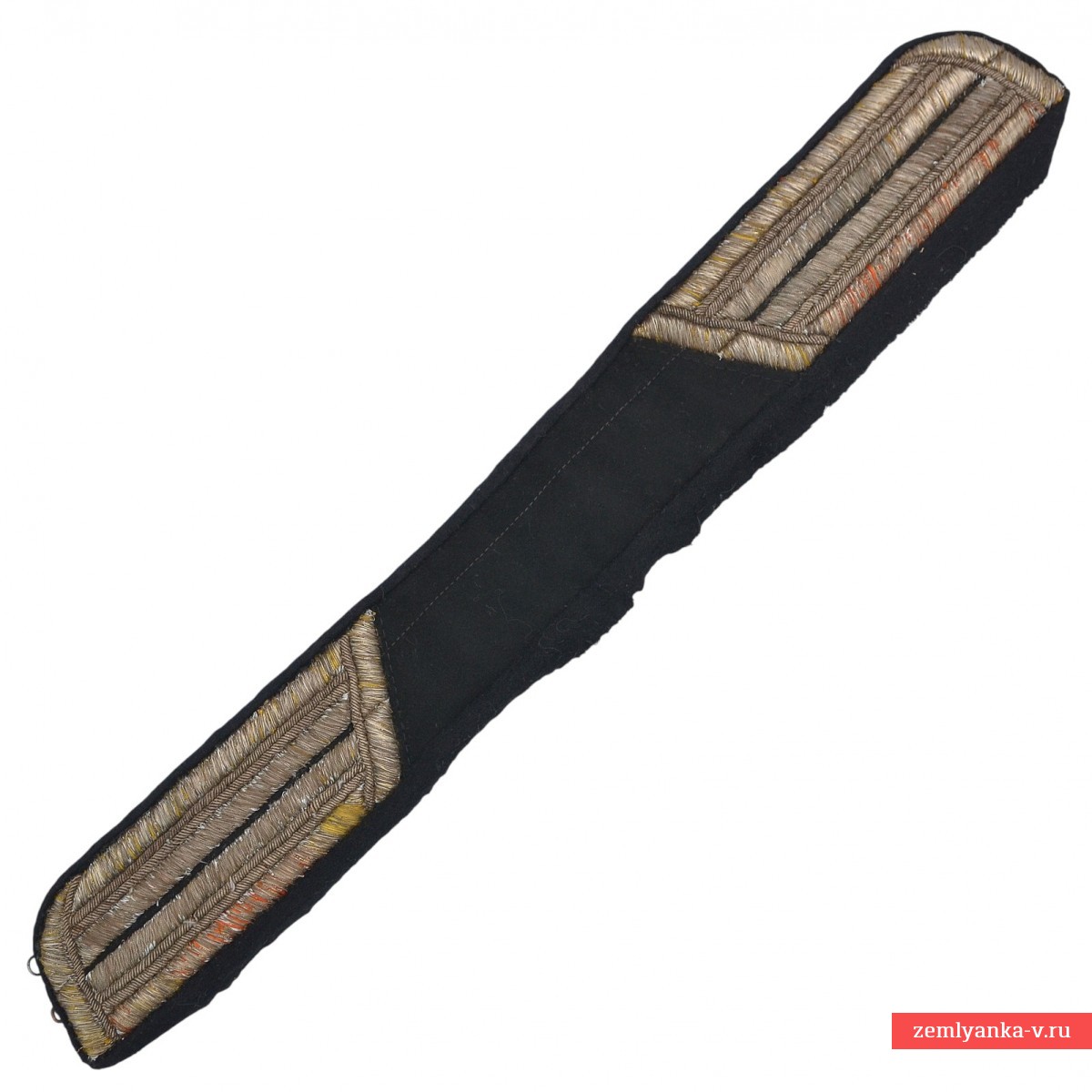 As a result of the 1907 reform, officers' uniforms became more beautiful, but at the same time significantly increased in price: fine sewing was much more expensive than woven braid. For poor officers, the factories of officers' clothes began to make buttonholes from the so-called low-grade silver thread. It was made not on silk, but on a cotton base, with a very thin gold coating. The latter turned out to be fragile, and to this day such buttonholes are preserved, as a rule, with completely lost gilding, however, the yellow color of the warp threads clearly indicates that they were originally gold. The buttonholes were embroidered directly on the cloth of the collar, but the original base was completely lost. To give such buttonholes a collectible look, they are usually mounted on the basis of cloth of a neutral color – uniform or black, as is done in this case. The sloping shape of the back slopes of the buttonholes is a kind of panache, an imitation of the officers of the Guard, which is occasionally found on items of army uniforms.