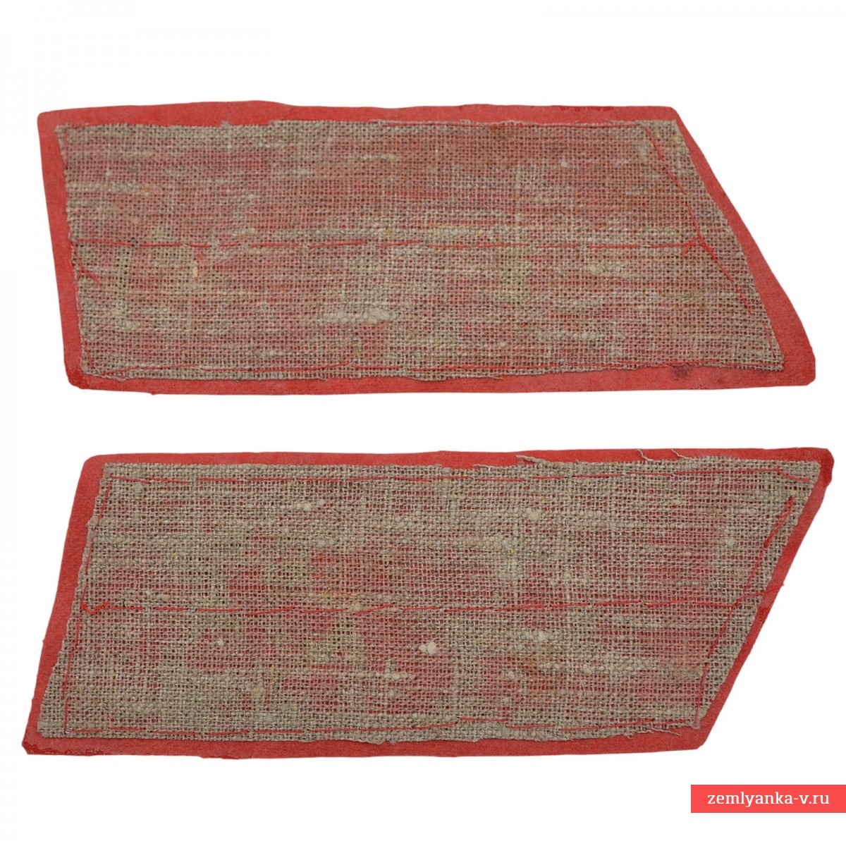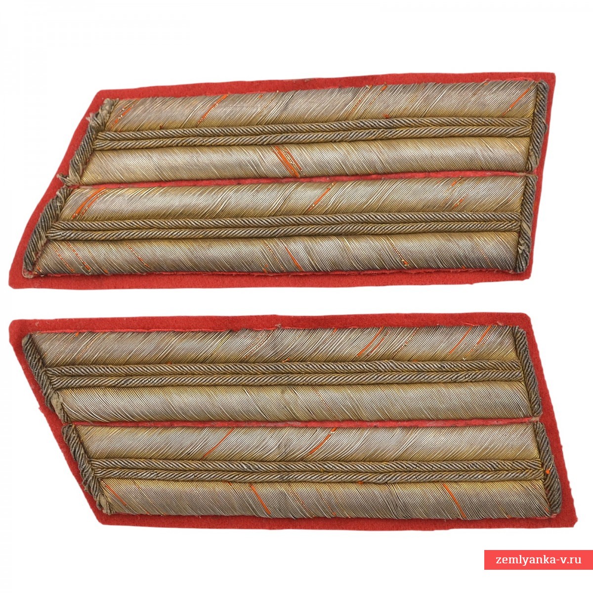 In this case, the uniform on which the buttonholes were installed was lost, but the most valuable part of its decoration was preserved. The buttonholes are embroidered with silver gilt embroidery, which is typical for the second half of the 19th and early 20th centuries. Some of the gilding was lost in the process of use, but remnants of the coating have been preserved along the edges of the buttonholes and especially in the end parts (slopes). The fact that the buttonholes were originally gold is also evidenced by the color of the thread on which the thread is woven. Judging by the size ratio of the buttonholes, they occupied the entire height of the collar, which is typical for the buttonholes of the Guards Light Cavalry. The original scarlet cloth is almost completely lost, but its remains are clearly visible along the edges of the lace and between the buttonholes. To give the item a collectible look, the buttonholes are mounted on a cloth base, the color of which is as close as possible to the color of the original, and for rigidity they are lined with linen canvas. Based on the color scheme (red collar and gold metal device), the owner of the uniform could have served in the Life Guards of the Horse Grenadiers or the Life Guards of Her Majesty's Lancers.