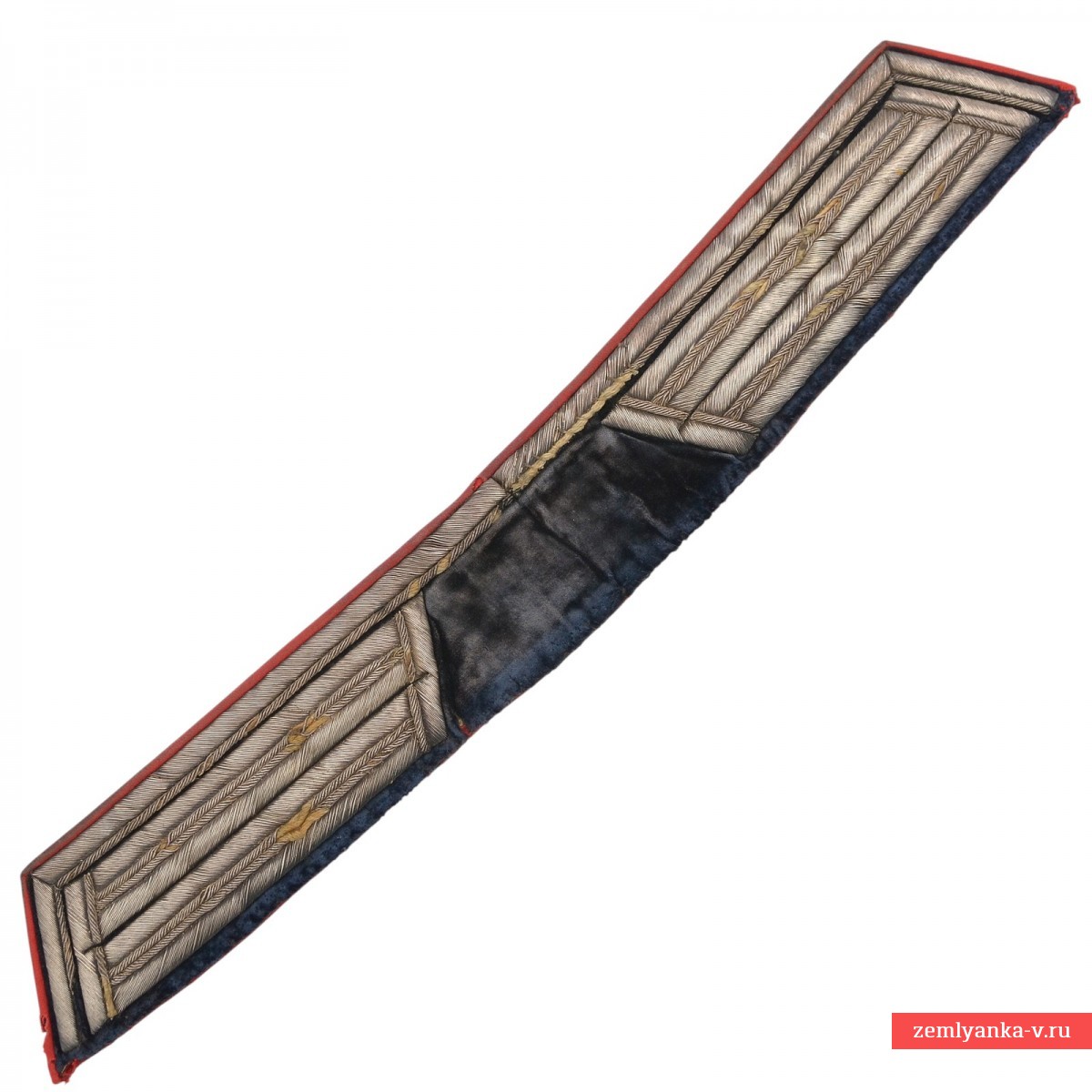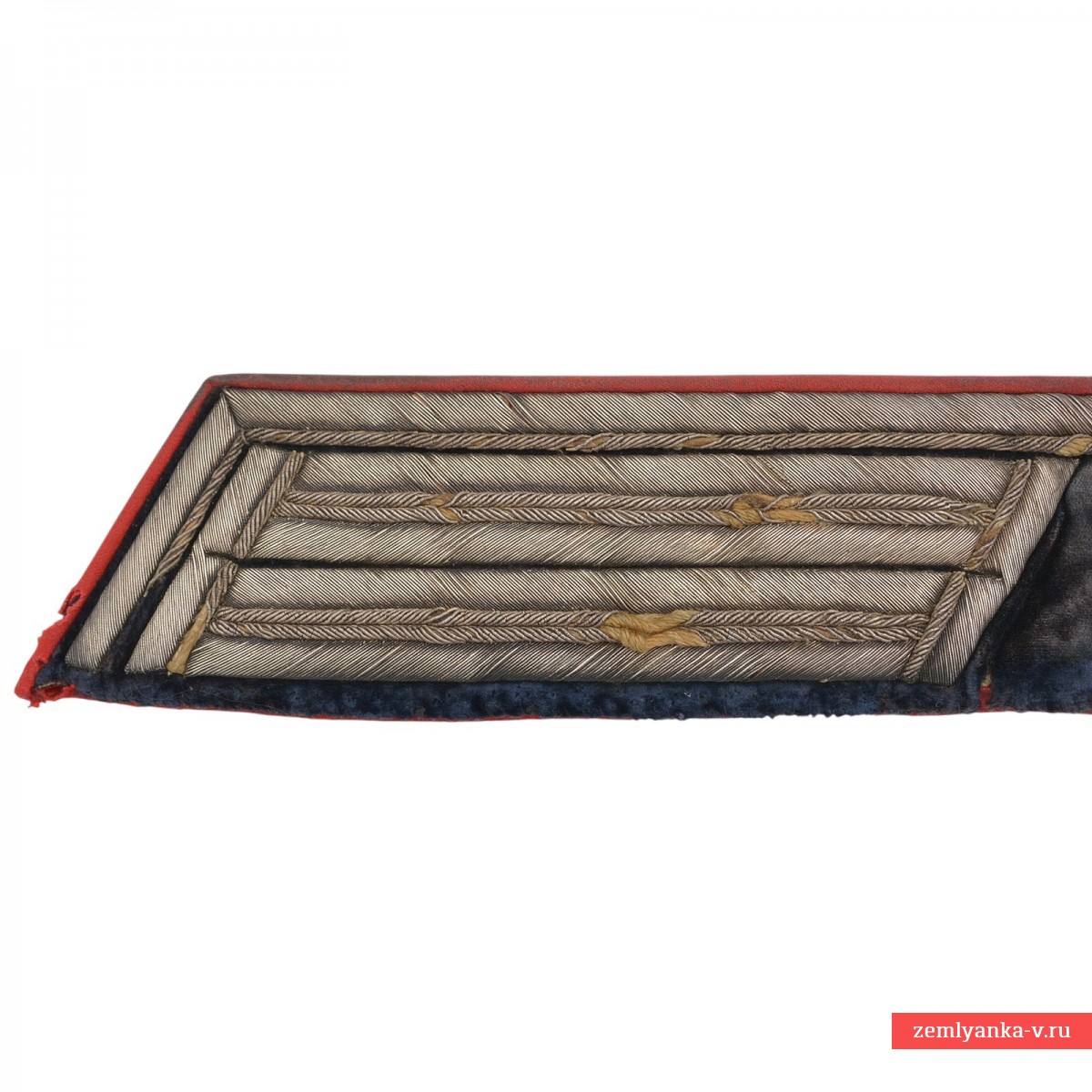 The ranks of the Main Engineering Directorate, renamed the Main Military Technical Directorate in 1913, were given the colors traditional for engineering troops: black velvet collar and cuffs, red edging on the top and bottom of the collar and on the top of the cuffs, silver metal device. Uniforms of the same color, but without red edging at the bottom of the collar, were assigned in 1906 to the ranks of the Main Directorate of the General Staff, which was in charge of military strategy and planning. Judging by the ratio of the height and length of the collar, it was made in the late 19th and early 20th centuries.