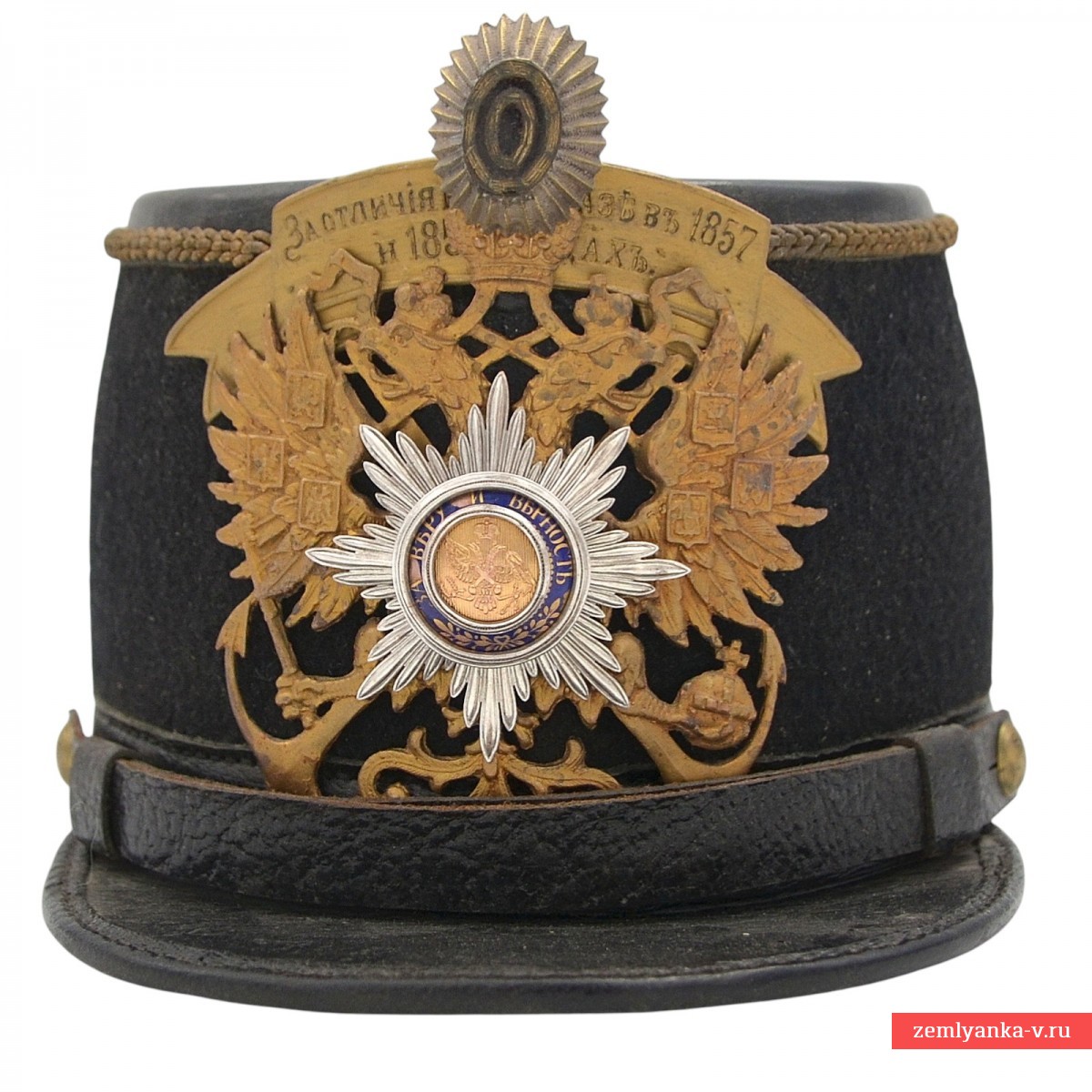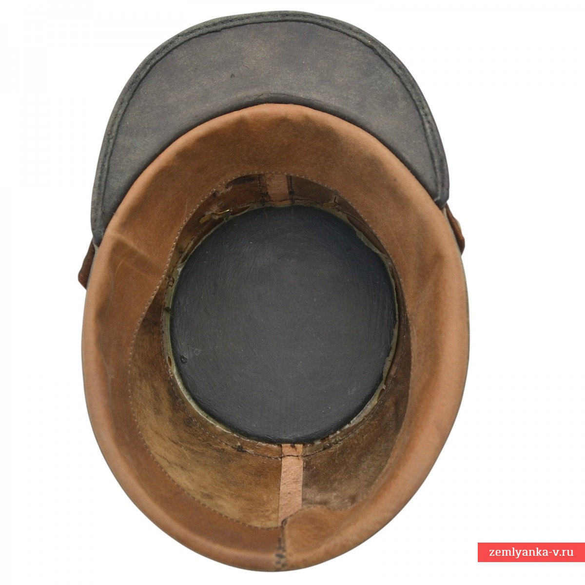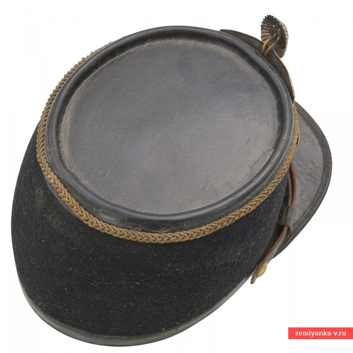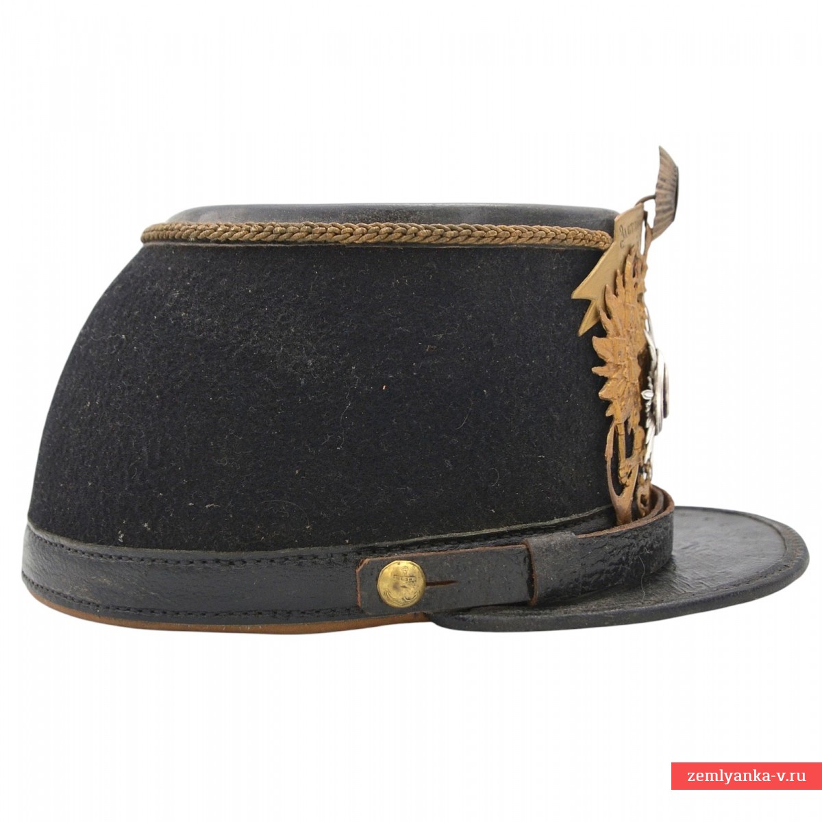 Leather, cloth, brass, enamel, electroplating. A perfectly executed replica in excellent condition. The only negative is two chips on the blue enamel in the center of the cockade. Museum quality of performance. Only 1 pc is available.