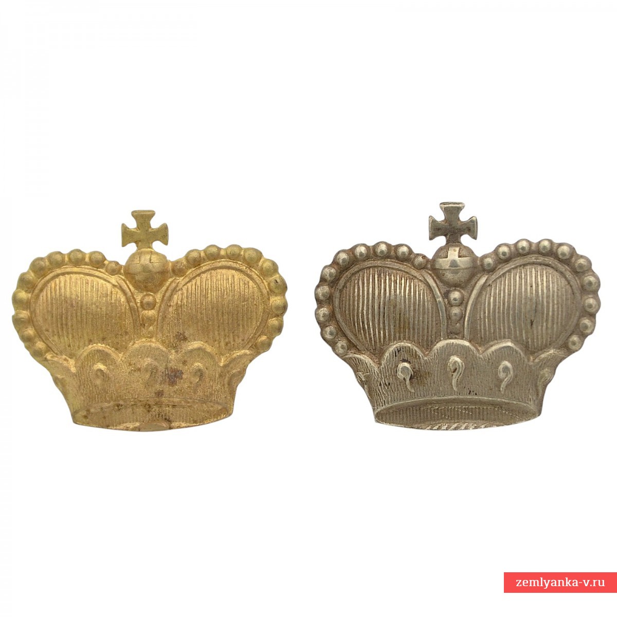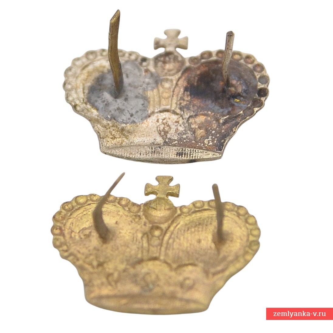 The lot consists of two identical crowns, one of which is gilded, the other is silver-plated. Both are made of bronze. The size of each crown is 20*25 mm. They are very similar in their execution style to grand ducal crowns, but we would appreciate your help in accurate attribution.