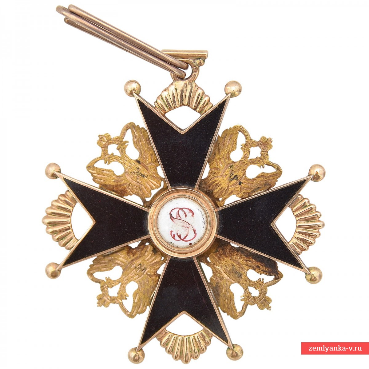 Since 1844, the monogram of the name of St. Stanislaus has been replaced by the black imperial Russian eagle on the badges of the order, which are awarded to persons of non-Christian faith.
