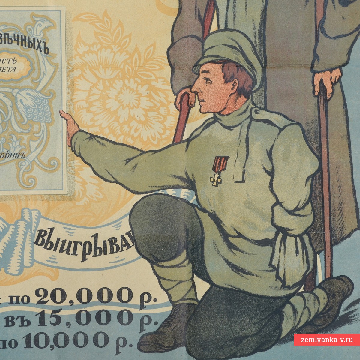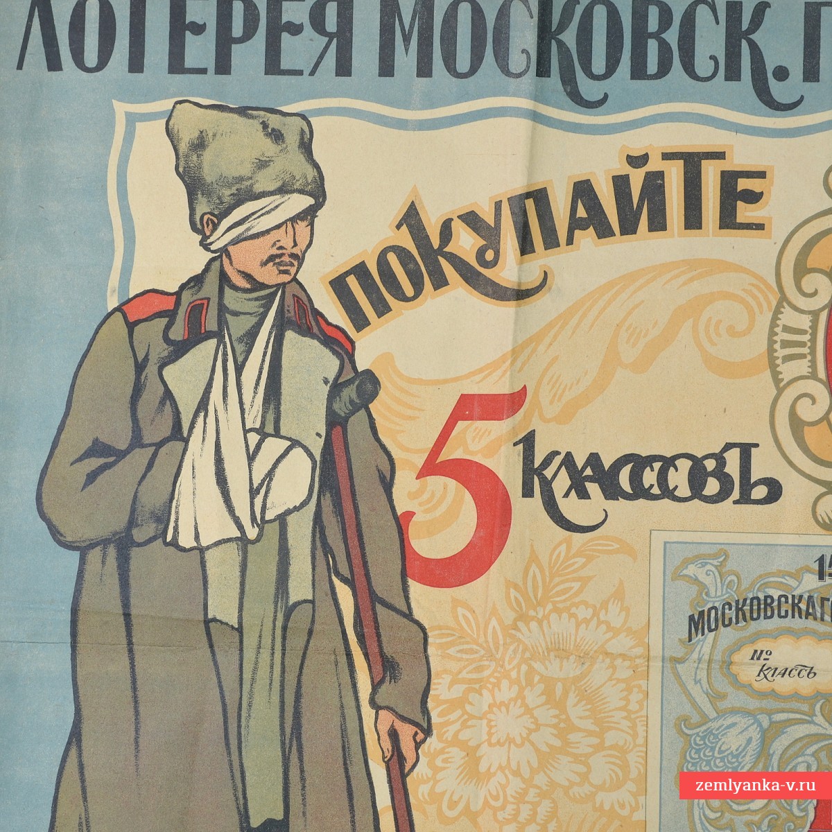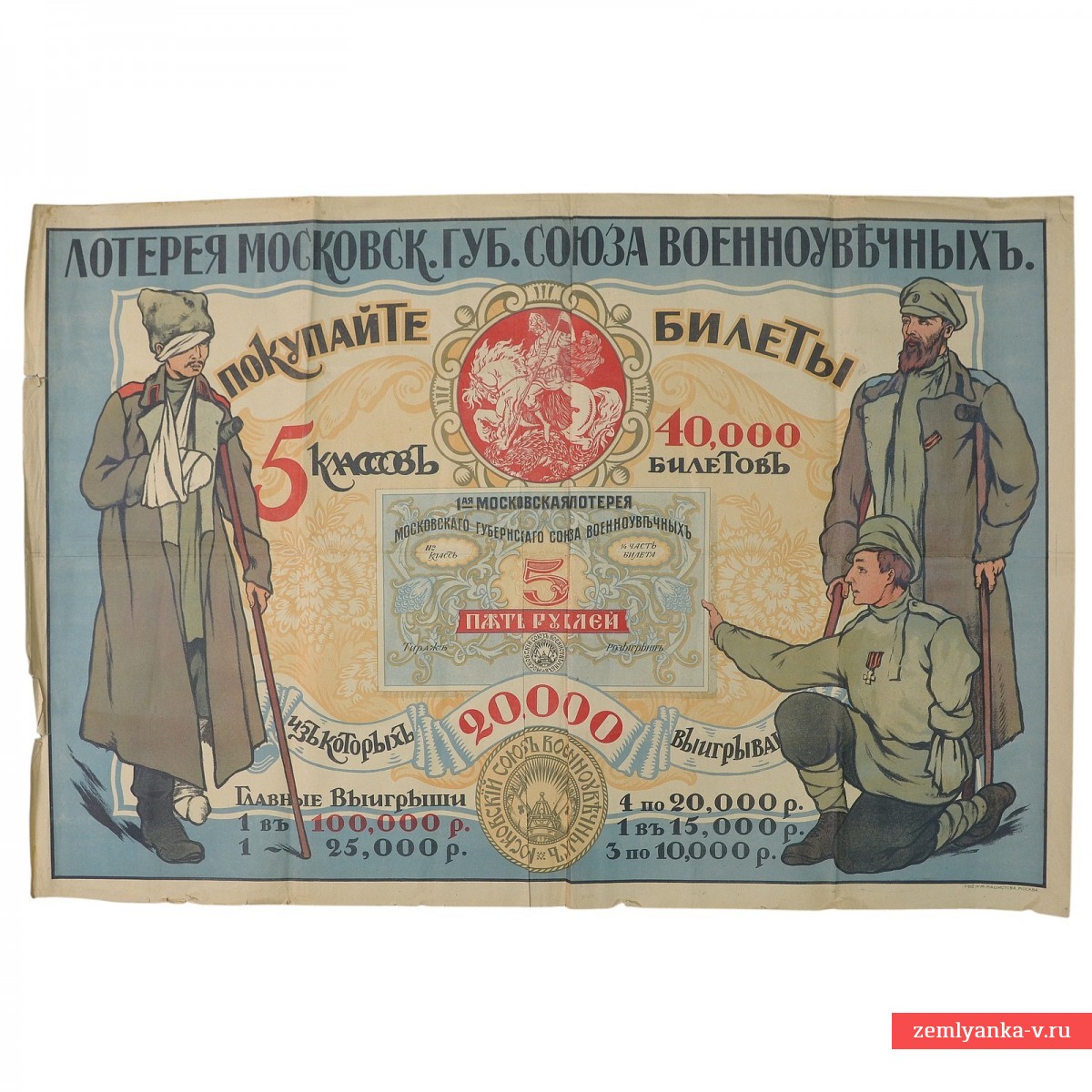 An original and extremely rare large-format poster produced during the Civil War in Russia (probably around 1918). The poster depicts wounded soldiers: on the left, leaning on a crutch with a bandaged arm, on the right, a sitting soldier with a medal and a soldier on crutches. This emphasized the charitable nature of the lottery — the fees were used to support disabled veterans. The lottery was conducted by the Moscow Provincial Union of Military Veterans. Such organizations were created to provide assistance to soldiers who were disabled during the First World War and subsequent conflicts. In the center of the poster is a lottery ticket worth 5 rubles (5th grade). The total number of tickets was 40,000. The poster promises large cash prizes, including: