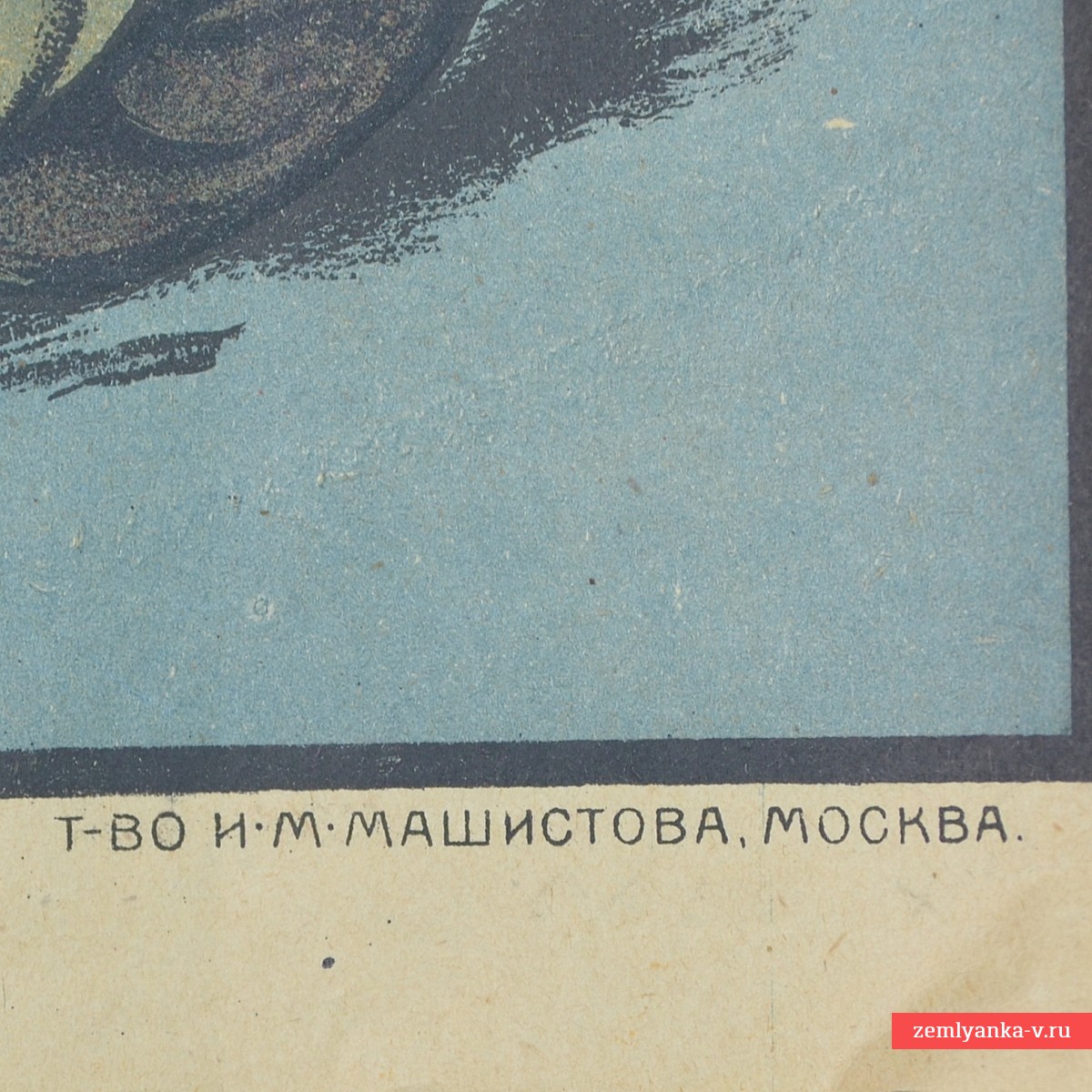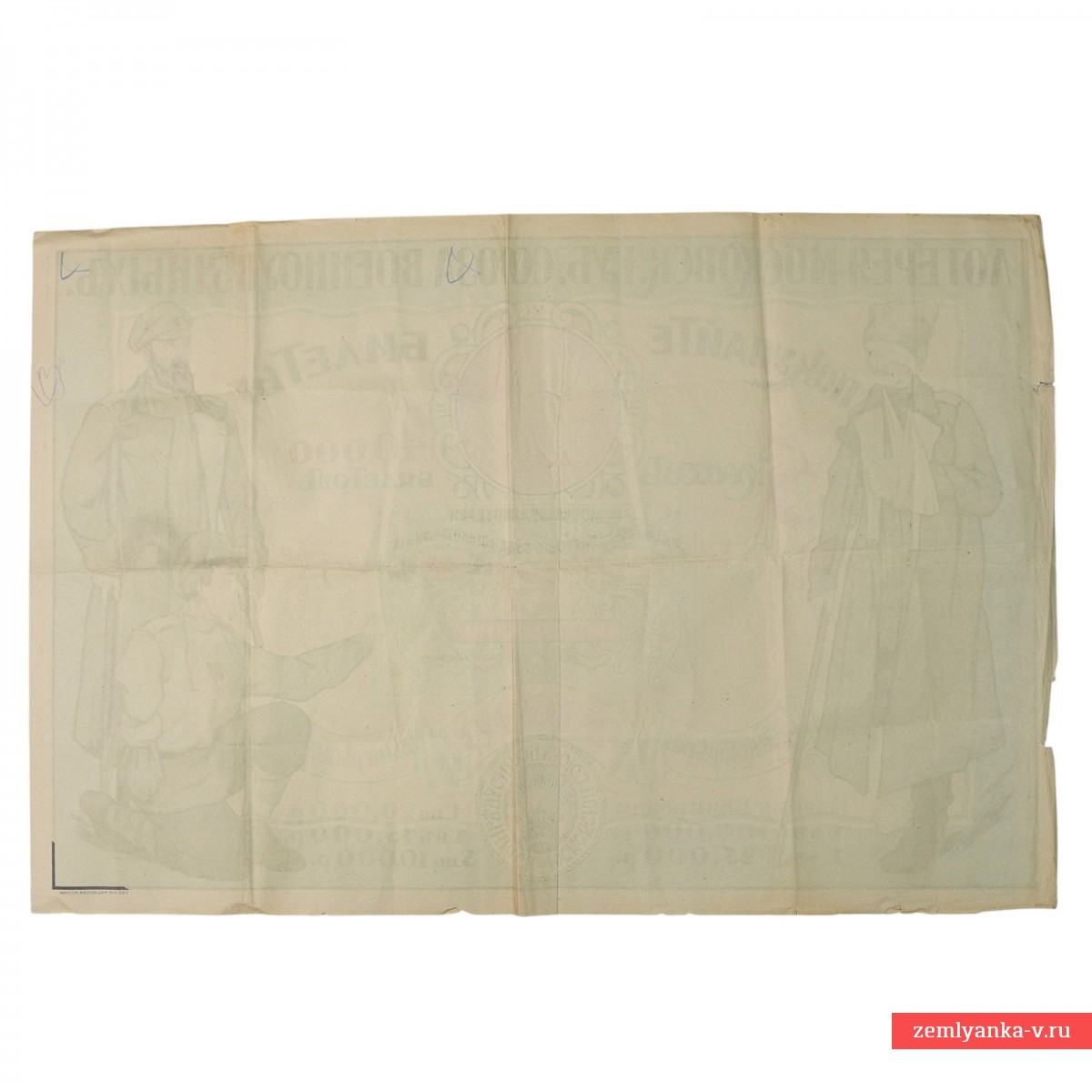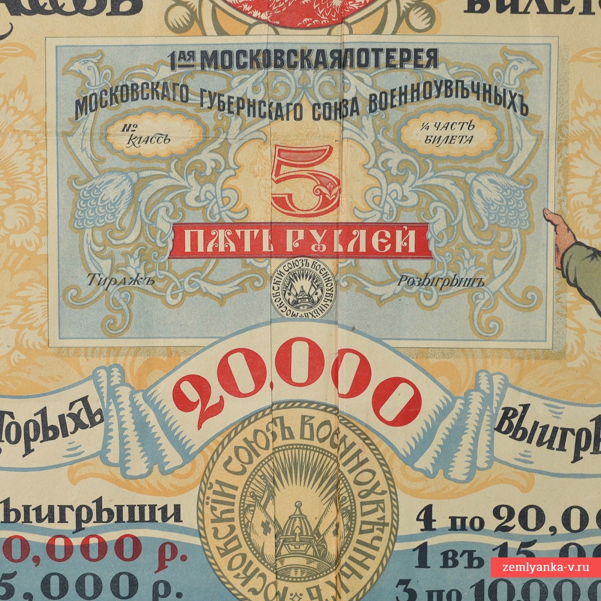 An original and extremely rare large-format poster produced during the Civil War in Russia (probably around 1918). The poster depicts wounded soldiers: on the left, leaning on a crutch with a bandaged arm, on the right, a sitting soldier with a medal and a soldier on crutches. This emphasized the charitable nature of the lottery — the fees were used to support disabled veterans. The lottery was conducted by the Moscow Provincial Union of Military Veterans. Such organizations were created to provide assistance to soldiers who were disabled during the First World War and subsequent conflicts. In the center of the poster is a lottery ticket worth 5 rubles (5th grade). The total number of tickets was 40,000. The poster promises large cash prizes, including: