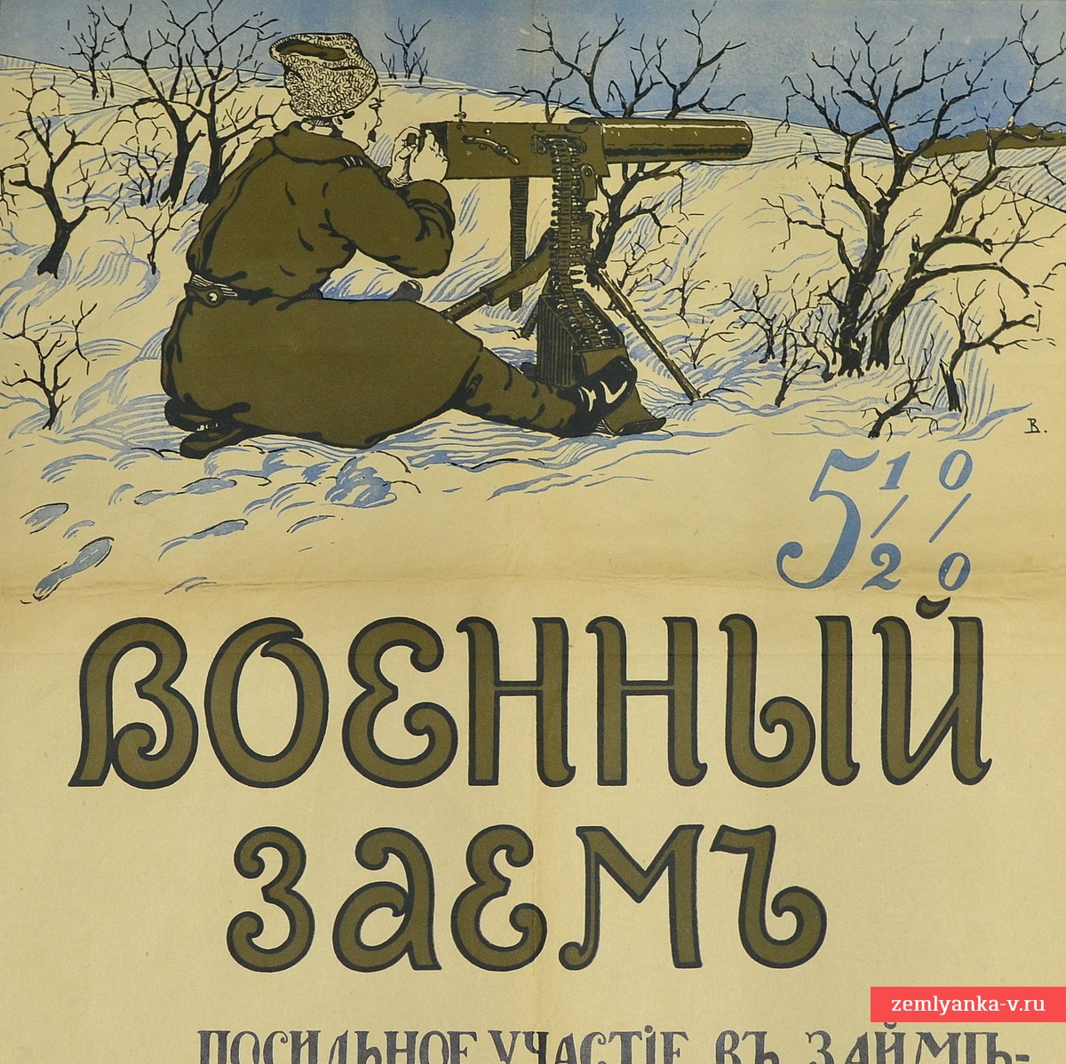An extremely rare poster in very good collectible condition. During the years of the First World War, first the Tsarist and then the Provisional Government persistently tried to attract broad segments of the population to finance military operations. From the autumn of 1914 to the summer of 1917, seven internal loans were made. Their results invariably turned out to be lower than the initial calculations, but loans brought more than 10 billion rubles to the treasury of the belligerent state, covering about 20-25% of military expenditures. Initially, such loans within the country were carried out according to the usual pre–war methods - bonds were sold by commercial banks and a network of savings banks of the State Bank. It was only by the end of 1915 that the upper echelons of the Russian Empire began to realize that the previous financial schemes did not work. Surprisingly, only the fourth domestic loan since the beginning of the World War was officially called "military". And it was only in the thirteenth month of an unprecedented global conflict that the state for the first time addressed its subjects with an explanation of the meaning and essence of internal loans for the needs of the army and defense. Booklets and propaganda brochures "What you need to know about the 1915 war loan" were released in large circulation. For the first time in the history of public finance in Russia, visual agitation was resorted to – colorful posters "Buy a military 5.5% loan" appeared on the streets of large cities, postcards with identical images were also distributed in stores. One of these posters is right in front of you. The size is 505*605 mm. Guarantee of authenticity.