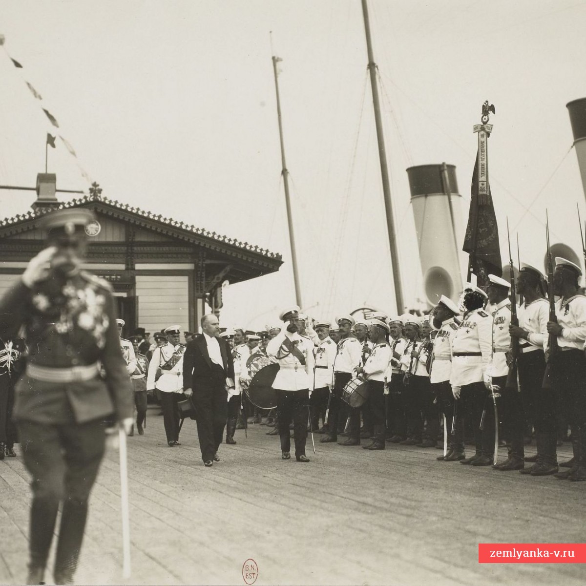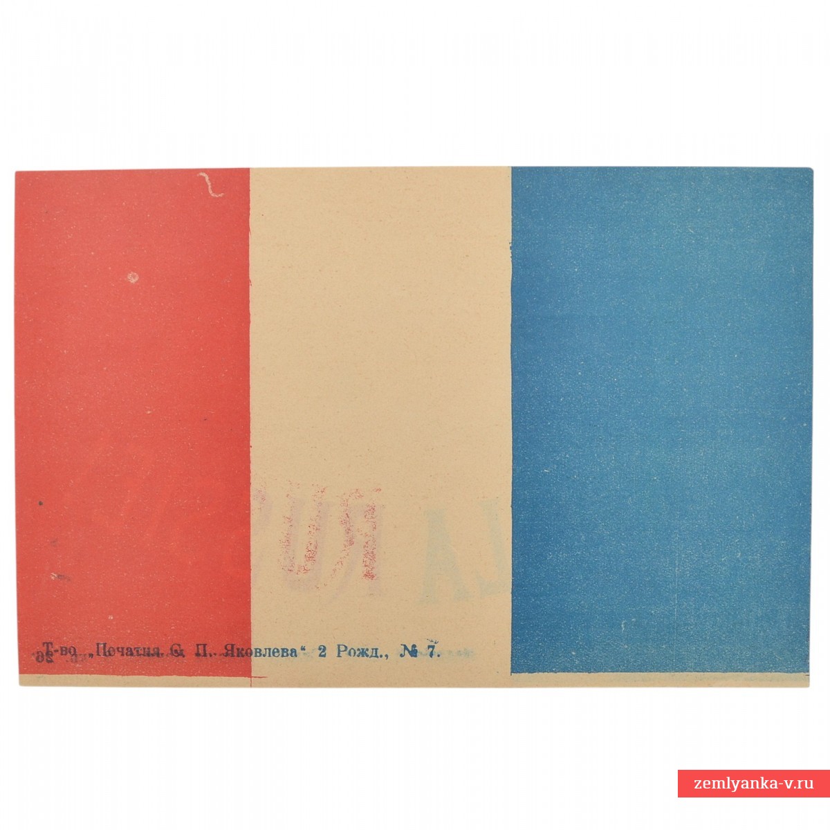 The original flag, garlands of which decorated the streets of St. Petersburg during the visit of French President Poincare to Russia in 1914. Printing with paints. This visit was a key diplomatic event on the eve of the First World War, and confirmed the strength of the Franco-Russian alliance (Entente) in response to the worsening relations with Germany and Austria-Hungary. The visit included talks with Nicholas II in Peterhof. The size is 125*195mm. Printed by the partnership "Printing house S. P. Yakovleva." Guarantee of authenticity.