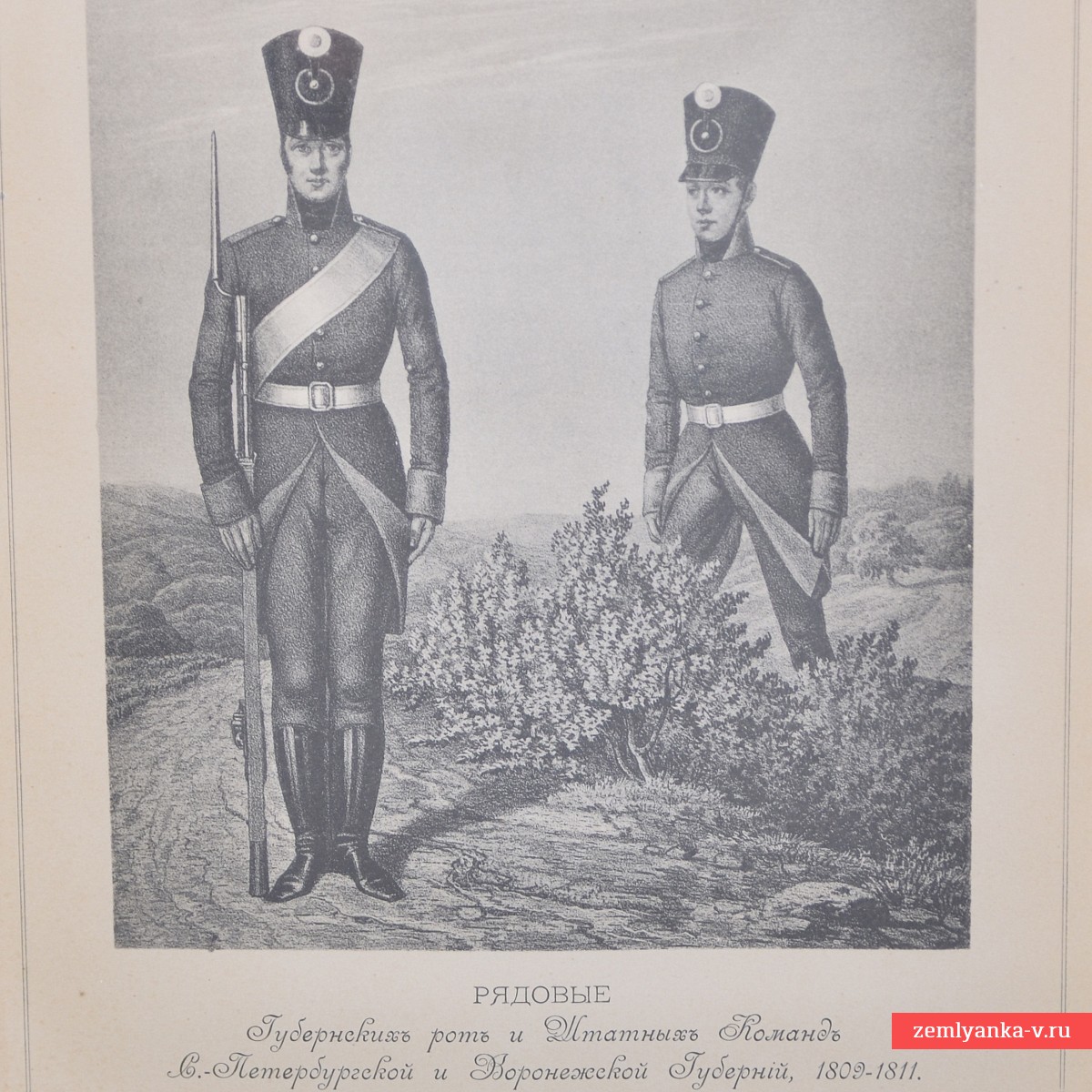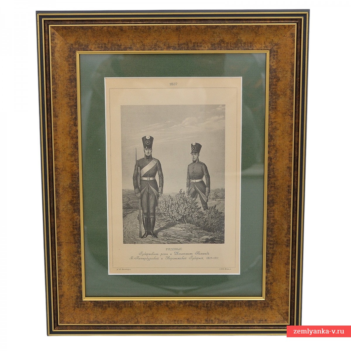 An original lithograph of the historical description of the Russian troops' armament clothing. Rank-and-file of provincial companies and staff teams of the St. Petersburg and Voronezh province 1809-1801 . The lithograph is mounted in a frame, in good collector's condition. The size of the lithograph is 17.5 x 26.5 cm. The frame size is 33.5 x 41.5 cm. A rare plot. Guarantee of authenticity.