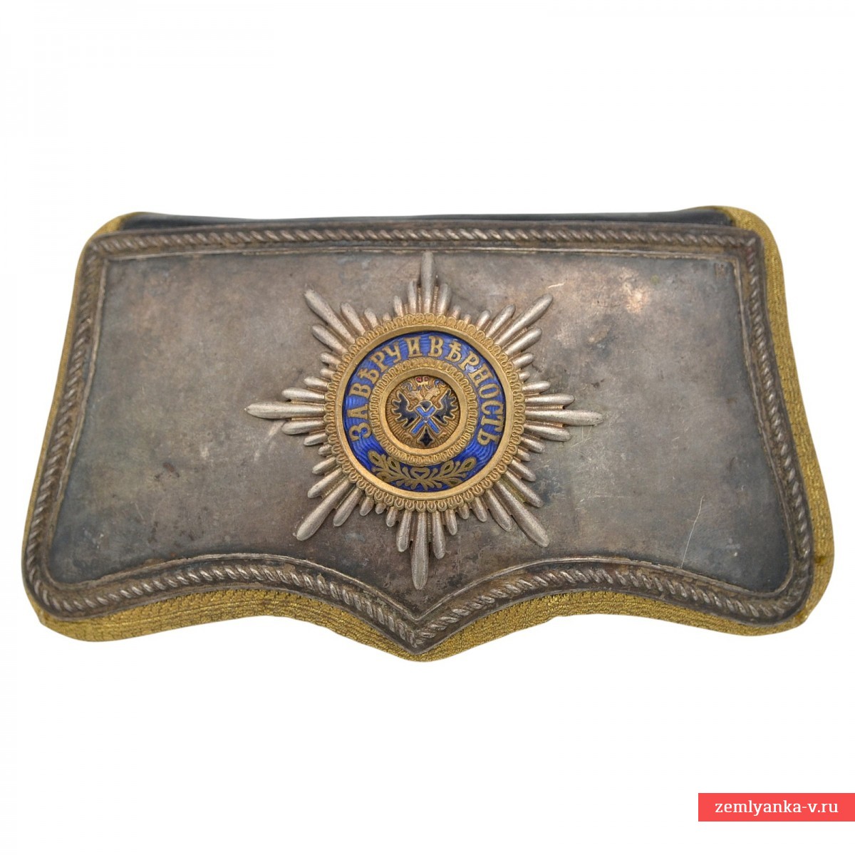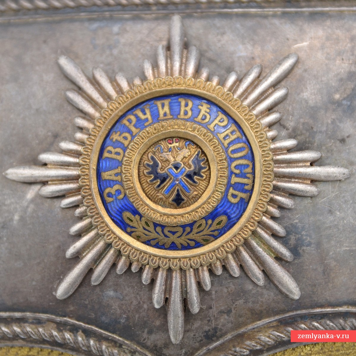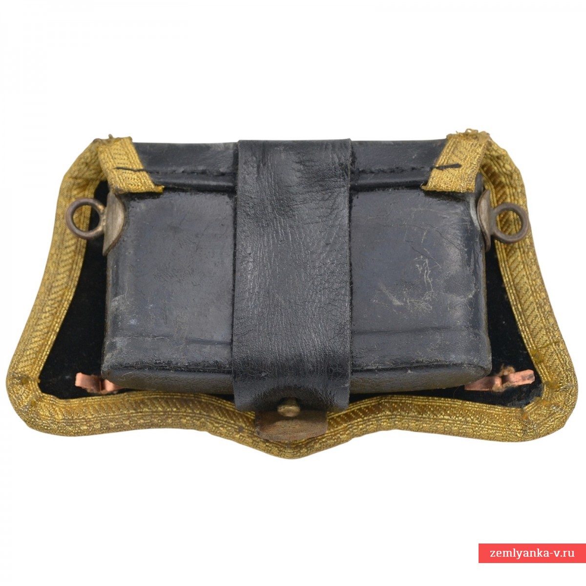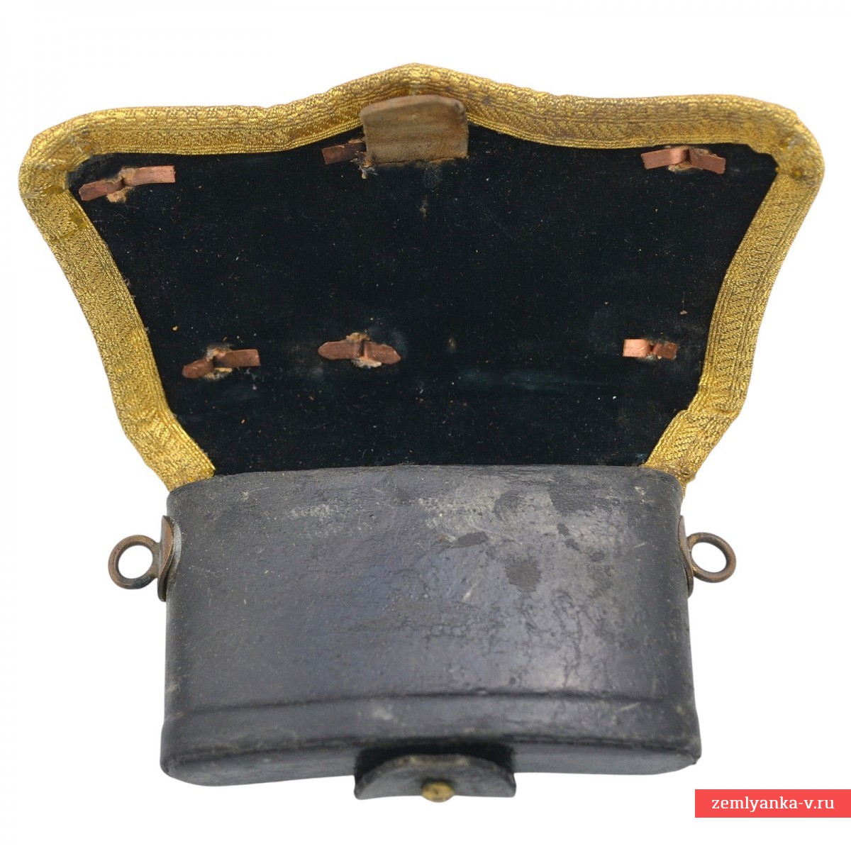 In 1859, for all officers of the cavalry and horse artillery, both guards and army, ladders with a silver lid of a single pattern were introduced: curly, edged with stamped twisted edging, with rounded corners and a toe in the lower part. As fittings, the lid was attached to: in the army cavalry, the state coat of arms in the color of the metal device, in the Guards, the silver–plated star of the Order of St. Andrew, one of the symbols of the Russian Guard. In 1889, the rectangular body of the old-style sling, to the bottom of which the ends of the sling were fastened, was replaced with a new oval one, with rings on the side walls, to which shaped hooks were attached at the ends of the sling. The body was covered with thin black leather. Since revolvers with a metal unitary cartridge have long served as firearms for officers, paper cartridge slots have disappeared from the case, and mordants (needles for cleaning the firing hole of the pistol) have disappeared from the sling. In this form, the officers' mess existed until 1917. In the early twentieth century, in order to reduce the cost, they were often made of base metals, silvered and gilded. An idea of the rarity of the object is given by the fact that as of 1909 the total number of officers in the Guards cavalry did not exceed 750-800 people. Lyadunka underwent restoration – the leather and braid were replaced, the lid and base were genuine.