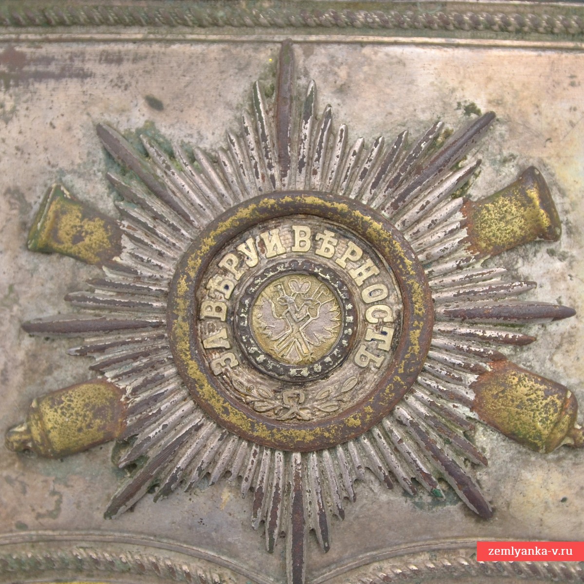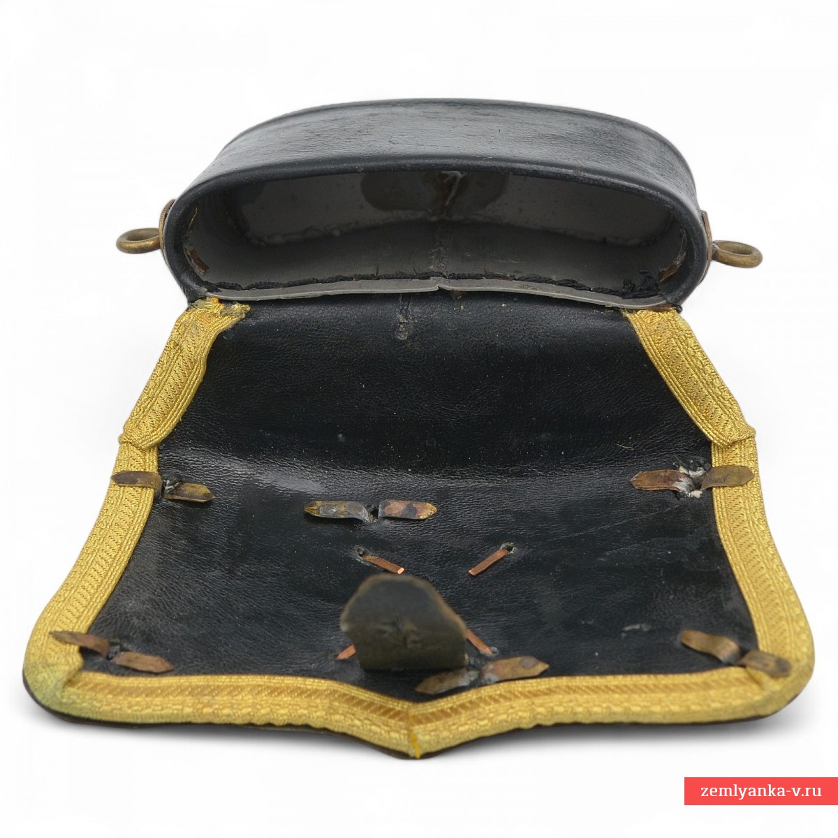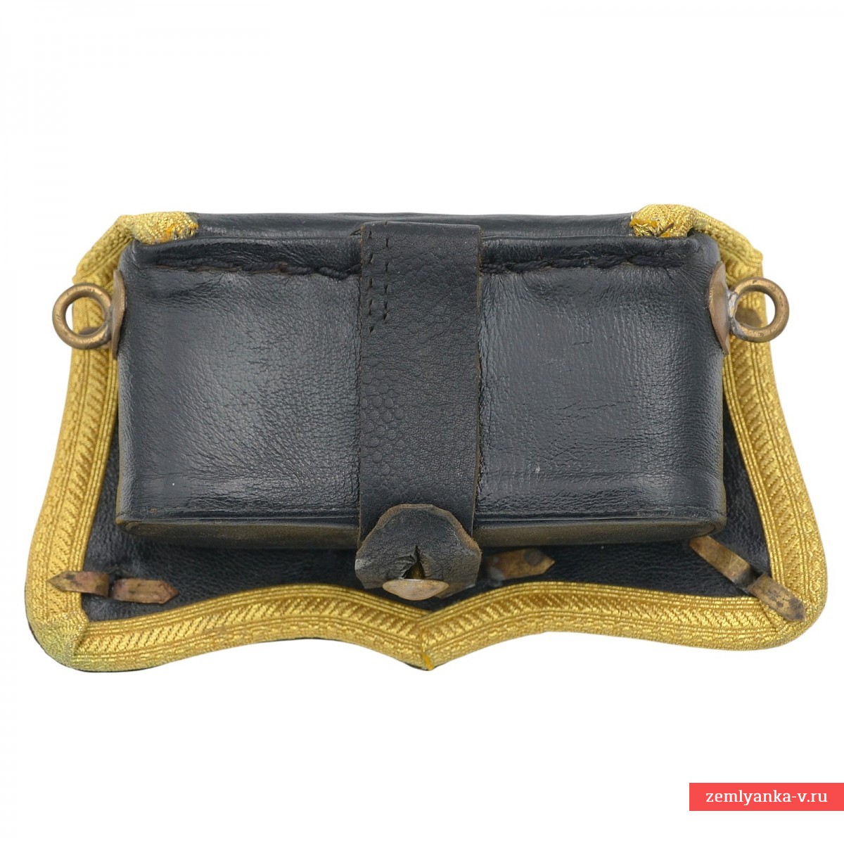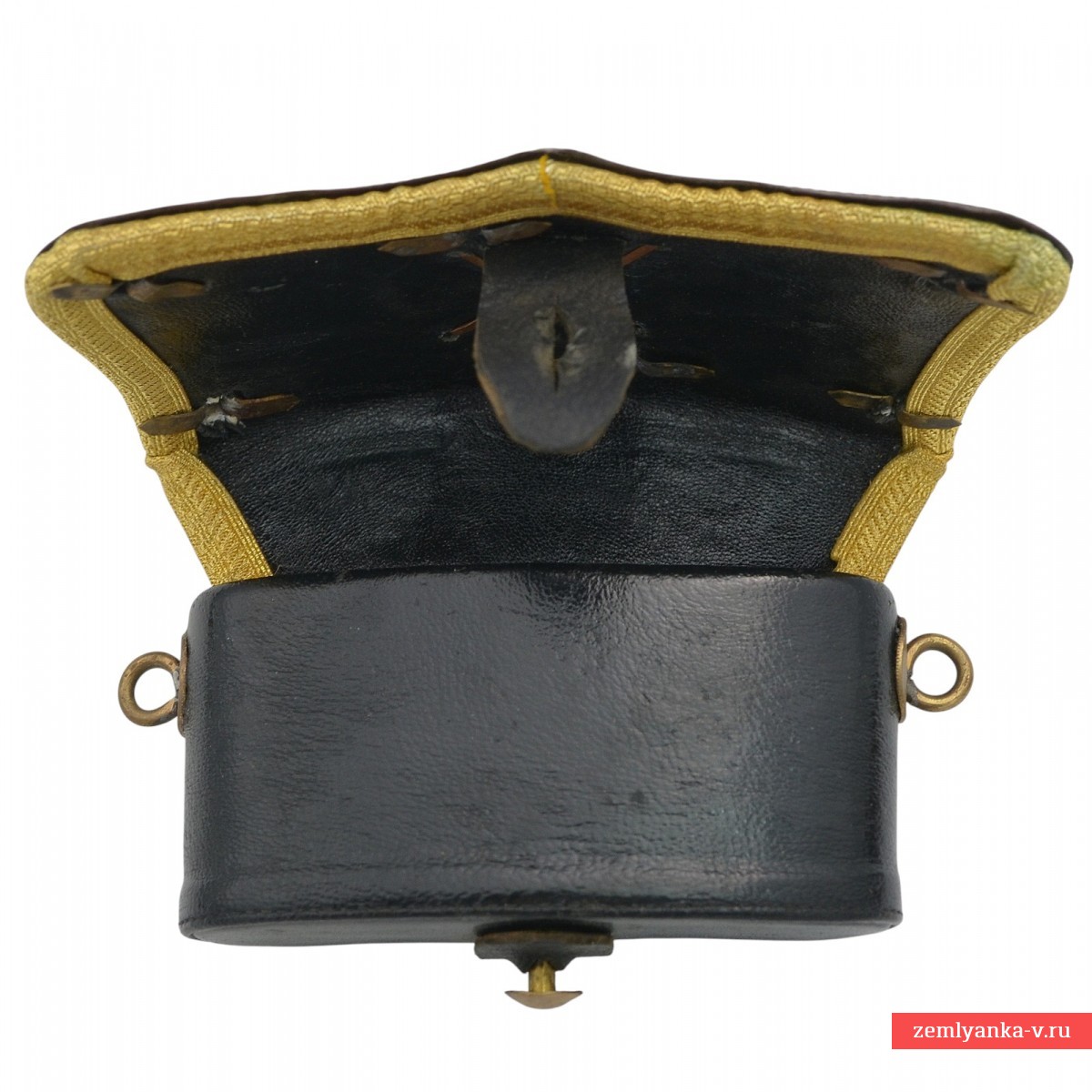 In 1859, for all officers of the cavalry and horse artillery, both guards and army, ladders with a silver lid of a single pattern were introduced: curly, edged with stamped twisted edging, with rounded corners and a toe in the lower part. As fittings, the lid was attached: in the army cavalry, the state coat of arms was the color of the metal device, in the Guards, the silver–plated star of the Order of St. Andrew, one of the symbols of the Russian Guard. In horse artillery, the coat of arms or star was complemented by the image of gilded crossed cannons. In 1889, the rectangular body of the old-style sling, to the bottom of which the ends of the sling were fastened, was replaced with a new oval one, with rings on the side walls, to which shaped hooks were attached at the ends of the sling. The body was covered with thin black leather. Since revolvers with a metal unitary cartridge have long served as firearms for officers, paper cartridge slots have disappeared from the case, and mordants (needles for cleaning the firing hole of the pistol) have disappeared from the sling. In this form, the officers' mess existed until 1917. In the early twentieth century, in order to reduce the cost of covers and fittings, they were often made of base metals, silvered and gilded. The most rare are the Guards horse artillery rifles, in which, as of 1909, there were only 62 officers. Lyadunka underwent restoration – the leather and braid were replaced, the lid and base were genuine.
