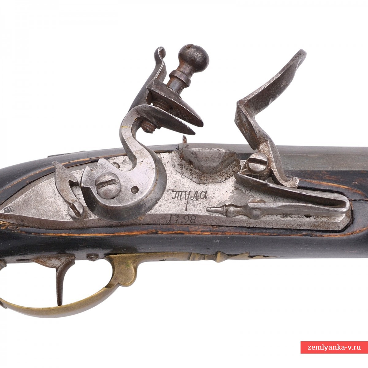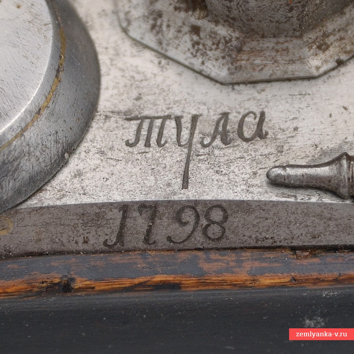 The barrel is steel, 8-faceted in cross section, with a shank in the breech for attachment to the bed. The bore has 8 rifling holes. The sights consist of a brass front sight in the front of the barrel and rear sight. On the breech of the barrel is a partially worn out stamp of the acceptance of the Ministry of War in the form of an eagle in a circle, as well as an "R". The lock is flintlock, battery type, mounted on the right side. In some sources, it is called the French castle, or the French-type castle (sample) due to the fact that its inventor is considered to be the French royal artist and gunsmith Marin le Bourgeois (Marin le Bourgeoys 1550-1634) from the Norman town of Lisieux. The inventor successfully combined the positive features of the Mediterranean and Baltic castles into a single design. The keyhole is engraved with "Tula 1798" (the stamp of the Tula Arms Factory and the release date of the product). The trigger is made of steel, reinforced with a single screw. The inspector's mark "NK" (?) is pierced in the left part of the key board. The trigger has a safety catch. The trigger is almost straight in shape, made of steel. The trigger guard is brass, oval in shape. There are a number of inspection stamps on the trigger guard: "PMF" in a rectangle, etc. The inspector's stamp "SK" is punched in a rectangle on the keyhole. The bed is wooden, the forearm is the entire length of the trunk. The barrel is fixed on the bed with a screw on the shank and 2 latches in the forearm. The butt is smooth, and has a niche for accessories on the right side. The butt plate is brass, L-shaped.
