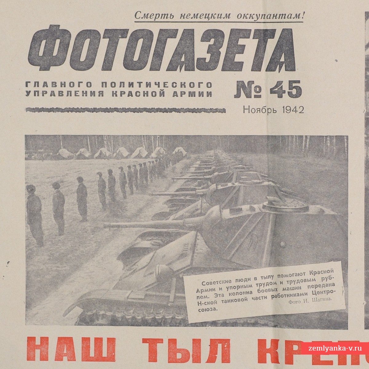Paper. The photo newspaper is in good collector's condition. The photo shows a tank column handed over by employees of the Central Union tank unit. The picture highlights the unity of the front and rear. The slogan "Death to the German occupiers!" is printed in large print at the top of the newspaper. The issue is dedicated to the heroic work of the Soviet home front and assistance to the front. The text under the photo reads: "Soviet people in the rear are helping the Red Army with hard work and labor rubles. This column of combat vehicles was transferred to the nth tank unit by employees of the Central Union. Photo by I. Shagin." The slogan "OUR REAR" is printed in large red letters at the very bottom of the newspaper. STRONG." Guarantee of authenticity.