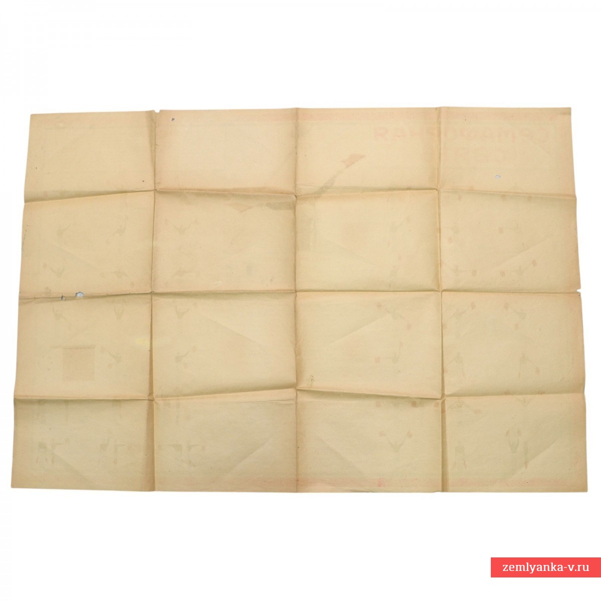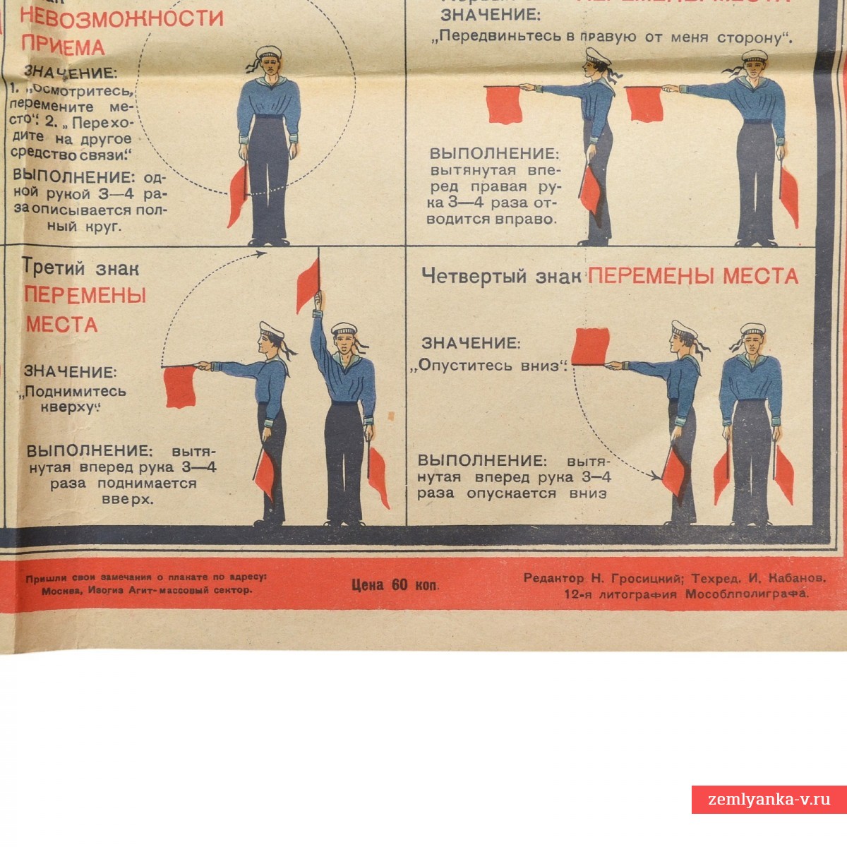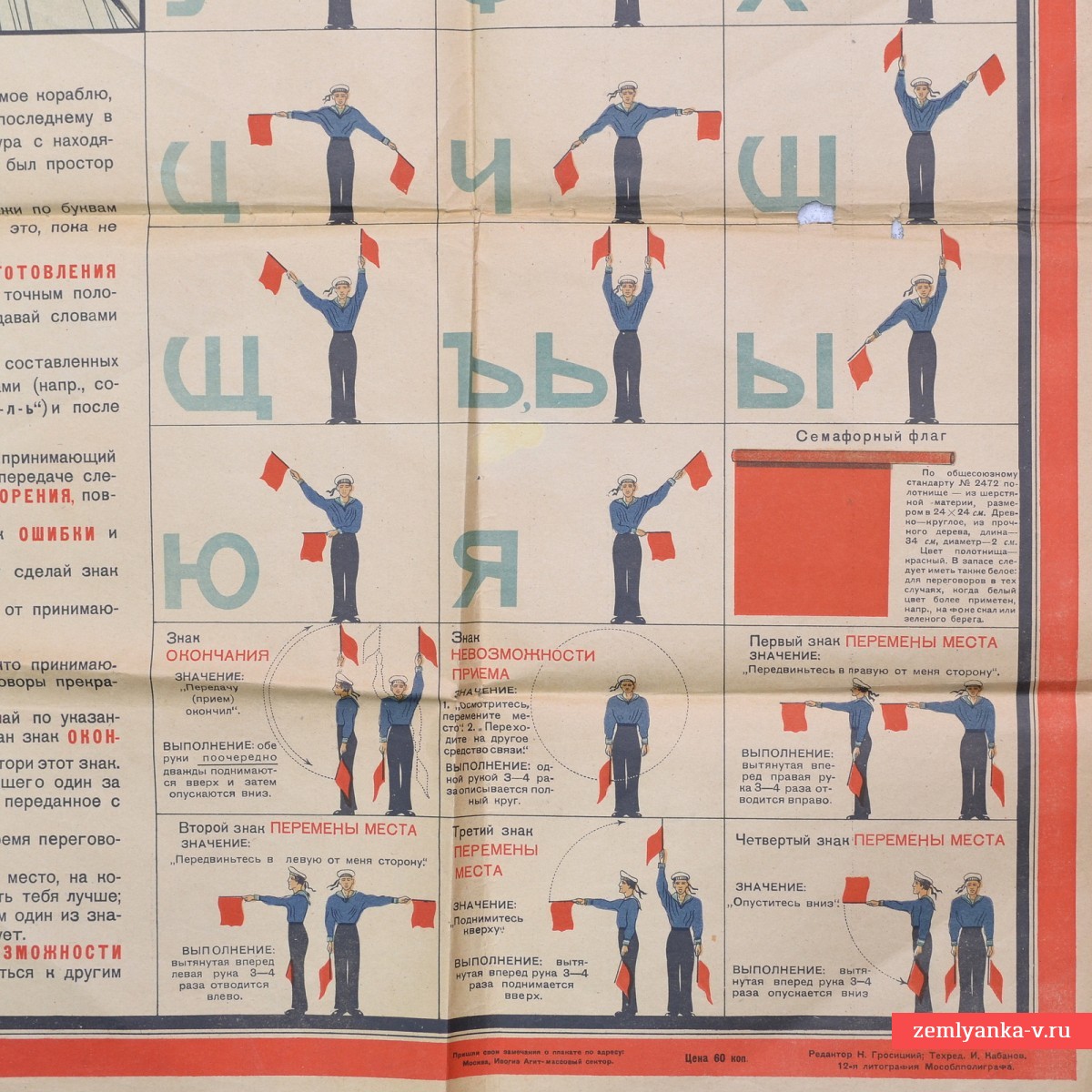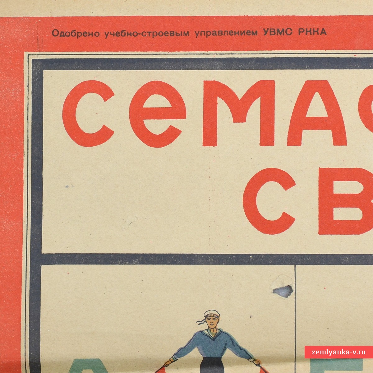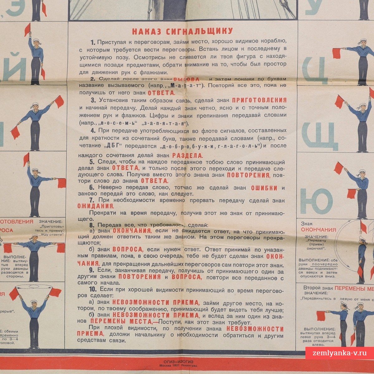 Paper. The poster is in good collector's condition. The central part of the poster shows all the letters of the alphabet, each of which corresponds to a certain position of the signalman's hands with red flags. There are also service signs and signs of a change of location on the poster. The poster serves as a training manual for signalmen and sailors, visually showing gestures with flags corresponding to the letters of the Russian alphabet. The modern Russian semaphore alphabet was developed in 1895 by Vice Admiral Stepan Osipovich Makarov. Guarantee of authenticity.