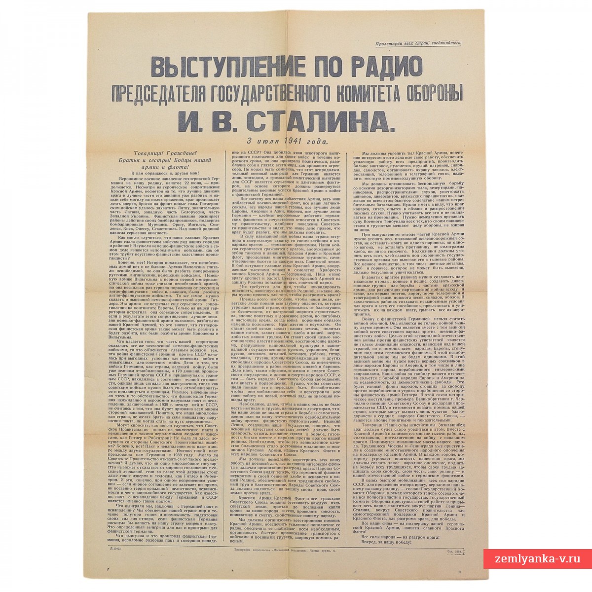 An extremely rare poster, printed on July 3, 1941. The size is 60x42 cm. The poster depicts Stalin's address to the people. This was his first address since the beginning of the war, and it was only on the 12th day. (On June 22, V. M. Molotov spoke). The speech was broadcast on all radio stations of the Soviet Union and was later published in all major newspapers, including Pravda. Guarantee of authenticity.