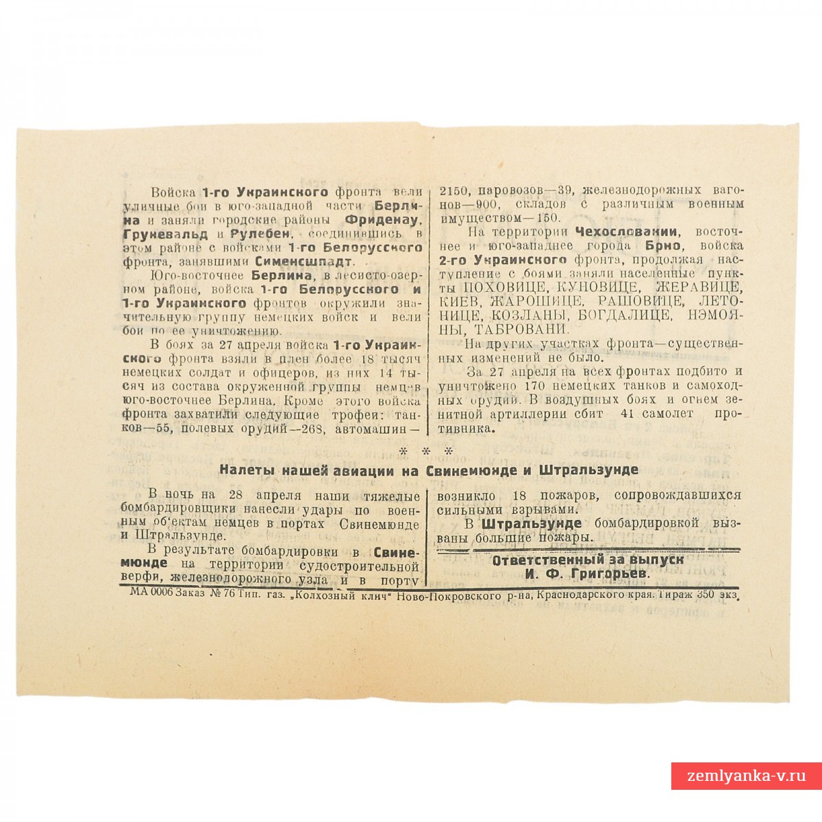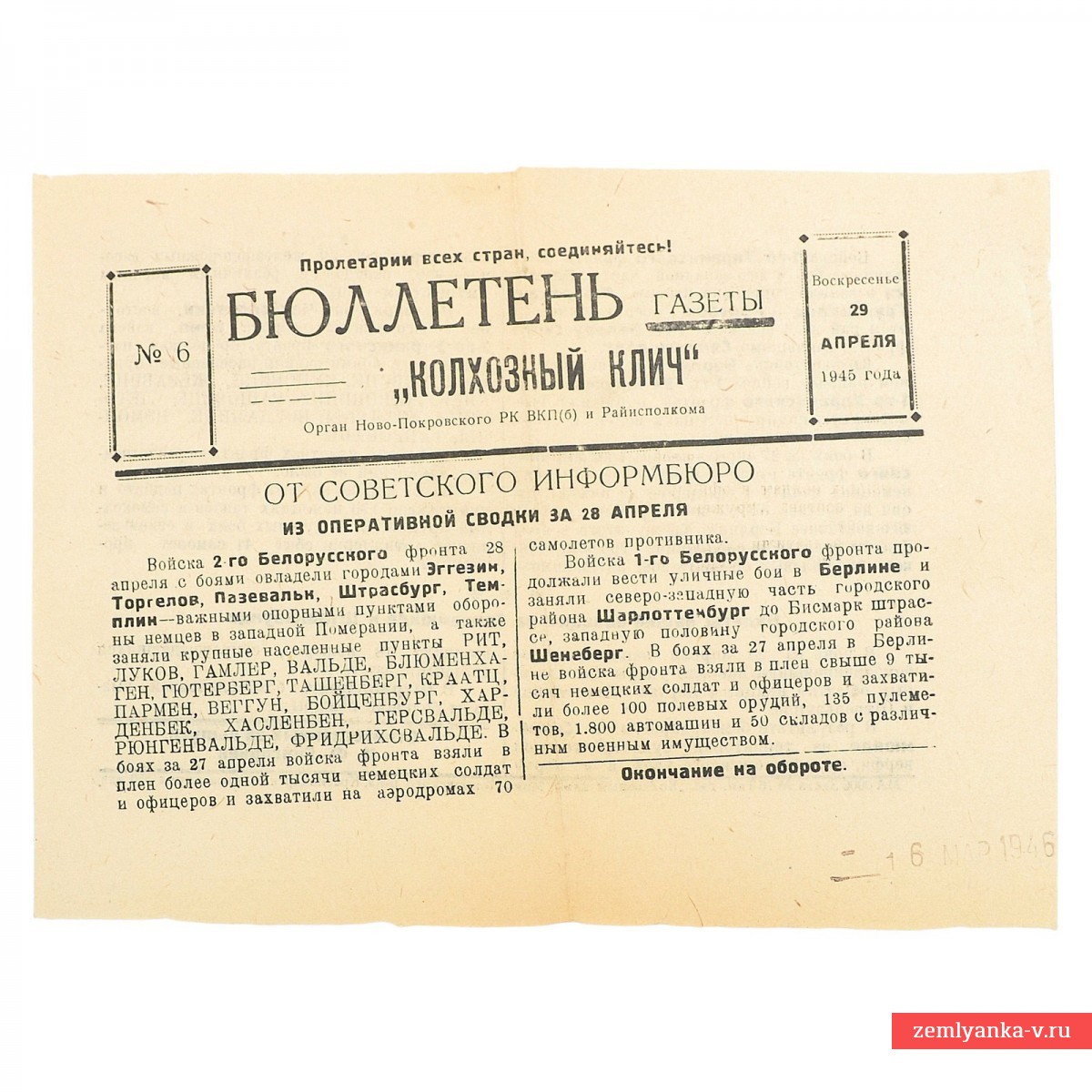 In the context of wartime newspapers, "bulletins" were small, promptly issued information leaflets or special issues that complemented the mainstream press. Although the term "bulletin" is not widely used, it describes the format of news releases that were produced in addition to major newspapers during the Great Patriotic War. The bulletins could contain brief but important reports on the course of the fighting in order to inform soldiers and the civilian population in conditions of limited access to the main press. They were published in addition to major newspapers, which were published in large numbers and covered various aspects of the country's life during the war. In addition to the news, the bulletins could be used to distribute propaganda materials, call for patriotism, and mobilize forces at the front and in the rear. During the Great Patriotic War, many different publications were produced, including partisan newspapers, front-line and army newspapers, as well as leaflets distributed behind enemy lines, and all of them could have their own "bulletins".