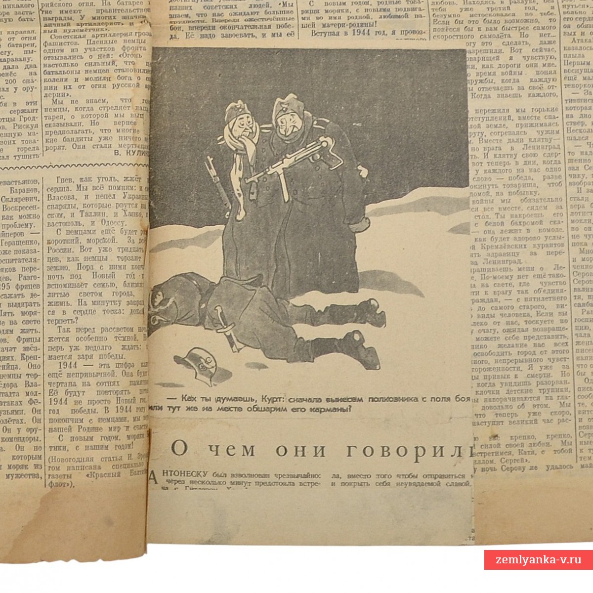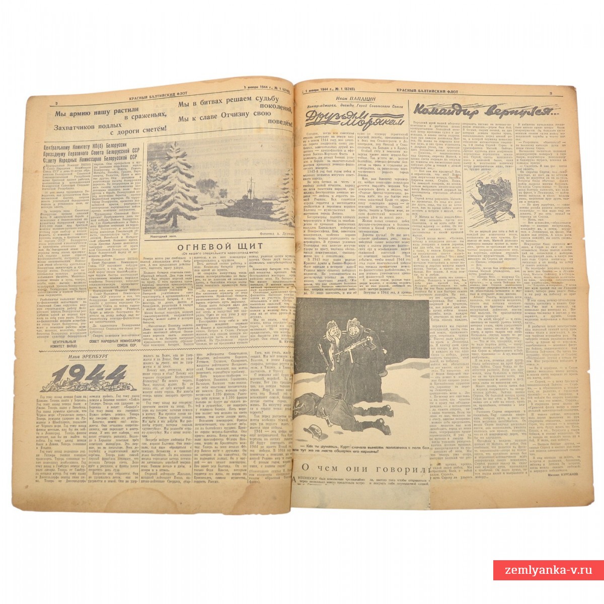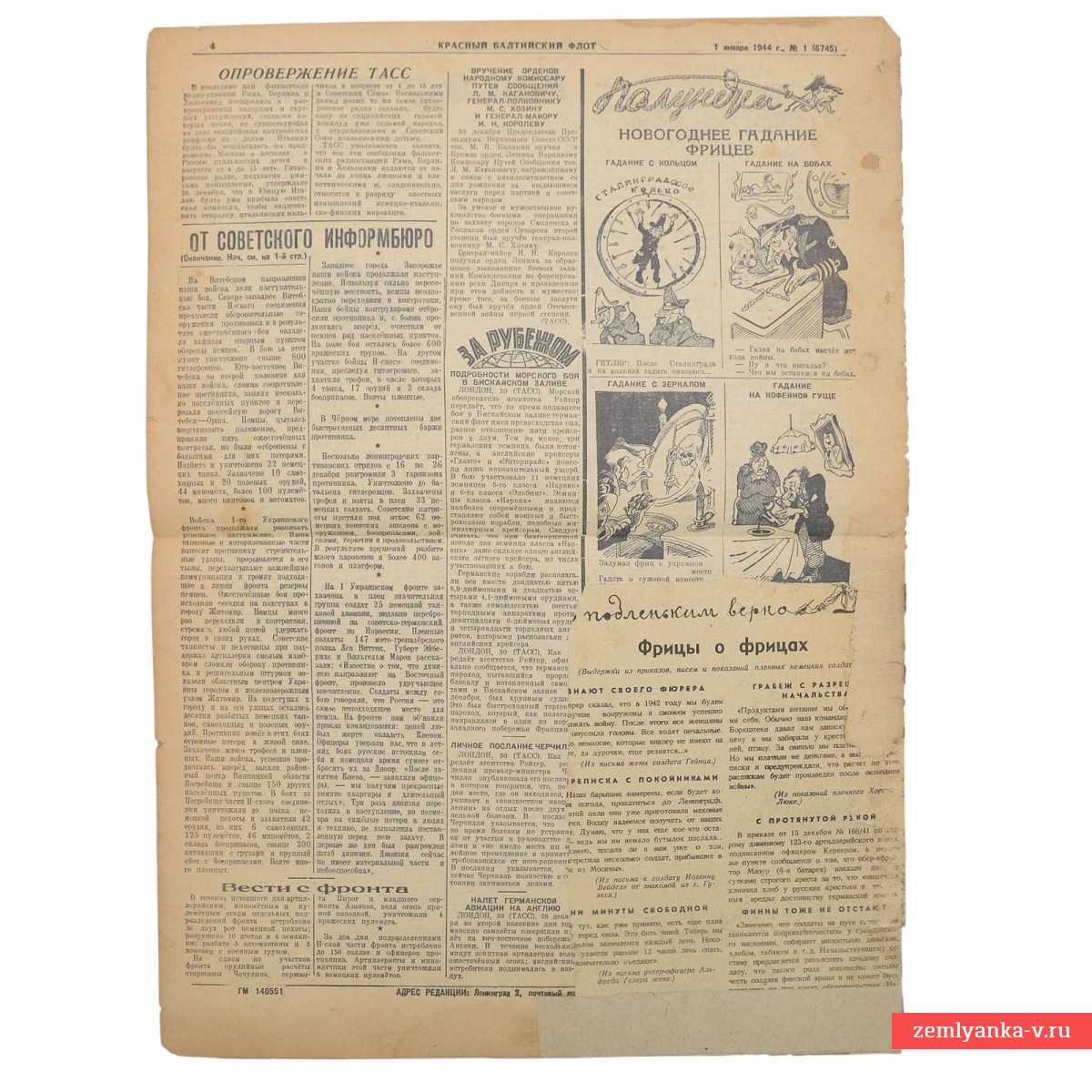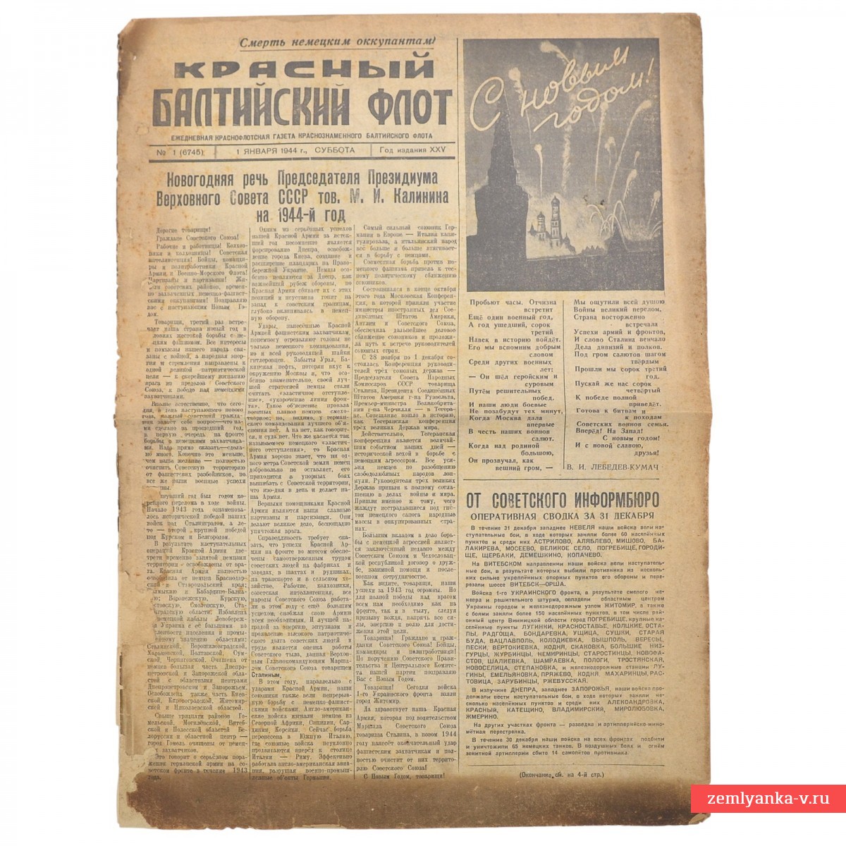 Paper. The newspaper is in good collector's condition. The size is 253*174mm. The traditional New Year's speech by Chairman of the Presidium of the Supreme Soviet of the USSR M. I. Kalinin, dedicated to the results of 1943 and the tasks for 1944, is published on the front page. The speech noted the successes of the Red Army, such as the victory at Stalingrad, the Battle of Kursk, the crossing of the Dnieper and the liberation of Kiev, as well as the successes of the Allies and the Tehran Conference. In the right part of the strip there is a poem by V. I. Lebedev-Kumach with New Year's greetings and the call "Forward! To the West!" There is an operational summary from the Soviet Information Bureau for December 31, which reports on fighting west of Nevel and the occupation of more than 60 settlements. Guarantee of authenticity.