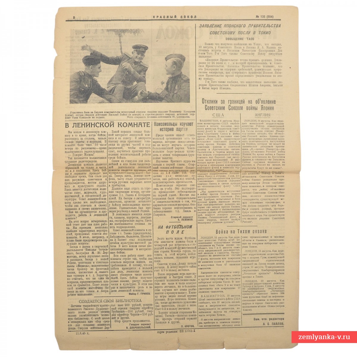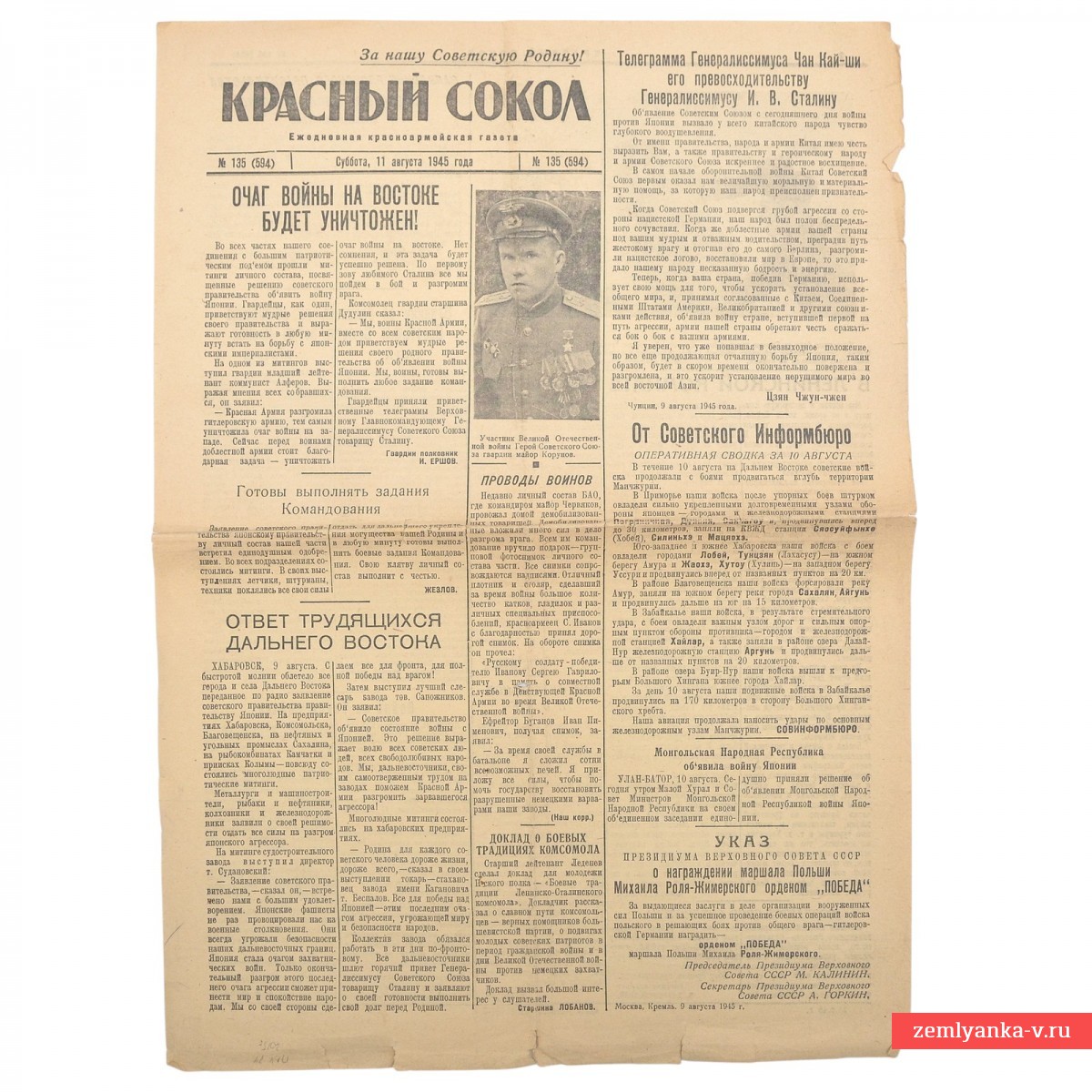 The presented newspaper was the official press organ of the People's Commissariat of Defense of the USSR and was intended for long-range aviation units. The main headline reads: "The hotbed of war in the East will be destroyed!" The articles are devoted to the entry of the USSR into the war with Japan, which happened on August 8, 1945, in order to eliminate the last hotbed of World War II and fulfill allied obligations. Format A3. 2 strips. Issue topics: