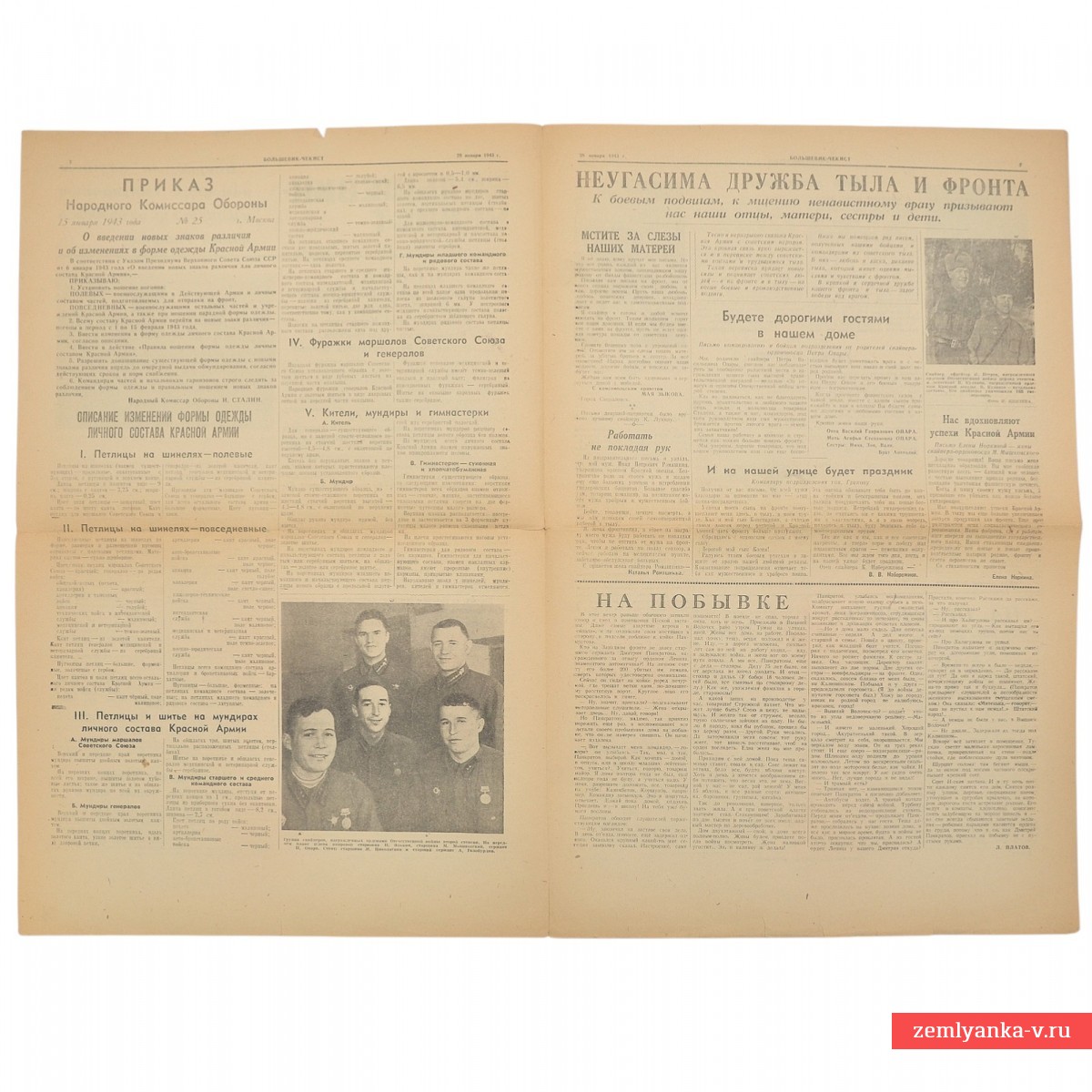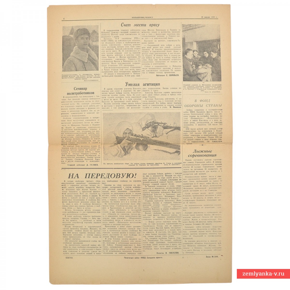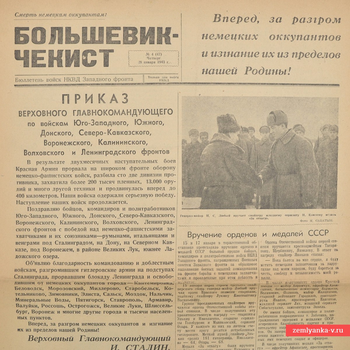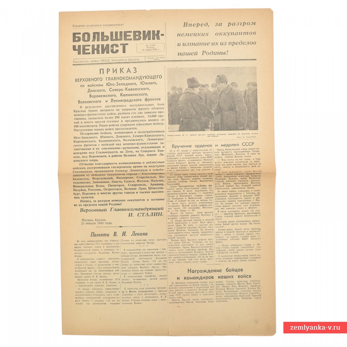 This is the bulletin of the NKVD troops of the Western Front, published during the Great Patriotic War. The central place is occupied by the order of I. V. Stalin dated January 25, 1943, dedicated to the successes of the Soviet troops on a number of fronts (Southwestern, Southern, Don, etc.). The text notes the breakthrough of the enemy's defenses, the capture of more than 200,000 prisoners and the liberation of many cities, including Voronezh, Stavropol, Nalchik and others. There is also an article about awarding distinguished soldiers and commanders with government awards, material dedicated to the anniversary of the death of the founder of the Soviet state (January 21) and much more. A3 format, 4 strips. Guarantee of authenticity.