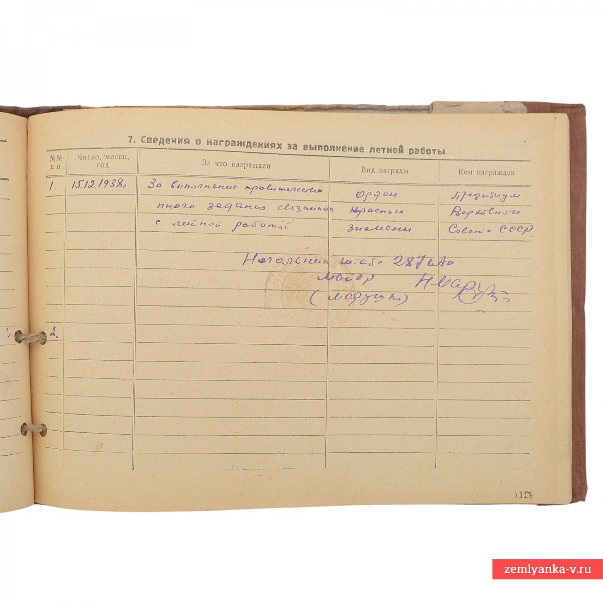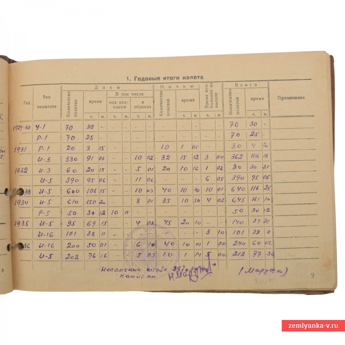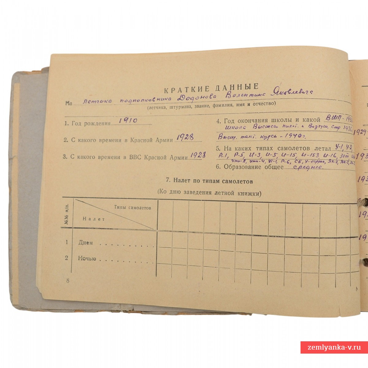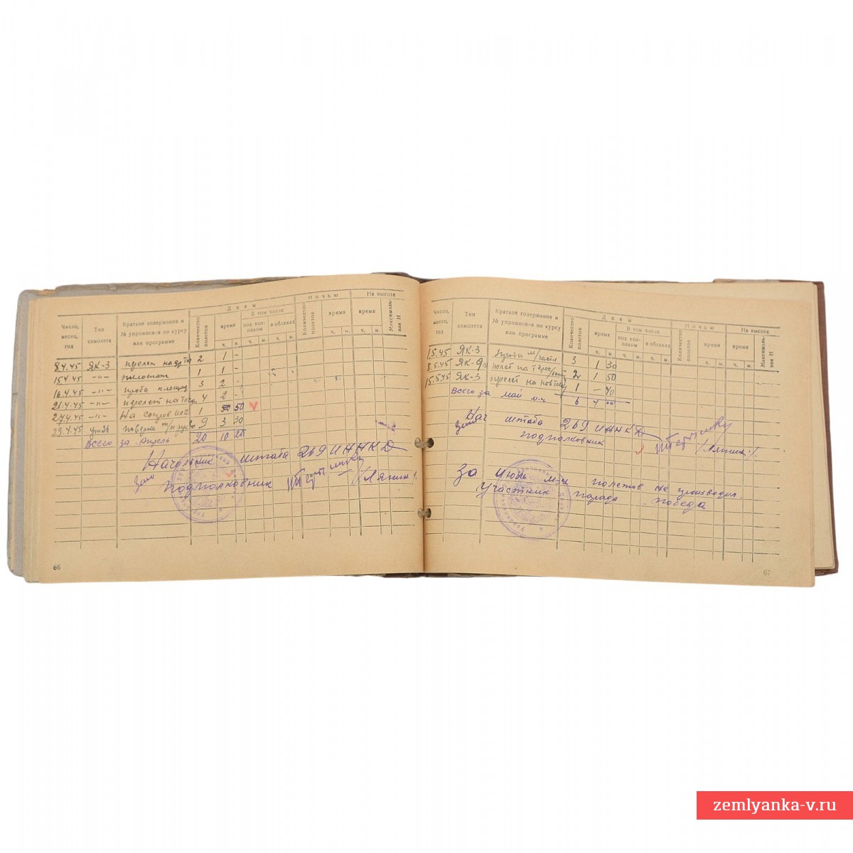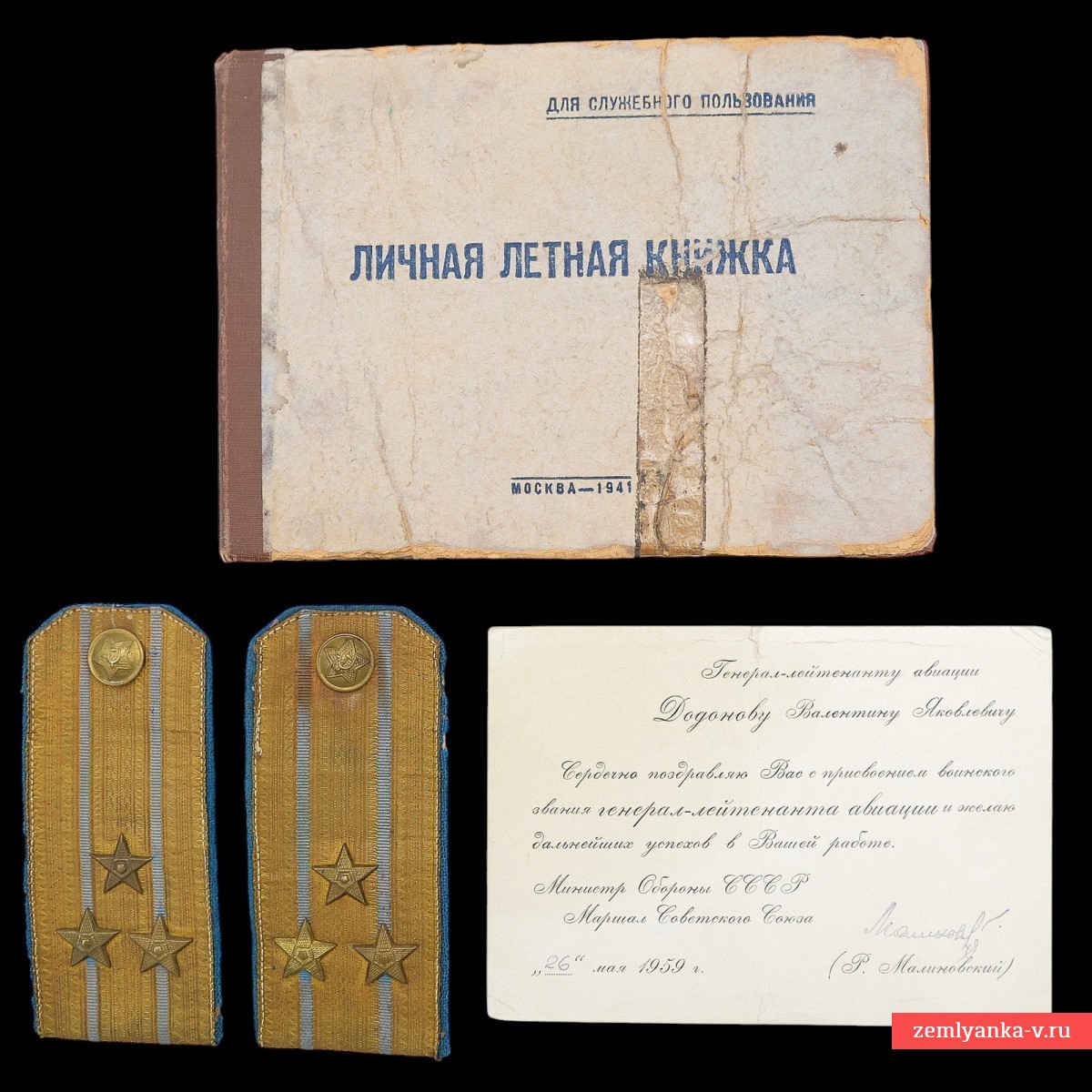 The lot includes a pair of shoulder straps of an Air Force colonel of the 1946 model (they belonged to him when he was commander of the 246th Fighter Division), a flight book in which both the pre-war flight hours and combat sorties during the Second World War are recorded, as well as a typographic congratulation on being awarded the rank of Lieutenant General of aviation with Marshal R. Malinovsky's handwritten autograph.. The price for the whole lot. Guarantee of authenticity.