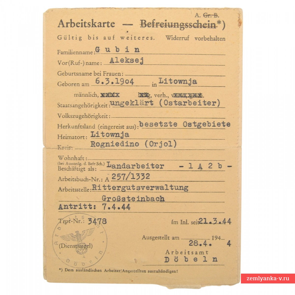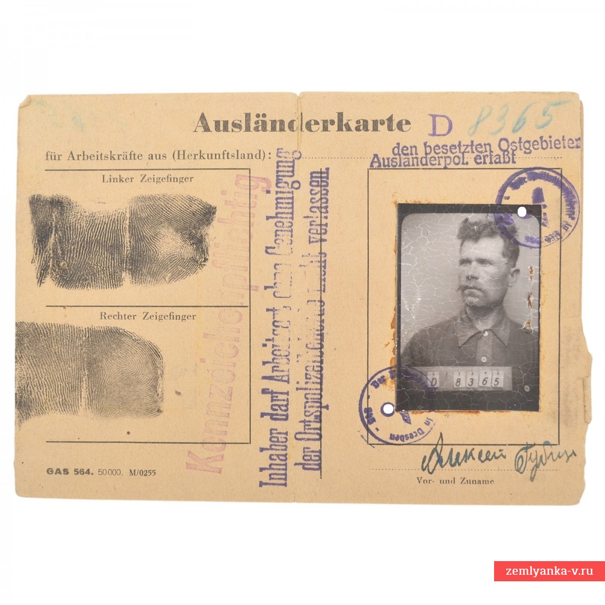 An original and rather rare document from the time of the Second World War, issued during the occupation in the name of Alexey Gubin. This is an official document of the German Police for Foreigners, which was used to register civilians who were abducted for forced labor in Germany. The Third Reich from the occupied eastern territories. The purpose of the document is to register personal data, including fingerprints (left and right index fingers), for the control and identification of forced laborers. Contains the stamp "den besetzten Ostgebieten" (from the occupied eastern territories) and a note that the owner does not have the right to leave the place of work without the permission of the local police. Guarantee of authenticity.