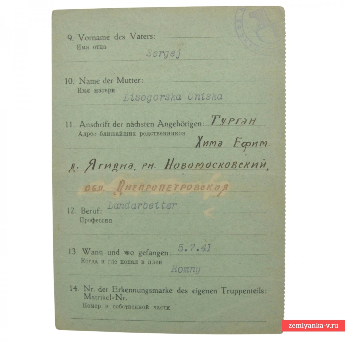 An original and rather rare document from the period of the Great Patriotic War, which was kept for each prisoner upon admission to the German camp. It was issued to Efim Turgan, a Red Army soldier of the 8th Sapper battalion, who was born on September 11, 1906 in Znamenka street. Stalag XIII C (Hammelburg), later transferred from Stalag XIII D (Nuremberg-Langwasser). Date of admission to the camp: April 5, 1943. The camp room: 110234. Guarantee of authenticity.