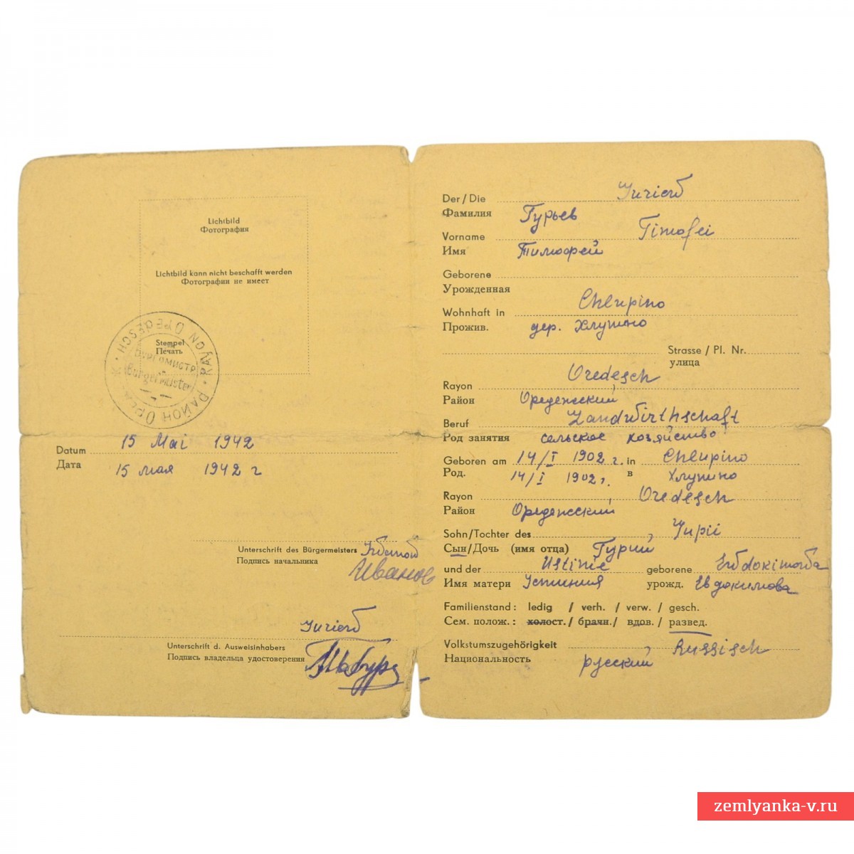The original German occupation identity card, issued in May 1942 on the territory of the temporarily occupied Oredezhsky district of the Leningrad region. The document contains the owner's personal data, filled in in German and Russian. Owner: Yuryev Timofei, born on May 14, 1908, village of Chlupino. Occupation: agriculture (Landwirtschaft). In the column for the photo there is a note that "the photo cannot be submitted" (Lichtbild kann nicht beschafft werden). The document is signed by the chief (burgomaster) Ivanov and the seal of the local administration (Rayon Oredesch). Such certificates (Ausweis) were mandatory for the civilian population in the occupied territories of the USSR during the Great Patriotic War to control movement and record labor resources. Guarantee of authenticity.