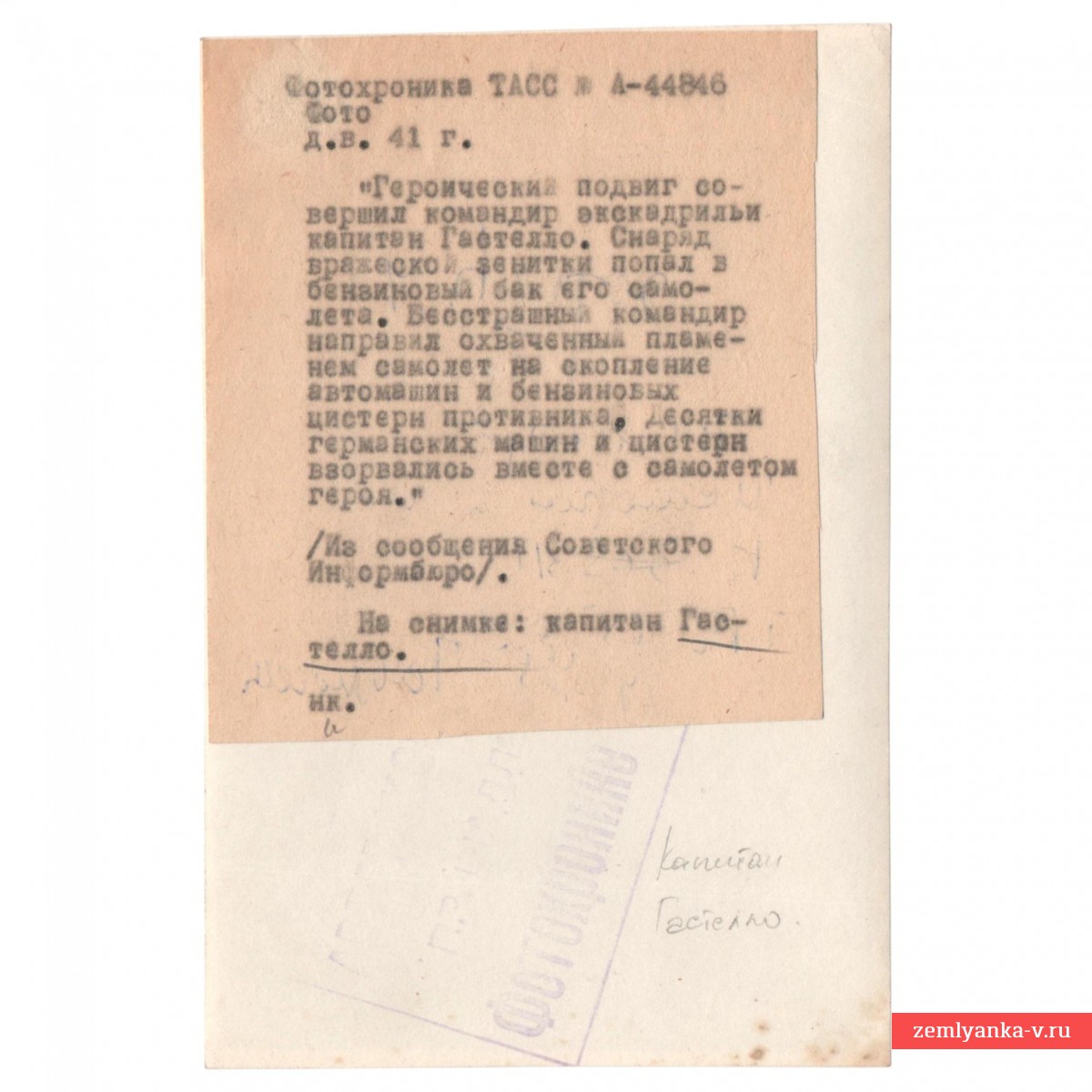 Nikolai Frantsevich Gastello (April 23 [May 6] 1907, Moscow, Russian Empire — June 26, 1941, Molodechno district, Vileisk region, BSSR, USSR) was a Soviet military pilot, participant in three wars, at the time of his death he served as commander of the 2nd squadron of the 207th long-range bomber Aviation Regiment of the 42nd long-range Bomber Aviation divisions of the 3rd Long-range Bomber Aviation Corps of the Red Army Air Force Long-range Bomber Aviation with the rank of captain. He died during a combat mission. Hero of the Soviet Union, posthumously.