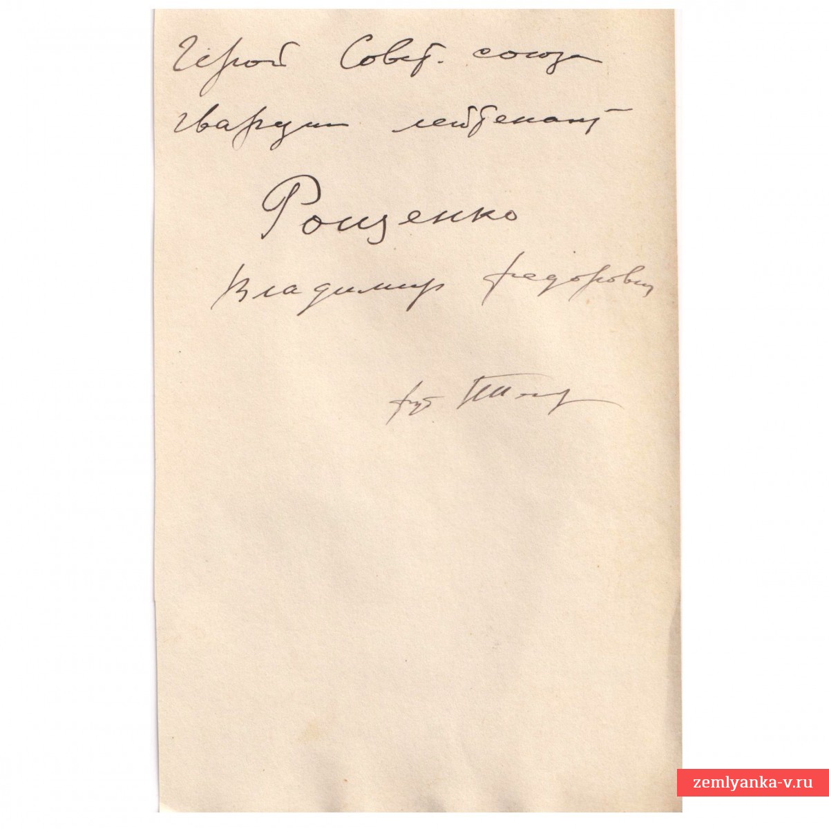 By decree of the Presidium of the Supreme Soviet of the USSR dated July 27, 1943, for "exemplary performance of combat missions of the command at the front of the struggle against the German invaders and the courage and heroism shown at the same time", Guard Senior Lieutenant Vladimir Roschenko was awarded the high title Hero of the Soviet Union with the award of the Order of Lenin and the Gold Star medal number 1056.