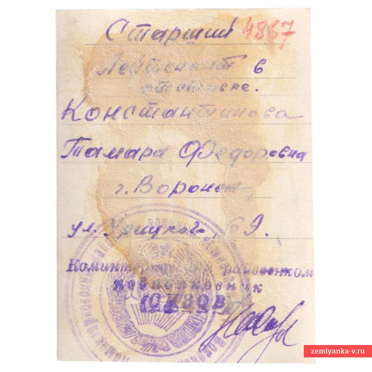 After the war, Senior Lieutenant Konstantinova was discharged into the reserve. She worked as a pilot in Civil Aviation. After an emergency landing, she suffered serious injuries and was declared unfit for flight work. She joined the factory and was a foreman. Then she was elected chairman of the factory committee of the trade union. In 1949, she joined the Communist Party. In 1954, she entered evening school, then the Voronezh Higher Regional Party School. After graduation, Konstantinova was appointed deputy head of the Voronezh Department of Social Security. To work successfully at her new place, she had to enroll in the correspondence department of the Moscow Institute of Economics and Statistics, from which she successfully graduated in 1965. While living in Voronezh, Tamara Fyodorovna carried out a lot of public and military-patriotic work. She died on July 28, 1999. She was buried at the Komintern cemetery.